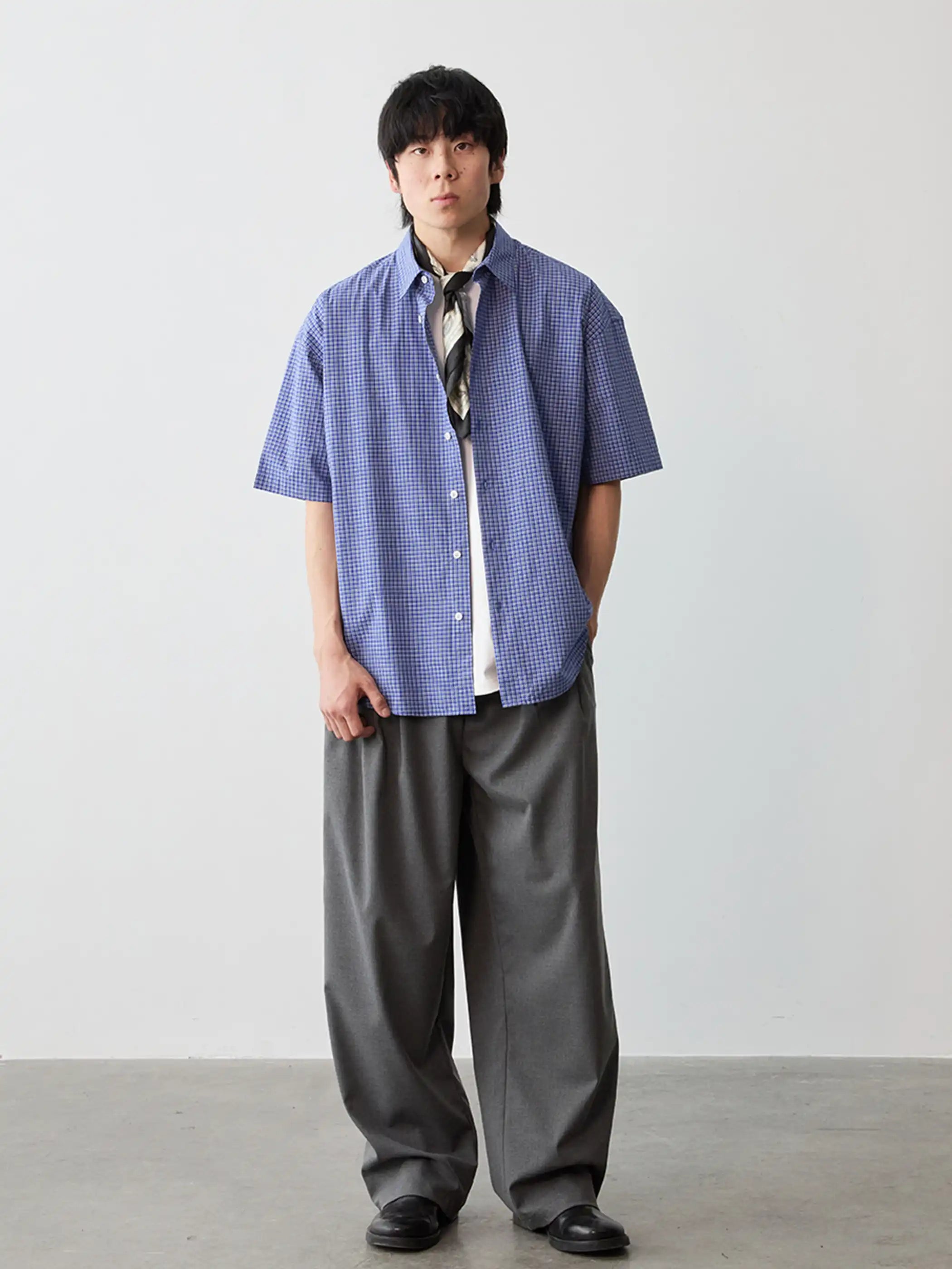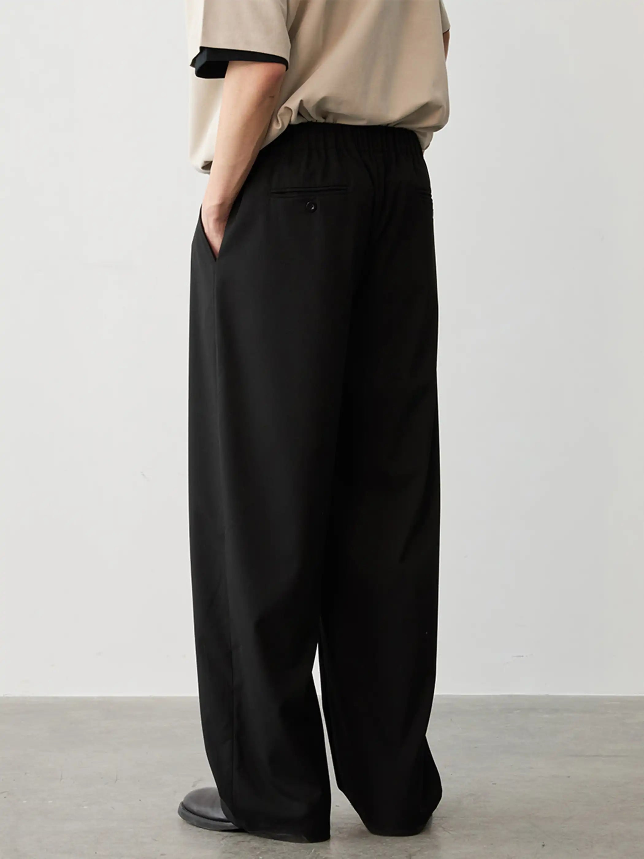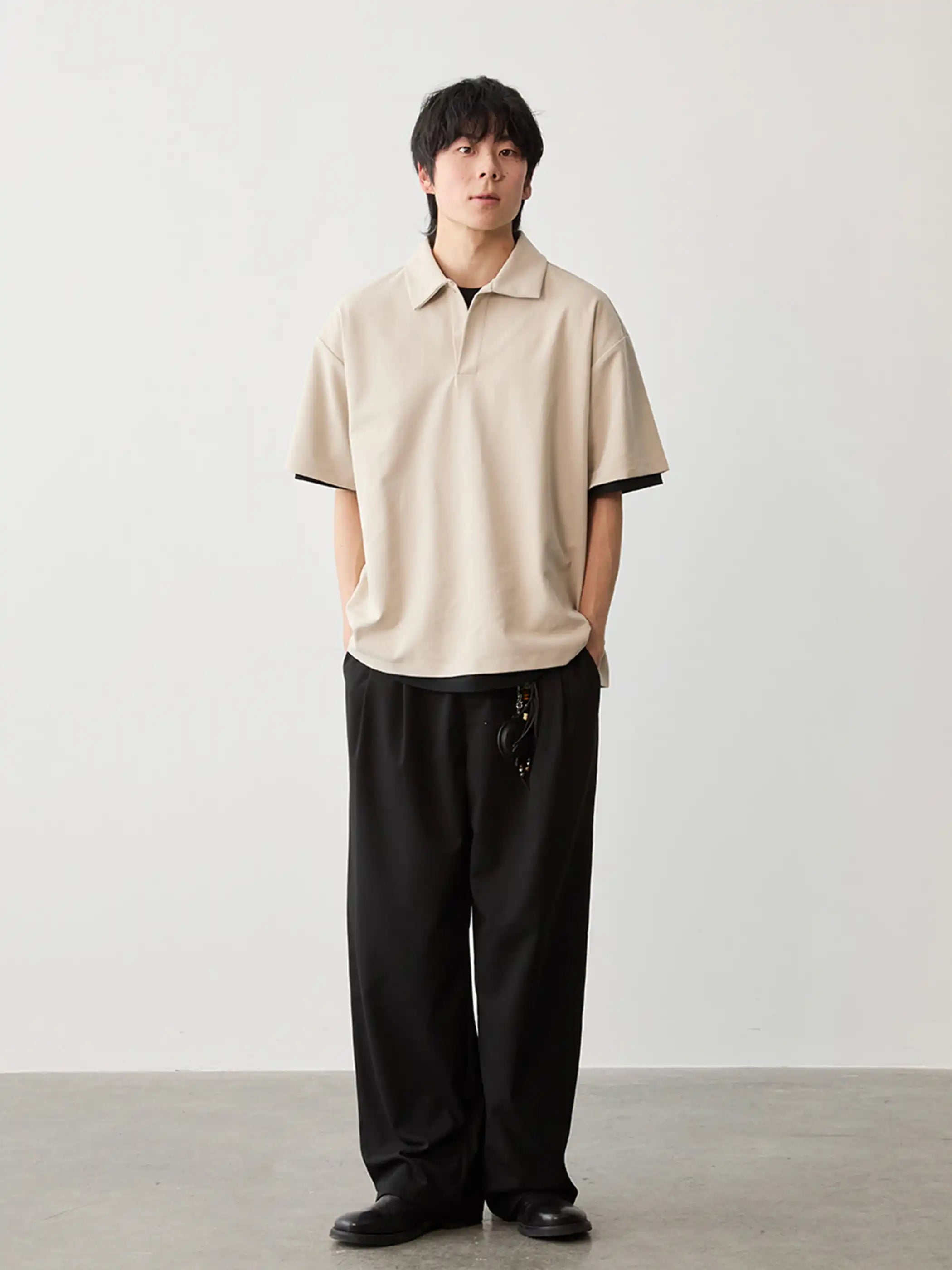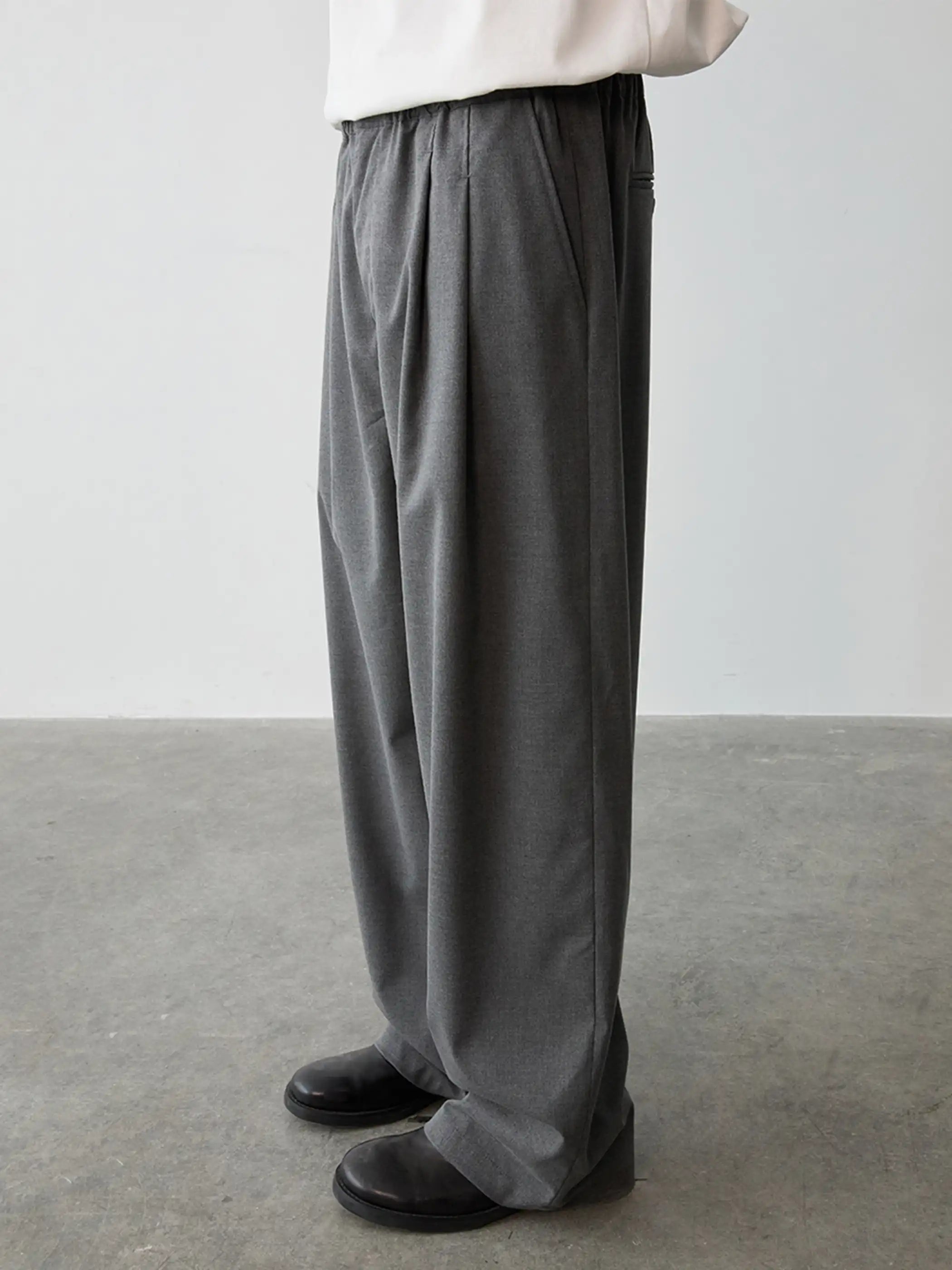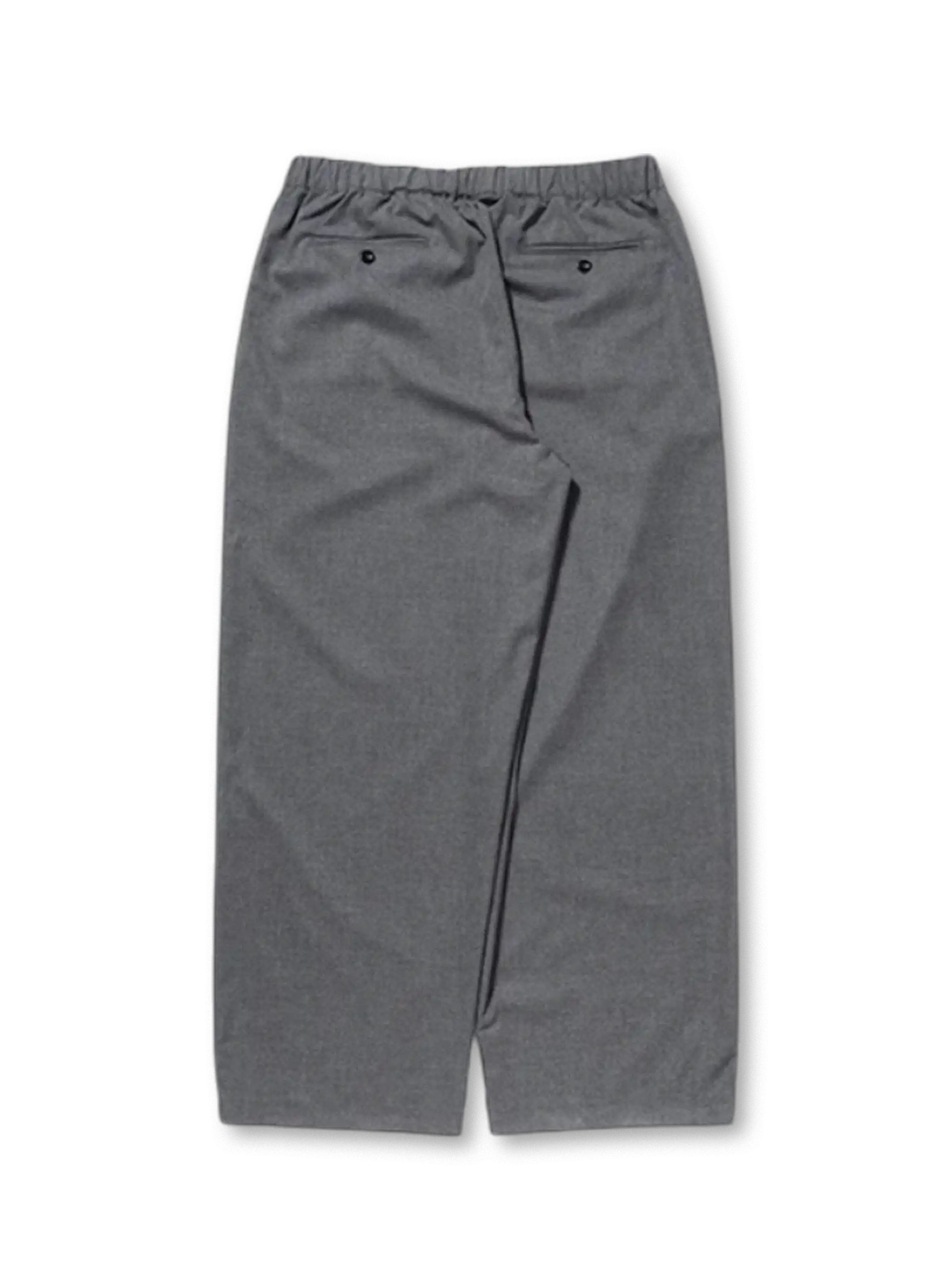 ウエストはゴムと内側のドローコードにより、スムーズな着脱と適度なフィット感を調整可能。フロントにダブルプリーツを入れ、斜めポケットを配置することで、デザイン性と利便性を両立しました。ポリエステル100%の生地は抗シワ性と落ち感に優れ、年間を通じて快適に着用できるのが特徴。脚幅にゆとりを持たせたワイドシルエットながら、縫製の丁寧さと前後のラインがすっきりとした印象をキープし、通勤スタイルからオフタイムまで幅広く活躍するアイテムです。