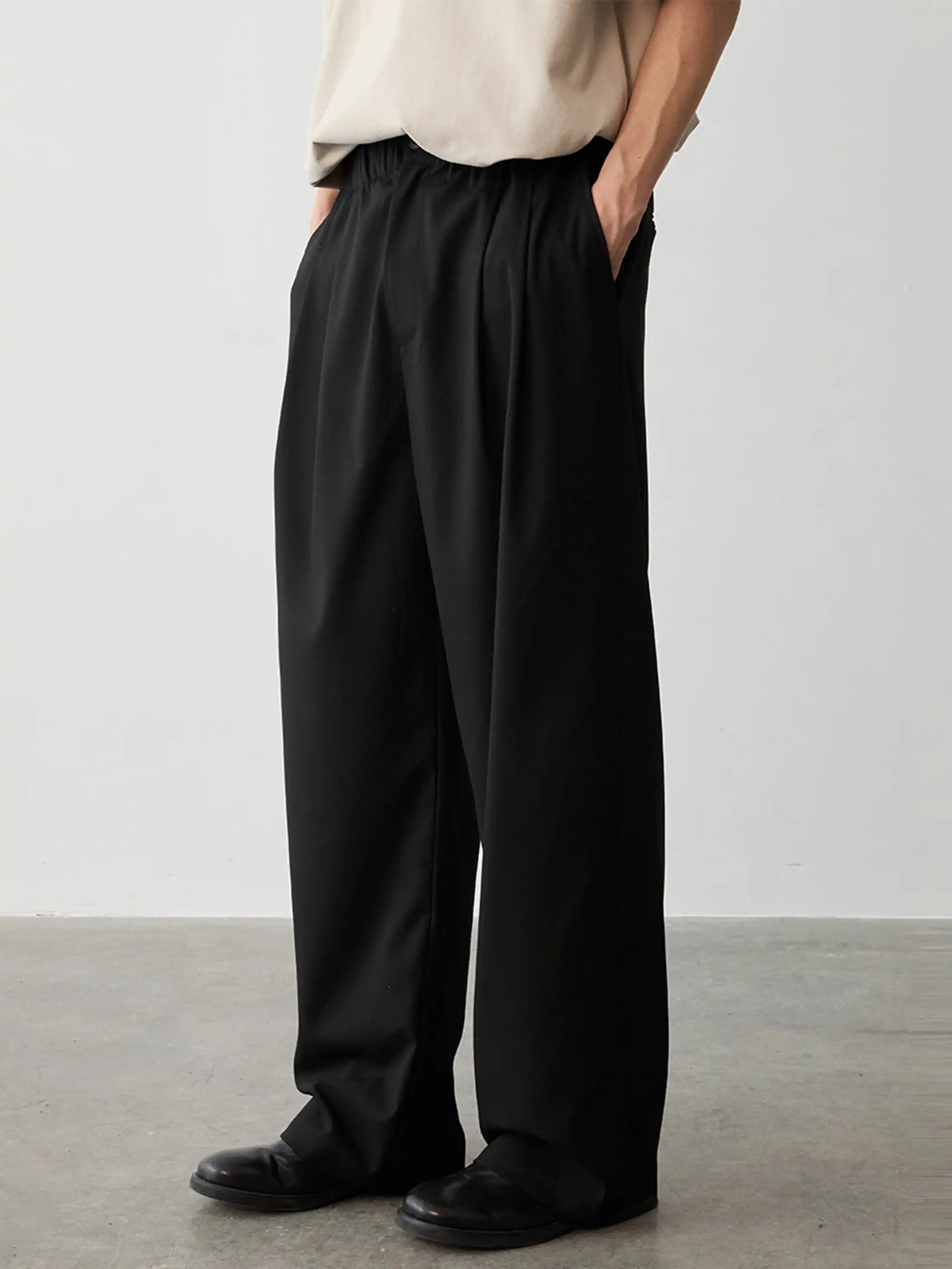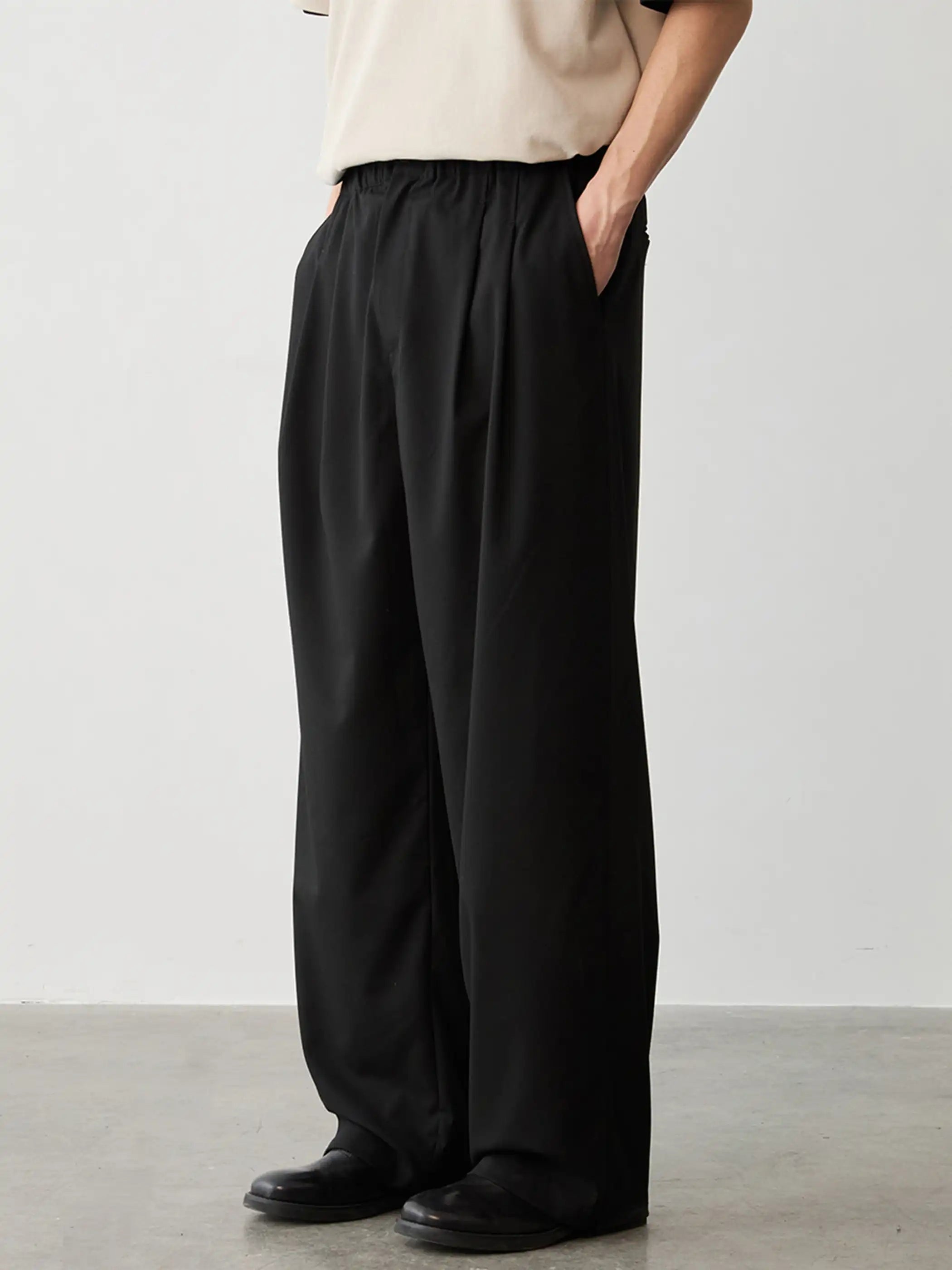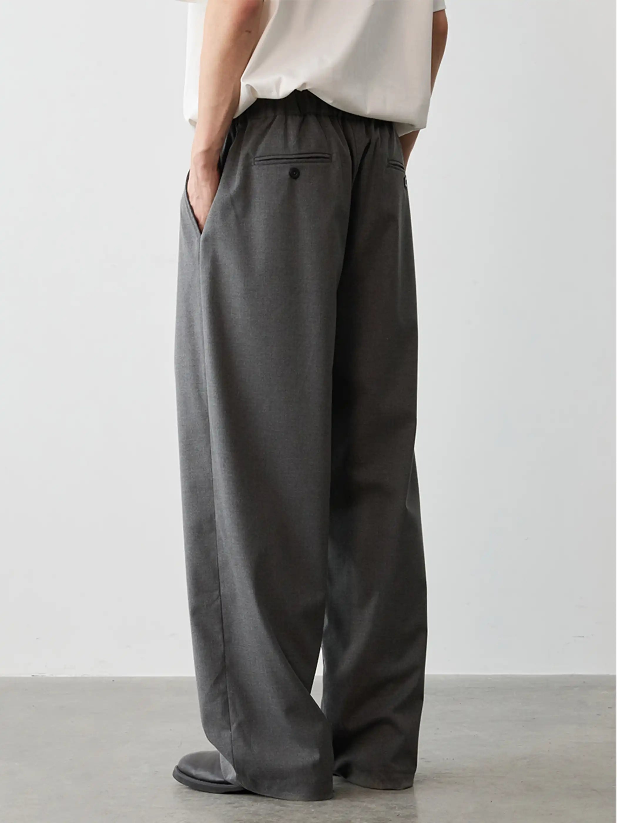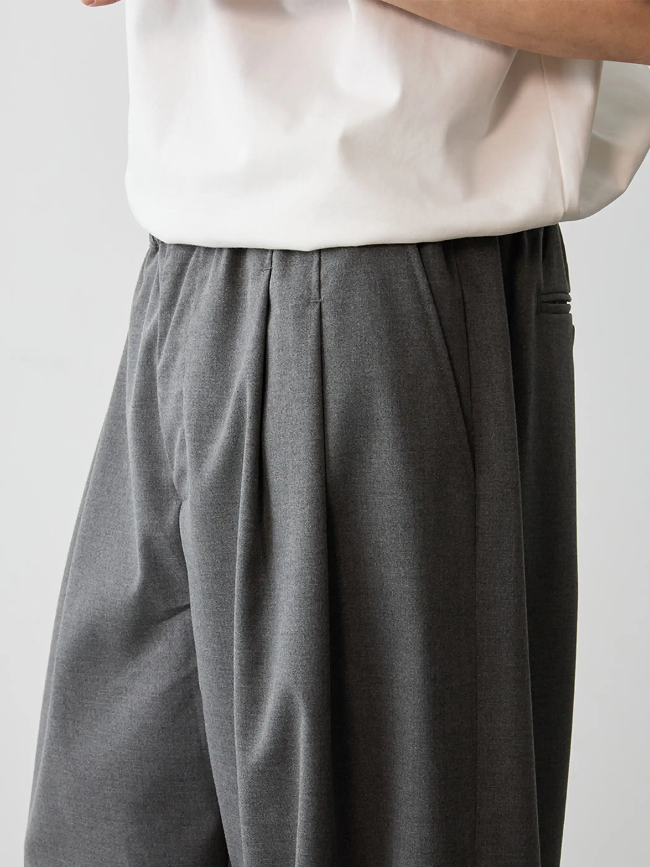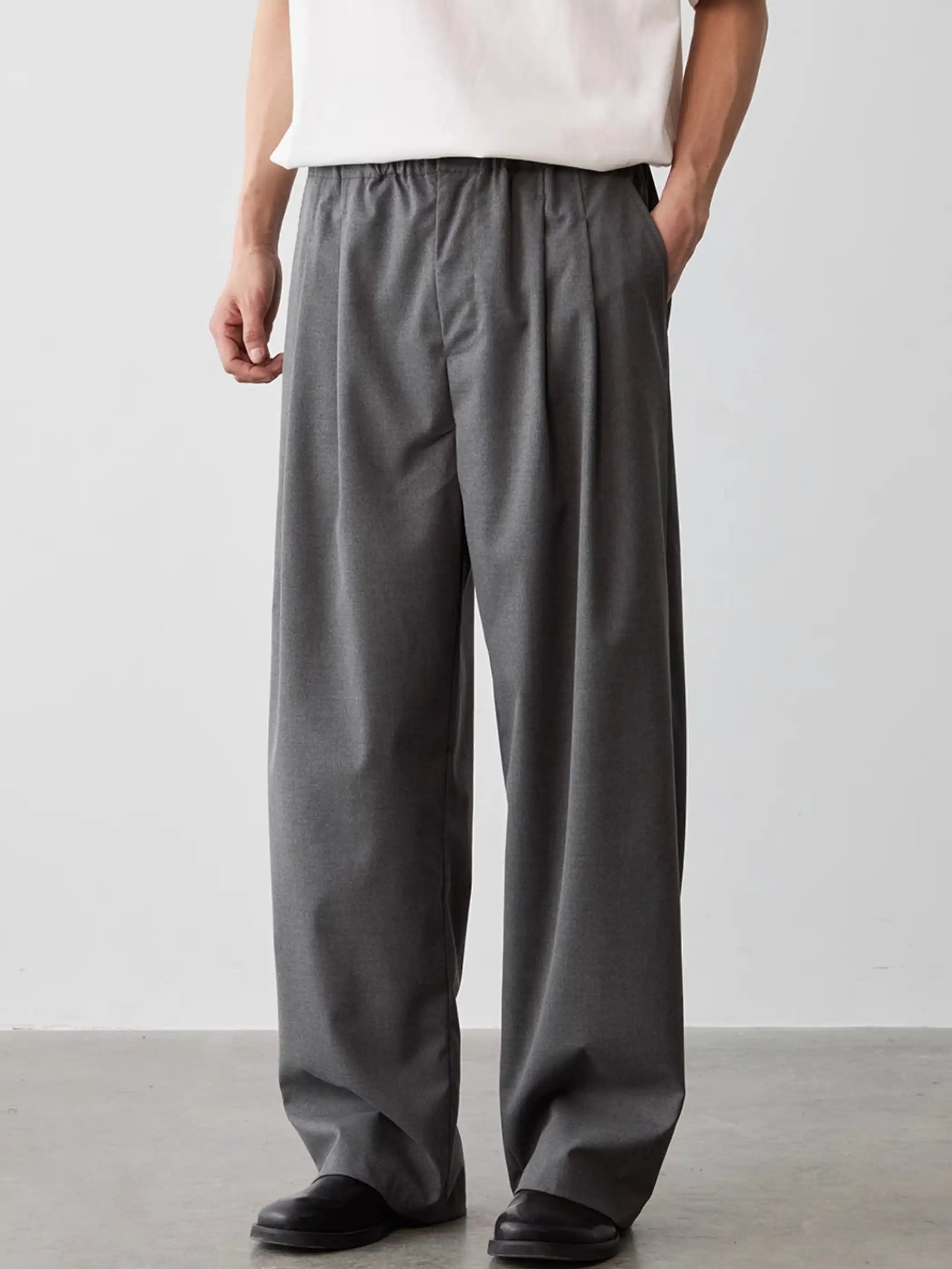 このダブルプリーツスラックスは、ウエストゴムとドローコードが快適さを高めつつ、上品なドレープと抗シワ性を兼ね備えた、通勤からカジュアルまで使える万能パンツです。