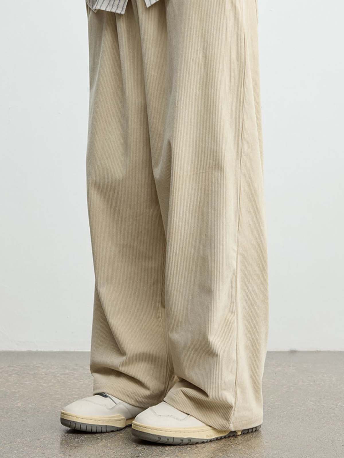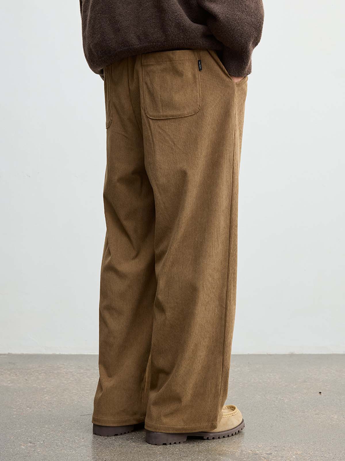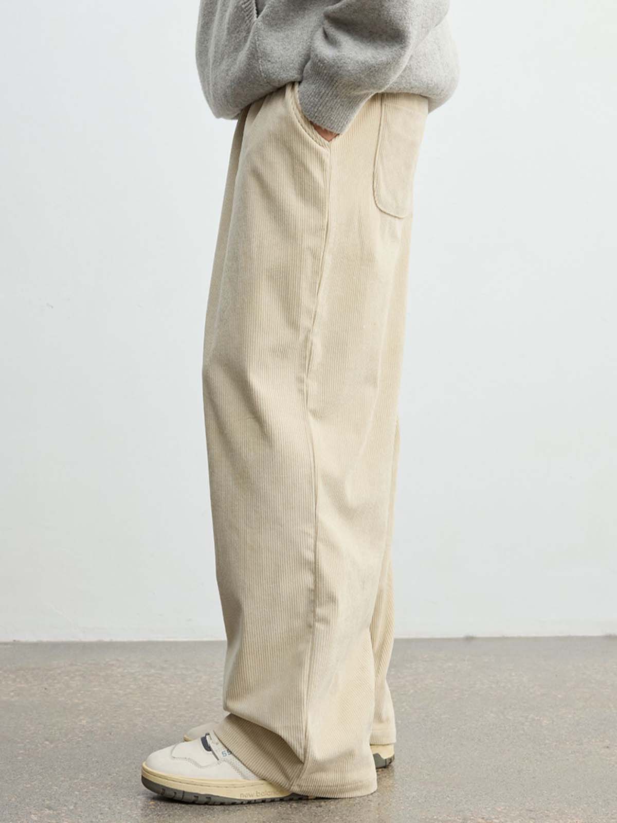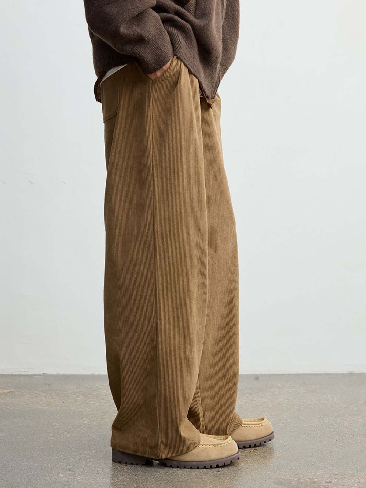 ヴィンテージコーデュロイデザインのパンツ、ゴムウエストで着脱が簡単、ゆったりとしたストレートシルエットでリラックスしたカジュアルスタイルを実現。