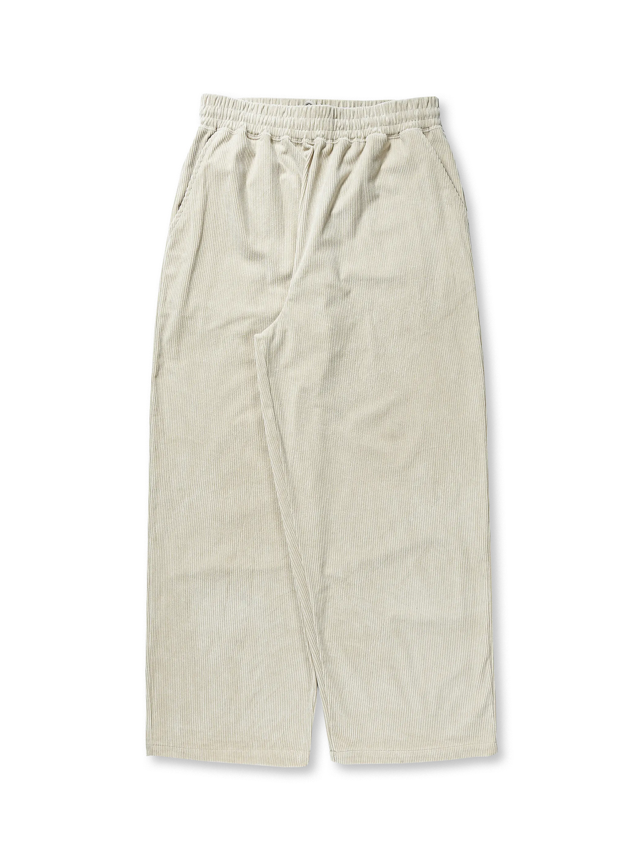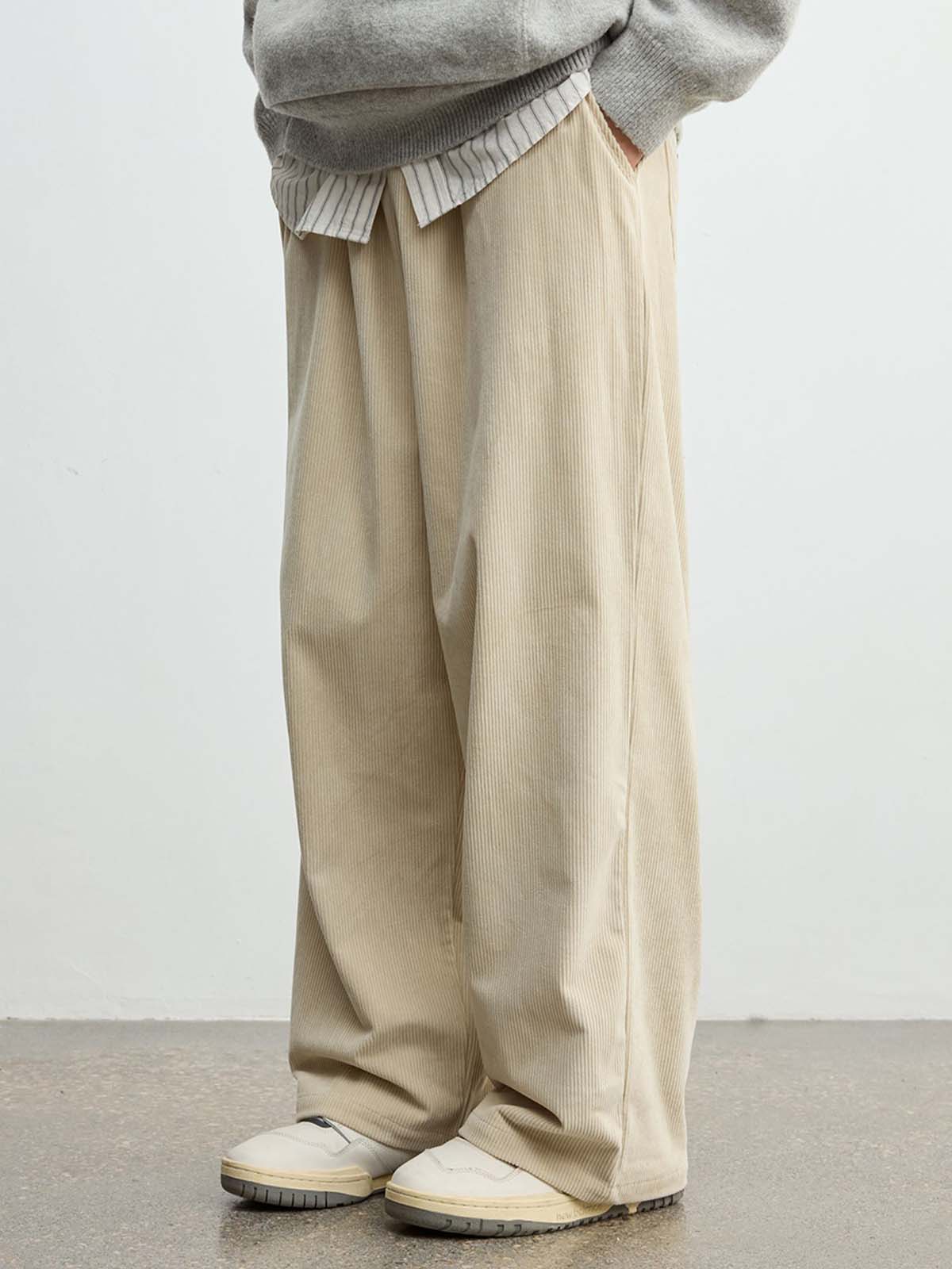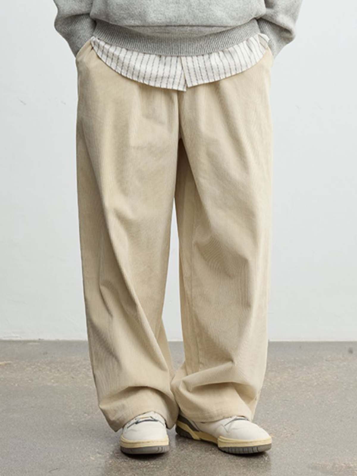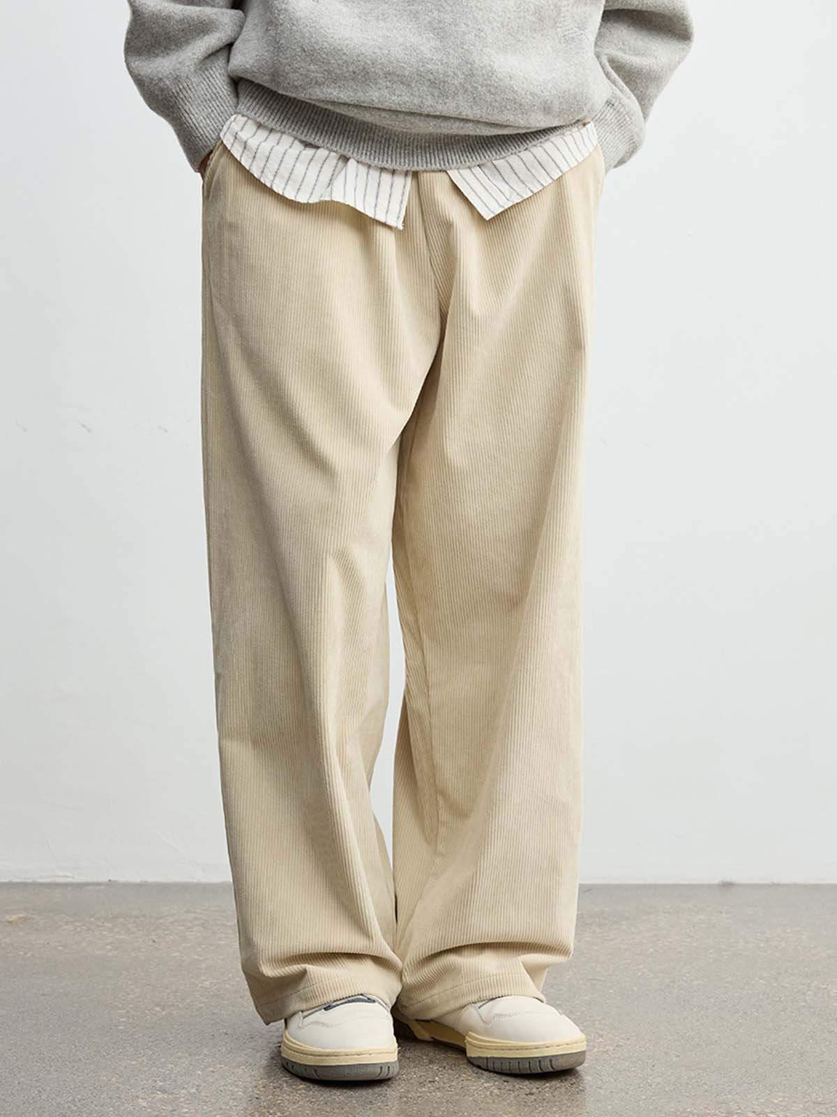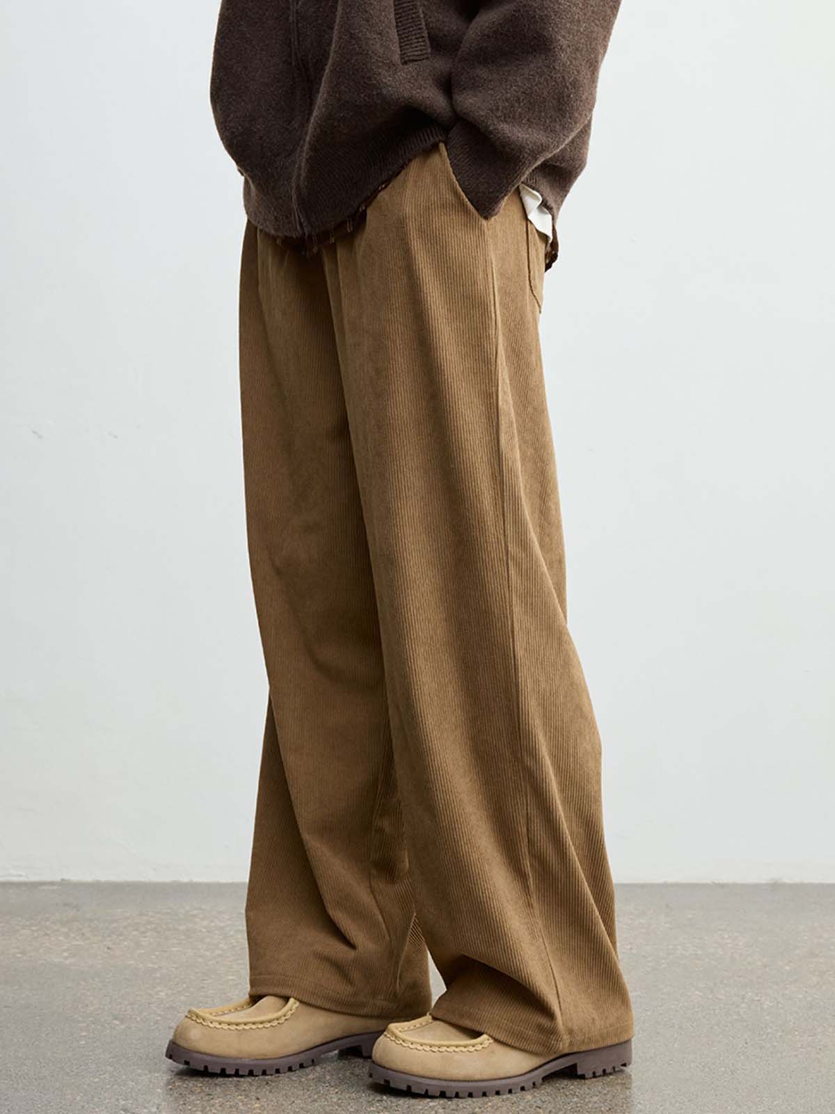 ヴィンテージコーデュロイデザインのパンツ、ゴムウエストで着脱が簡単、ゆったりとしたストレートシルエットでリラックスしたカジュアルスタイルを実現。