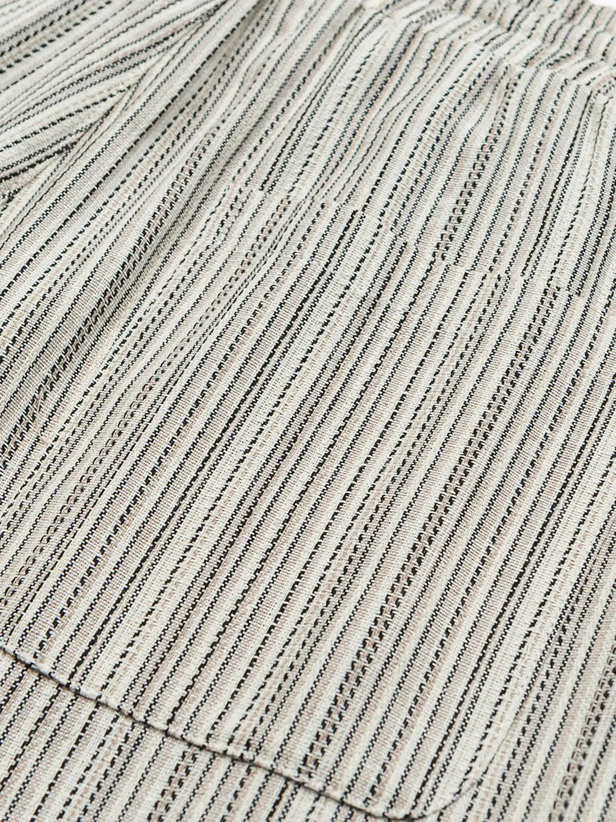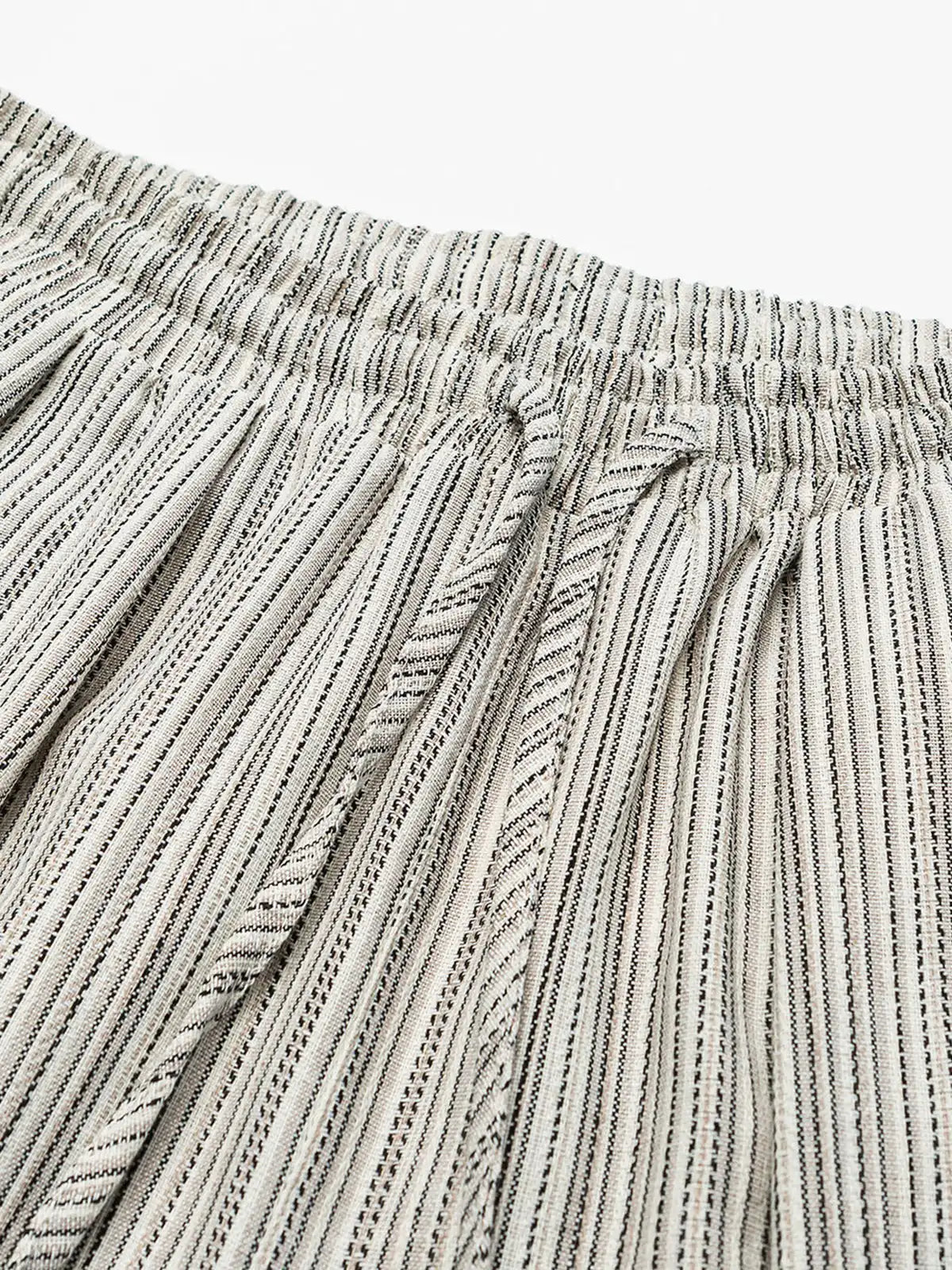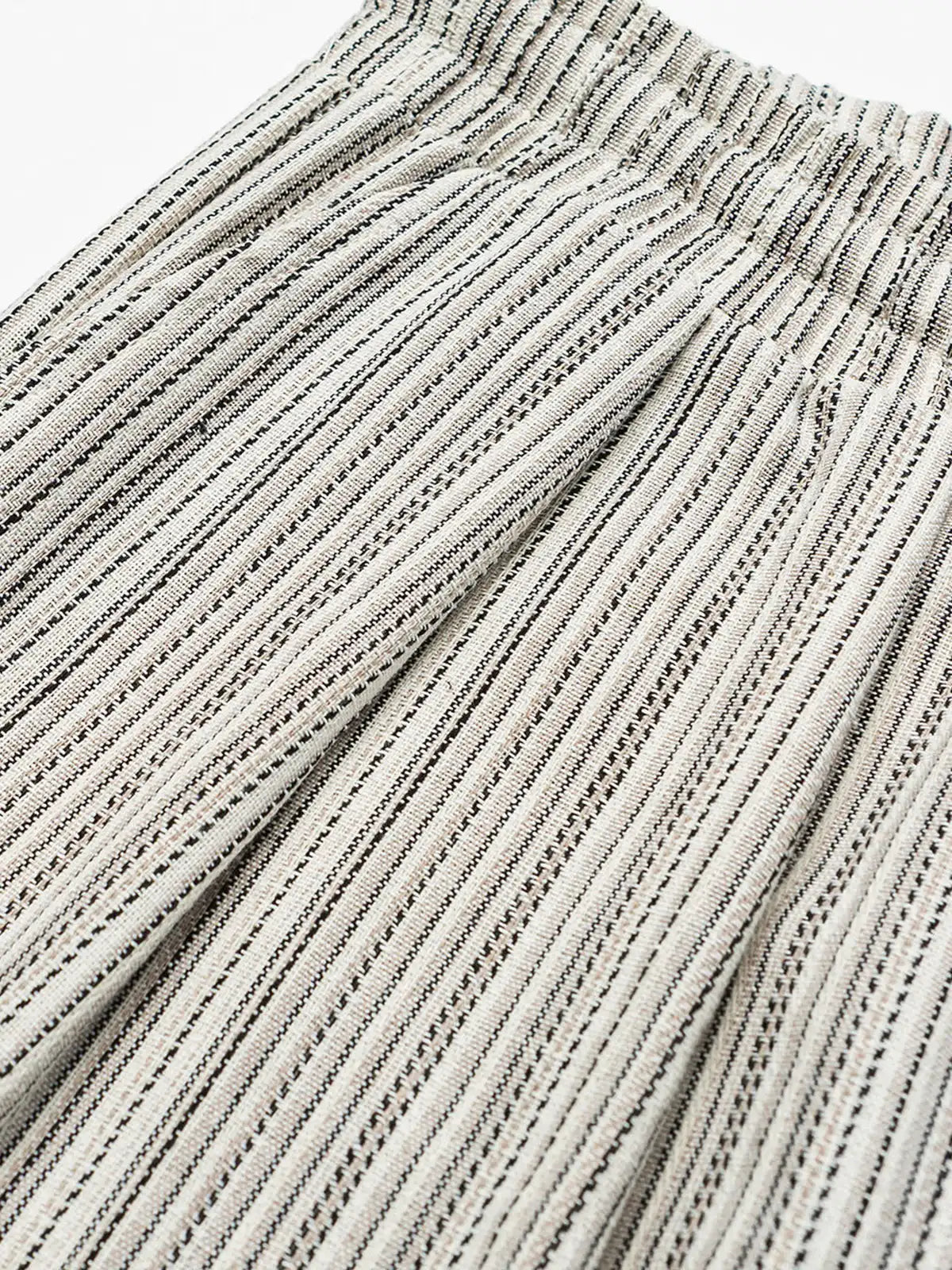 リネン混紡のナチュラルなざらつきとコットンの柔らかさ、ポリエステルの耐久性を併せ持つミッドウェイト生地は、通気性と快適なドレープ感を両立。ウエストはゴム+ドローコードで自在にフィットし、縦ストライプが視覚的に脚をすらりと長く見せます。ワイドストレートのリラックスシルエットが動きやすく、夏のカジュアルスタイルにぴったりです。