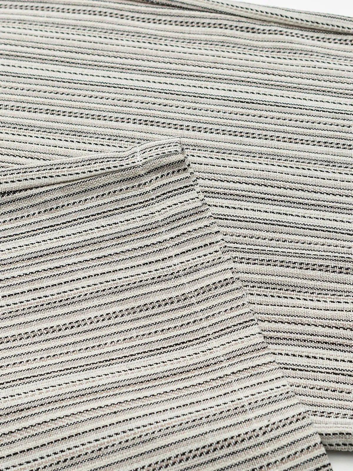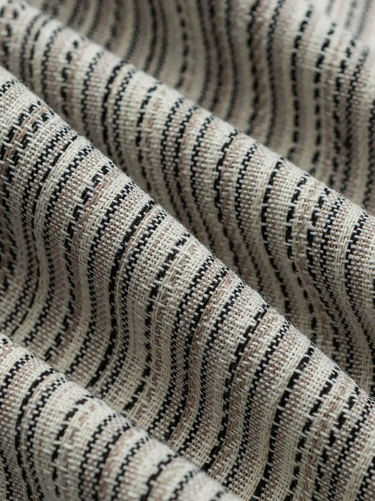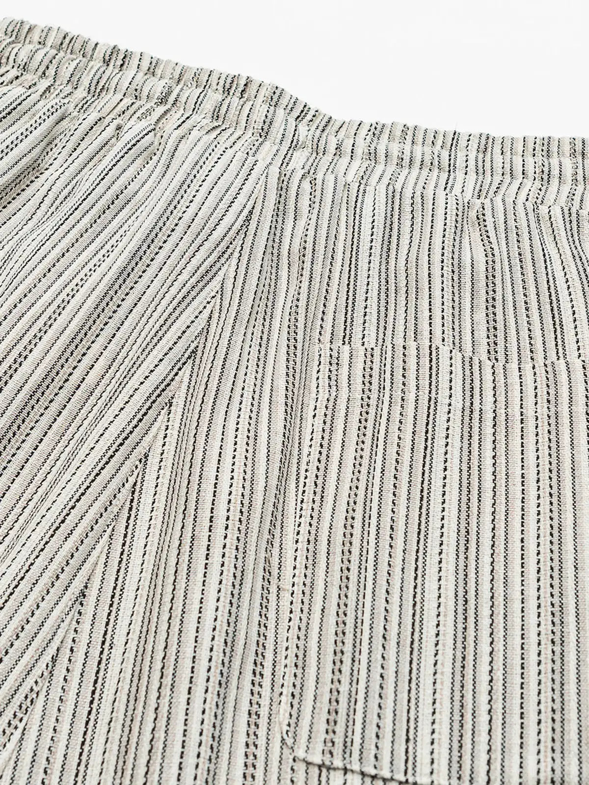 リネン混紡のナチュラルなざらつきとコットンの柔らかさ、ポリエステルの耐久性を併せ持つミッドウェイト生地は、通気性と快適なドレープ感を両立。ウエストはゴム+ドローコードで自在にフィットし、縦ストライプが視覚的に脚をすらりと長く見せます。ワイドストレートのリラックスシルエットが動きやすく、夏のカジュアルスタイルにぴったりです。