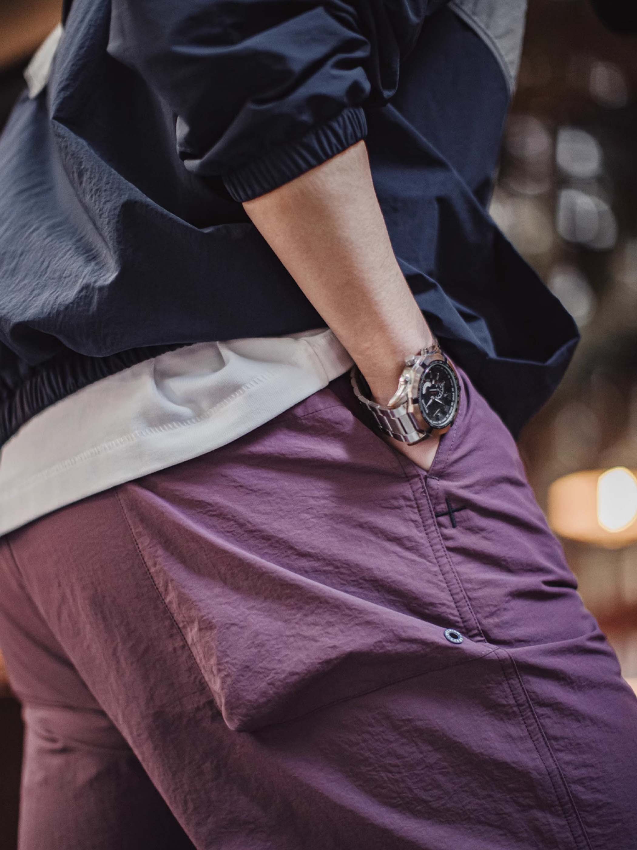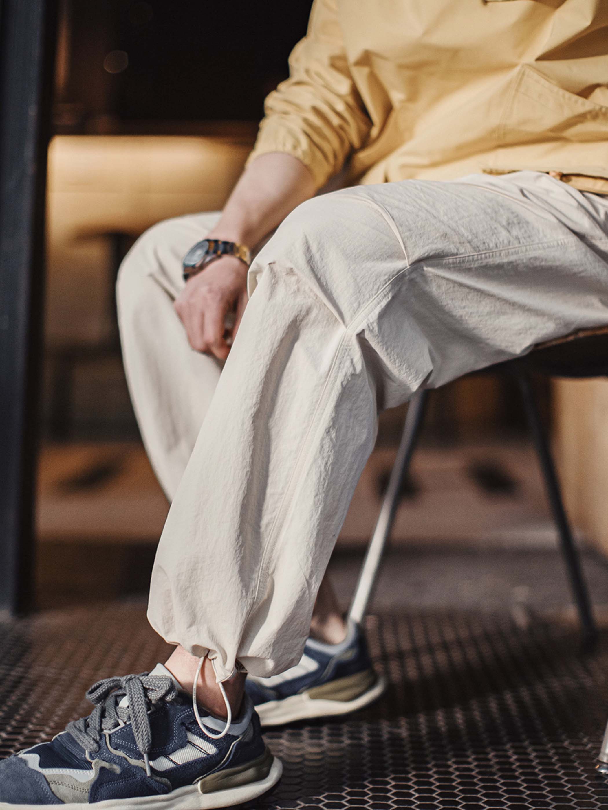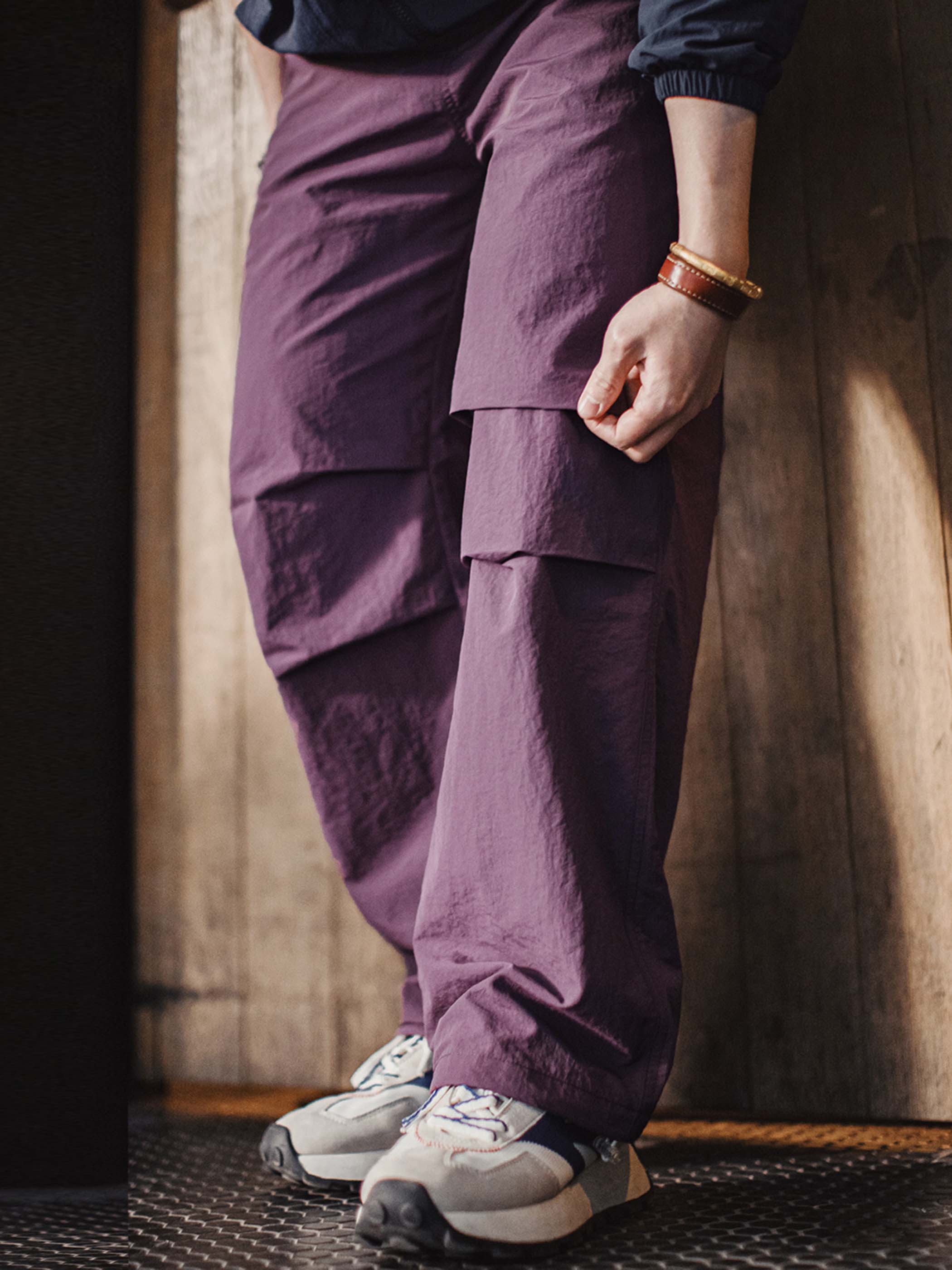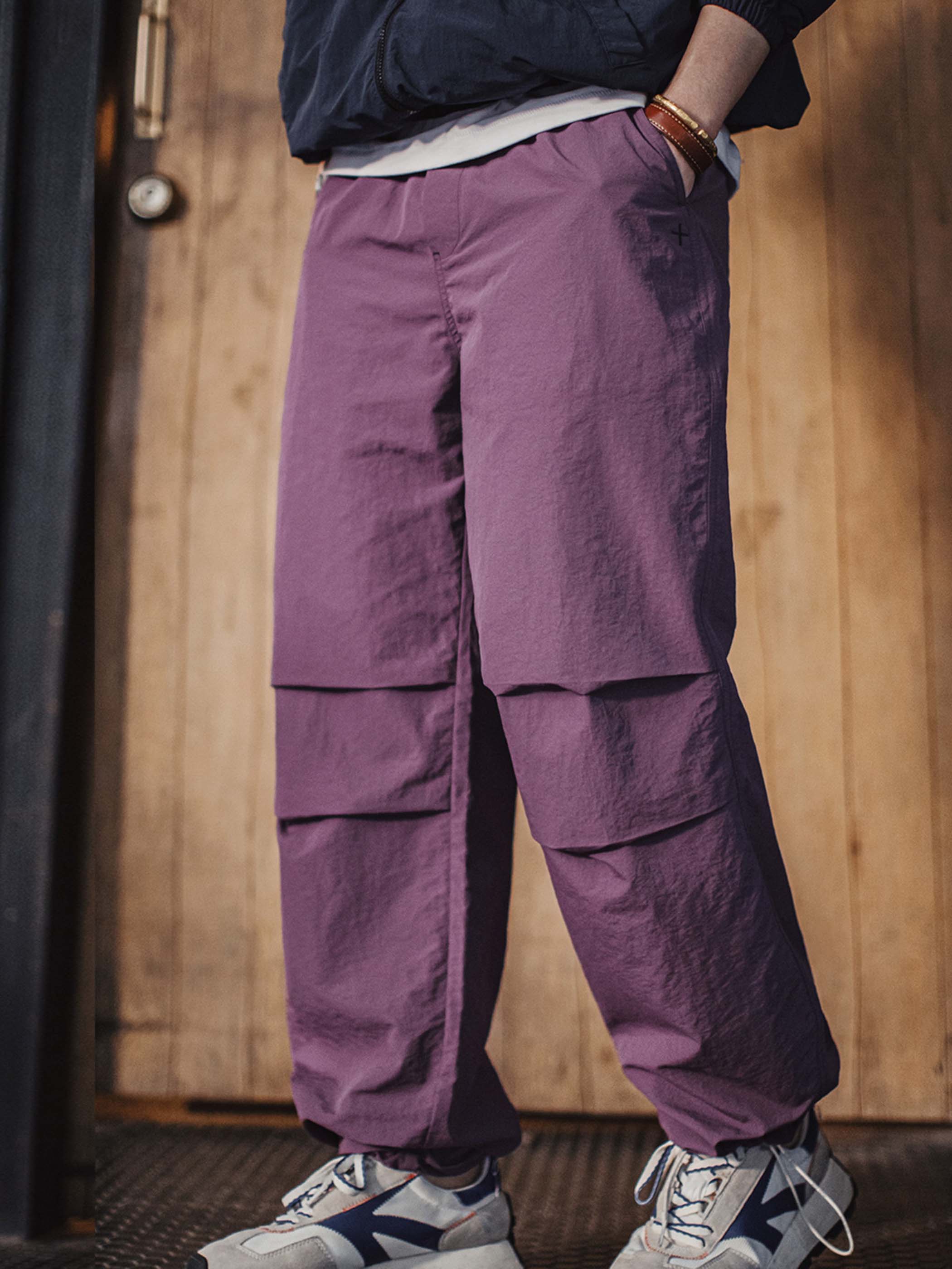 このパンツは、1940年代のアメリカ陸軍空挺部隊のパンツ、特にM51ミリタリーパンツの要素をアップデートして取り入れたデザインが特徴です。膝部分のタックデザインにより、立体感を演出しながら脚にまとわりつかない、すっきりとしたシルエットを実現。裾にはドローコードが付いており、ストレートシルエットとジョガースタイルの2WAYな着こなしが楽しめます。ウエストはワイドなゴム仕様で、締め付けを軽減し、快適なフィット感を提供。さらに、片側には立体的なポケットが配置され、フロントポケットはクロスステッチとパンチングデザインで、ヴィンテージミリタリーの雰囲気を強調。軽量ナイロン素材に、ヴィンテージワッシャー加工が施され、自然なシワ感と経年変化を楽しめるとともに、耐摩耗性と通気性にも優れ、アウトドアからストリートファッションまで幅広いスタイルに対応します。
