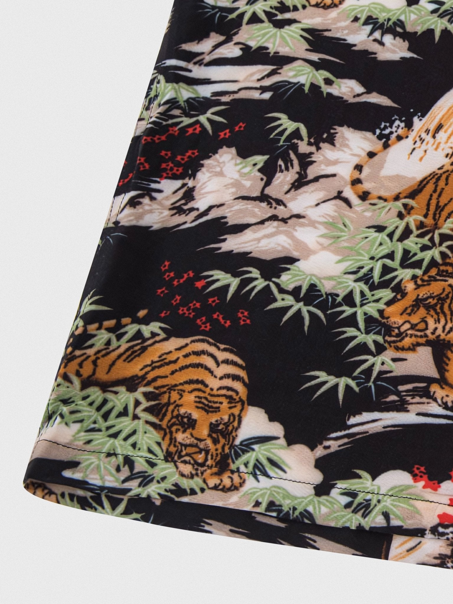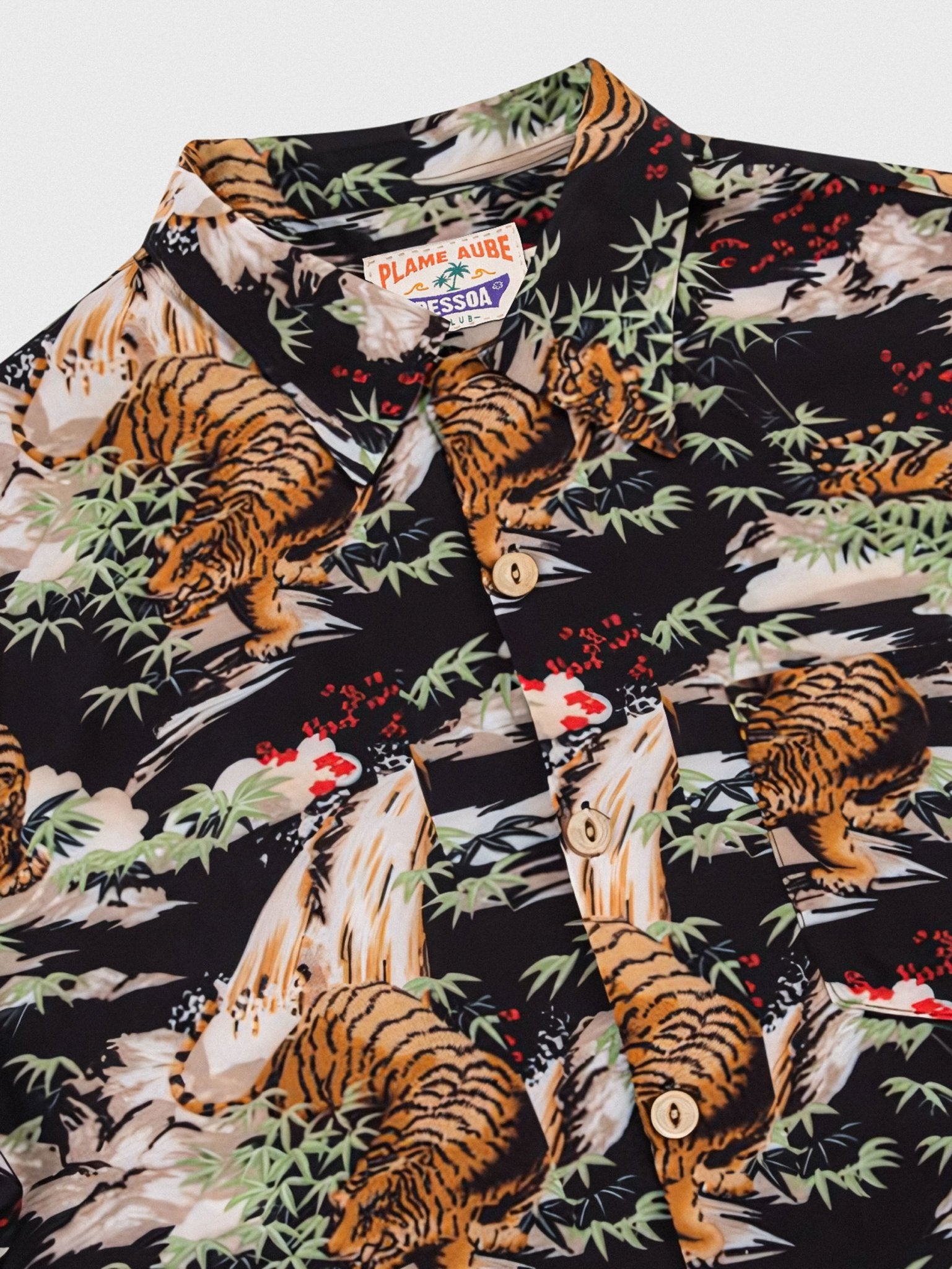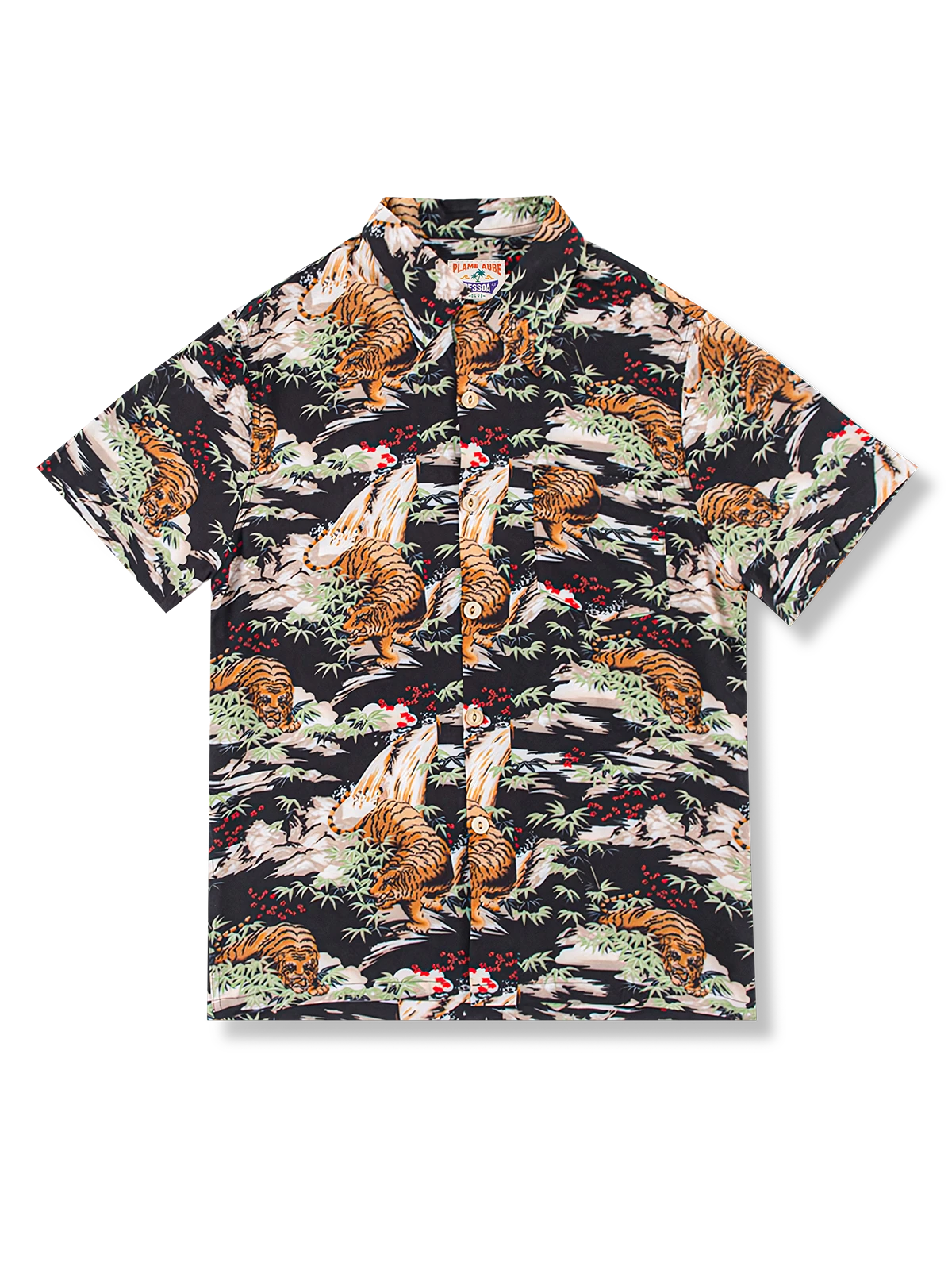 このハワイアンシャツは、黒をベースカラーにして、安定感のある印象を与えます。同時に、岩の背景に虎の模様をプリントすることで、よりユニークな魅力が表現されています。