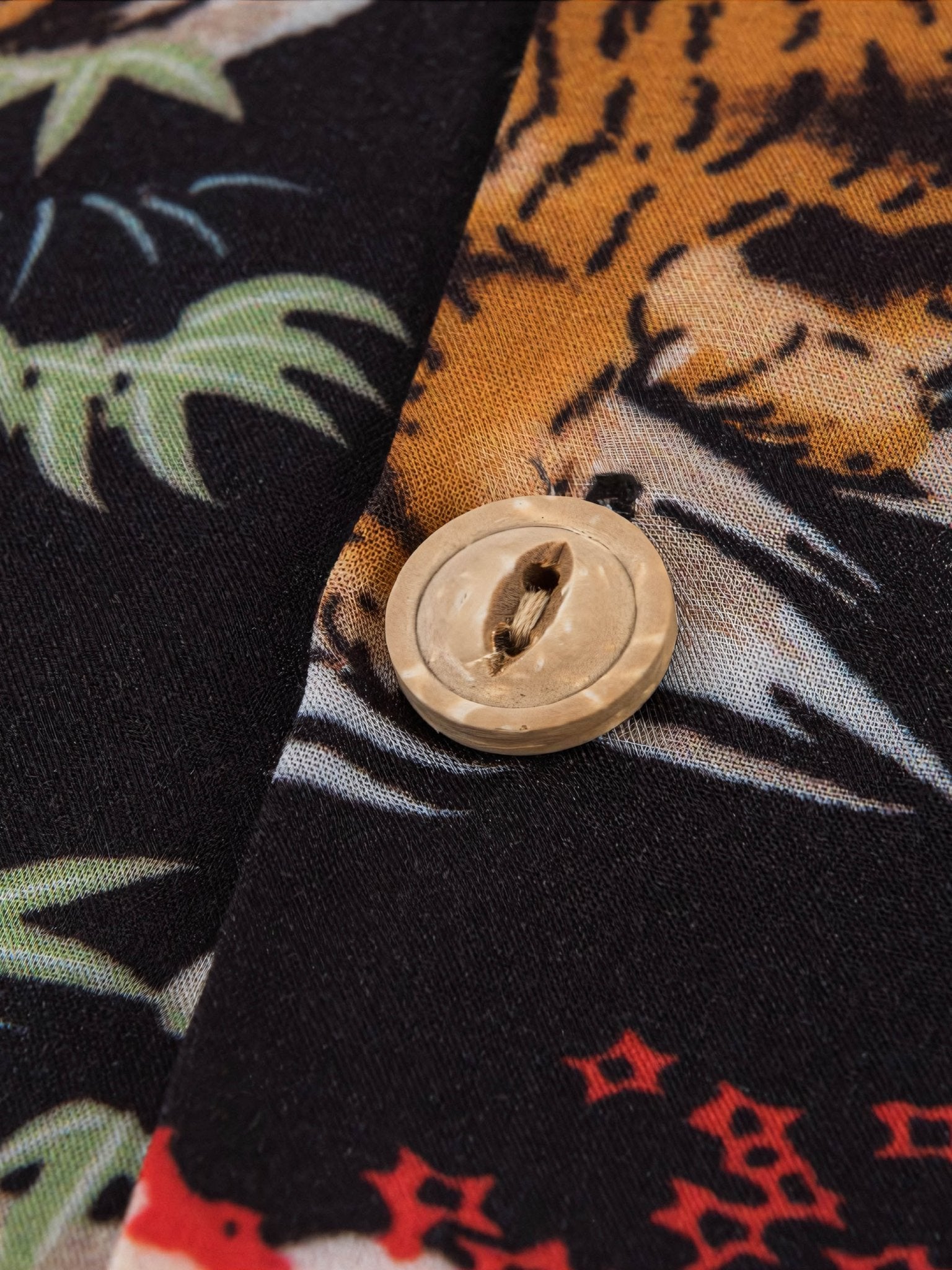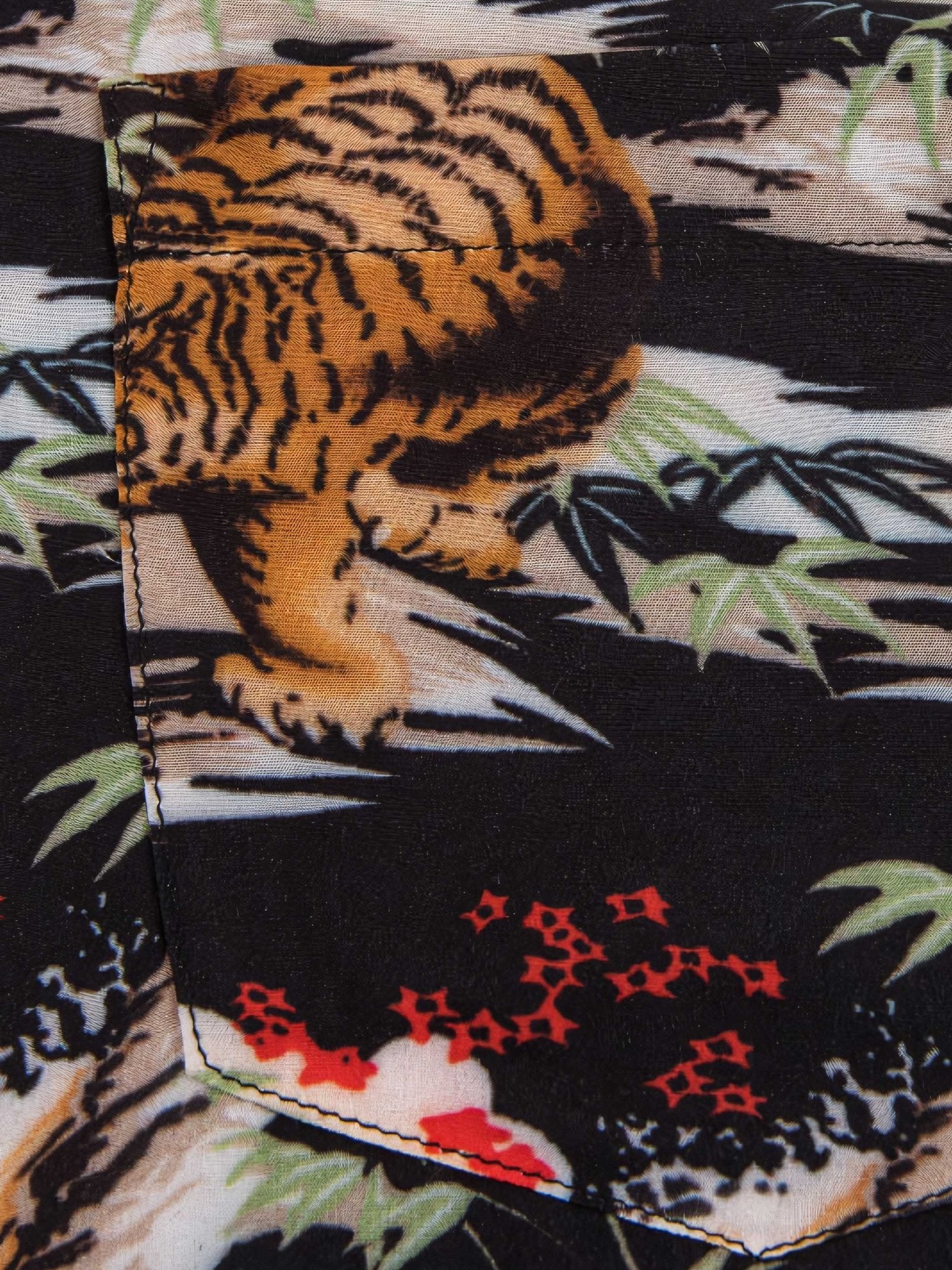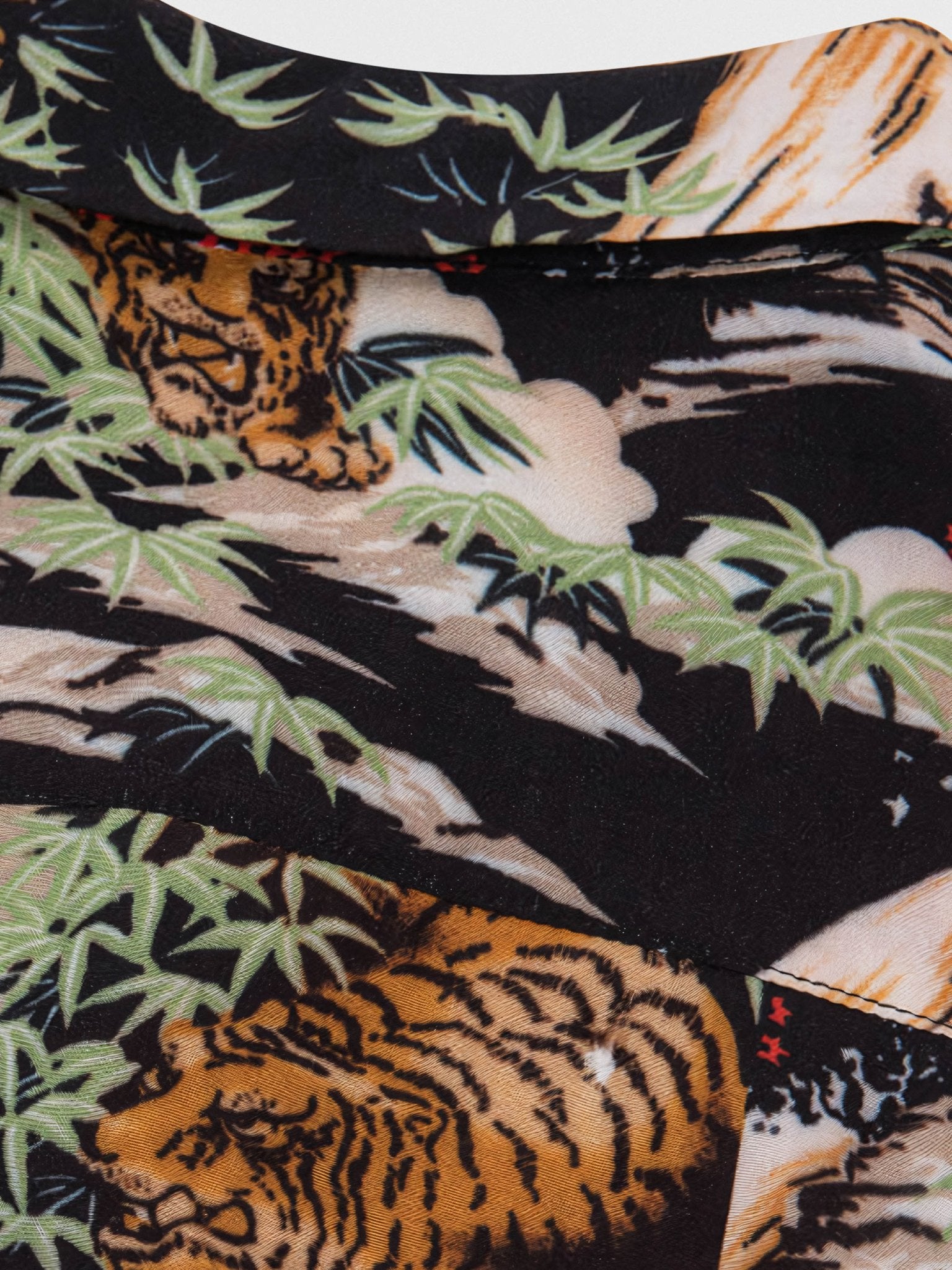 このハワイアンシャツは、黒をベースカラーにして、安定感のある印象を与えます。同時に、岩の背景に虎の模様をプリントすることで、よりユニークな魅力が表現されています。