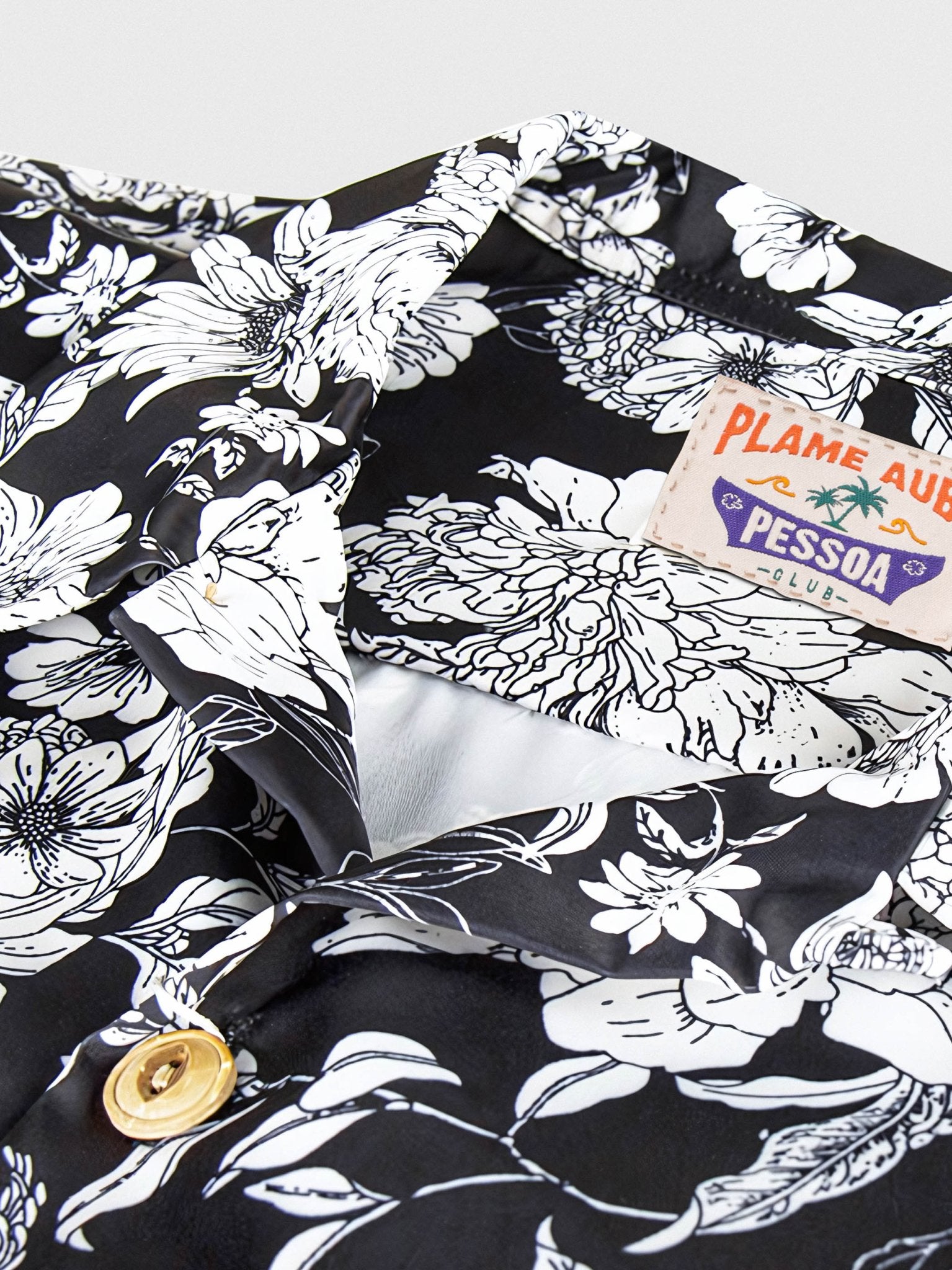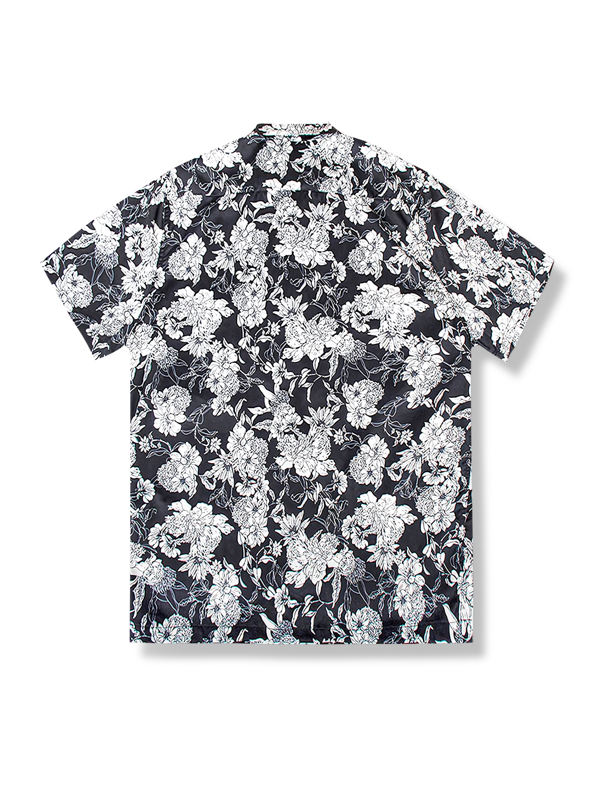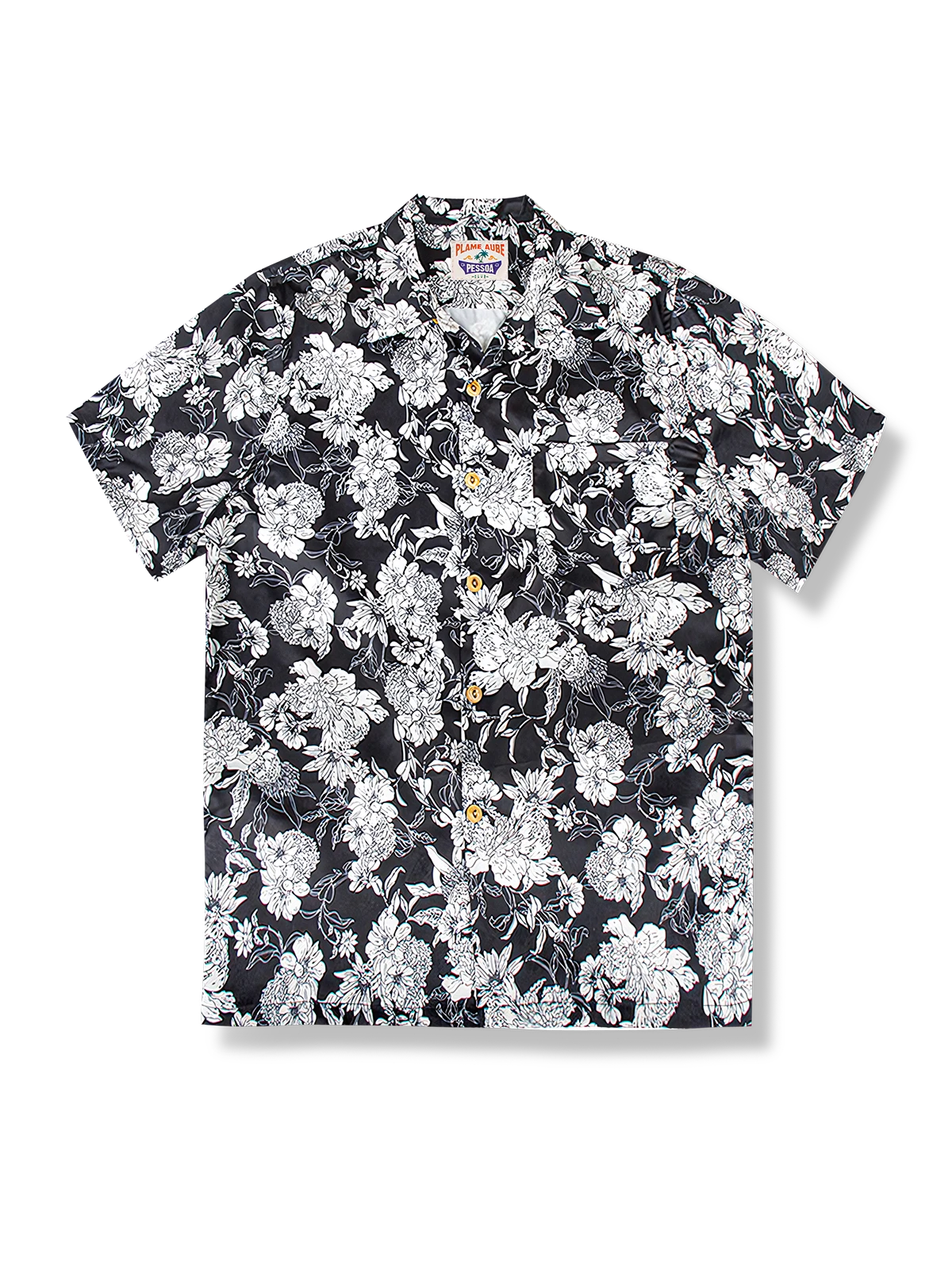 このアロハシャツは、ブラックの地色と爽やかな白い花で、夏の明るく爽やかでリラックスした雰囲気を演出し、独自の特色を持っています。