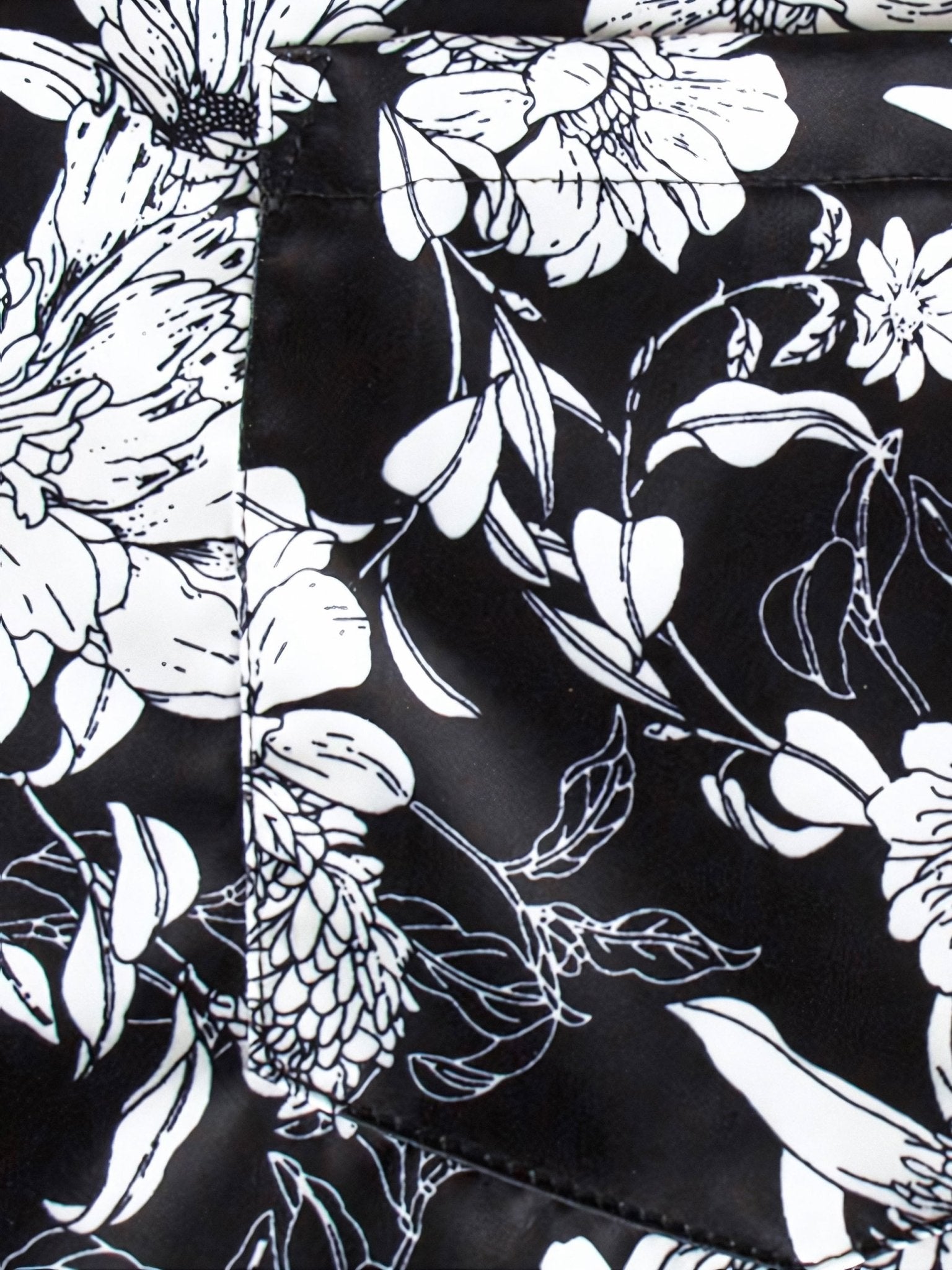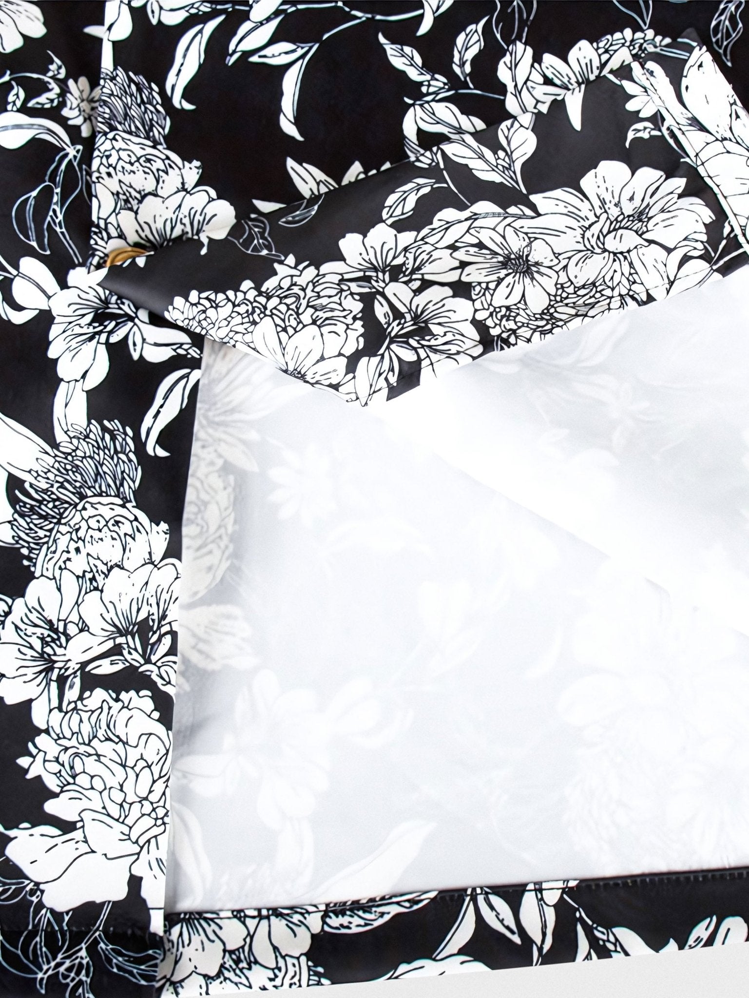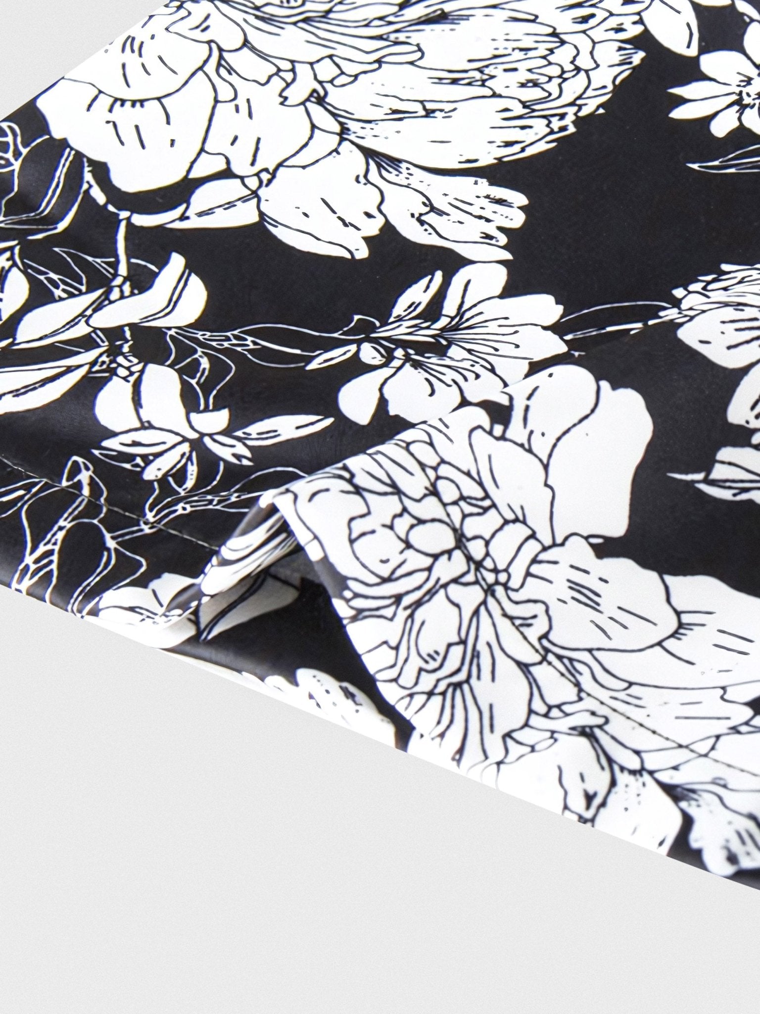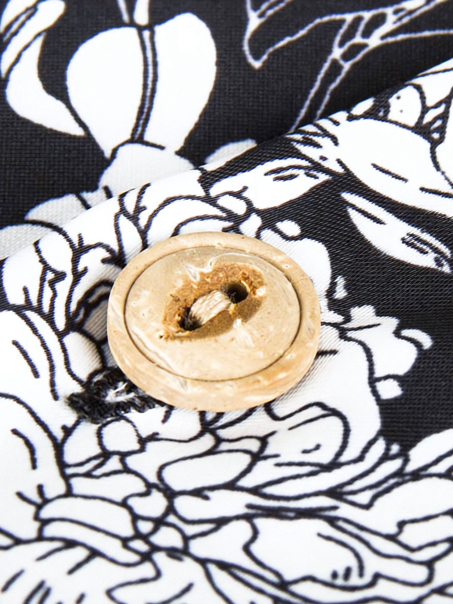 このアロハシャツは、ブラックの地色と爽やかな白い花で、夏の明るく爽やかでリラックスした雰囲気を演出し、独自の特色を持っています。