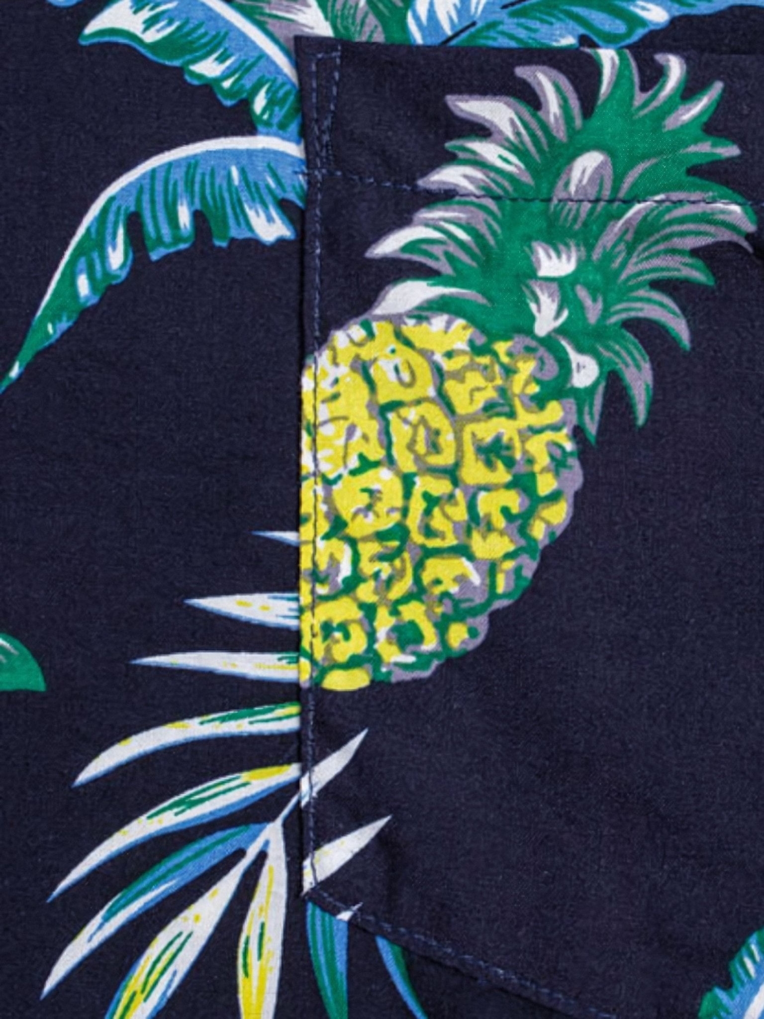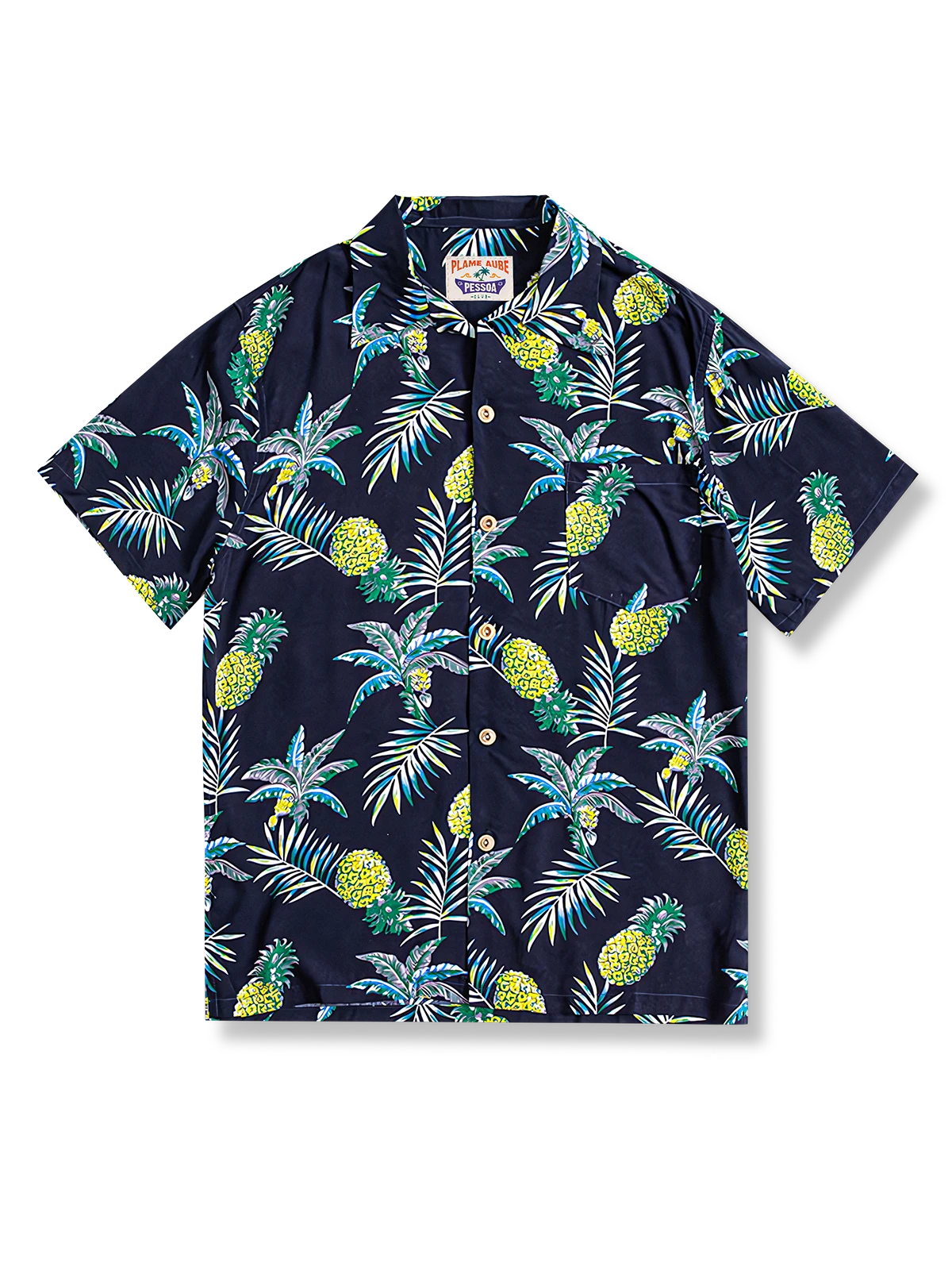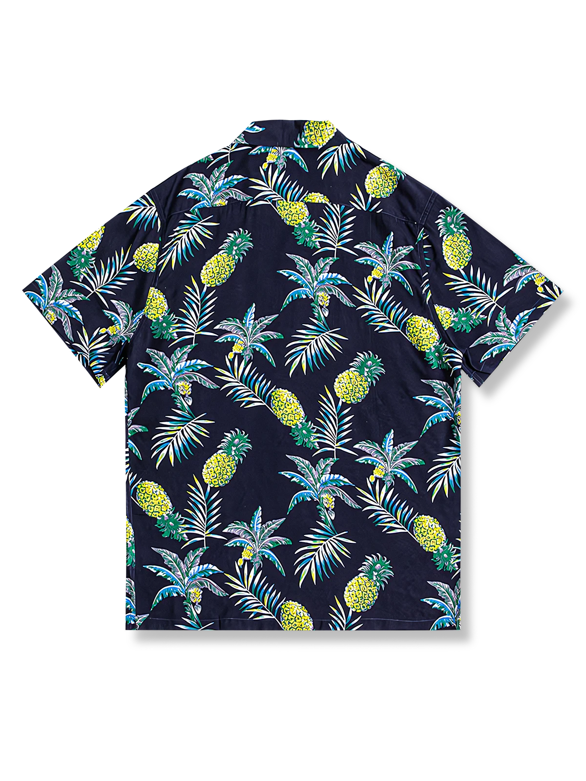 このアロハシャツは黒をベースとして、爽やかなパイナップル柄が使用されて、夏の清涼感とリラックス感を感じさせます。