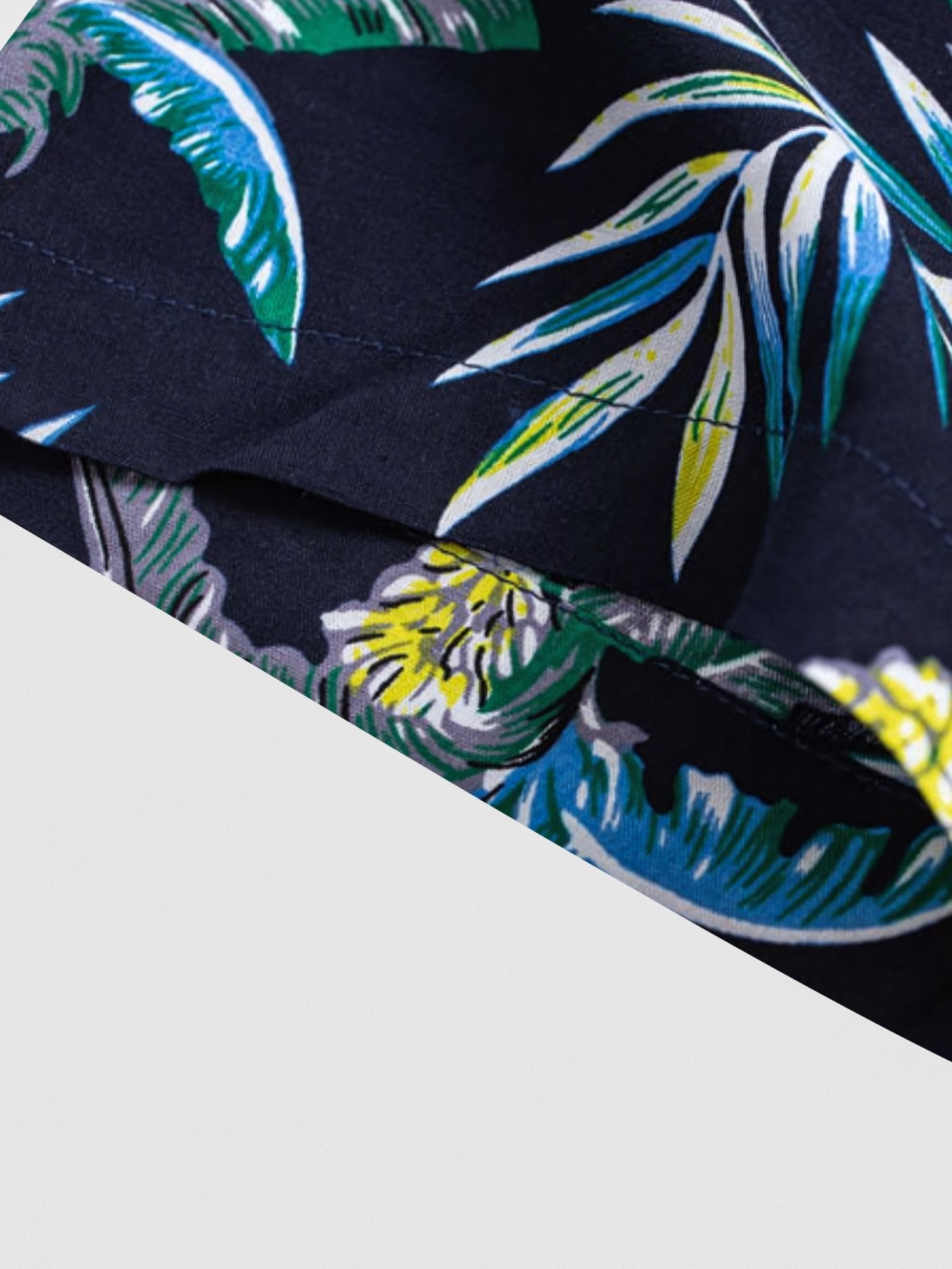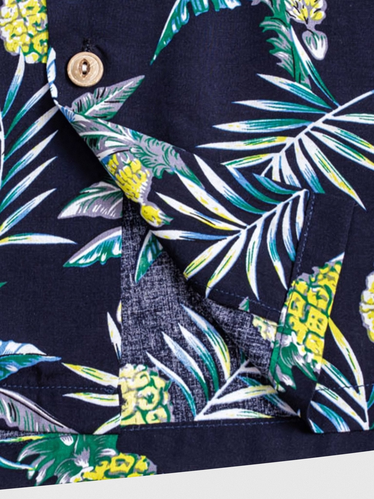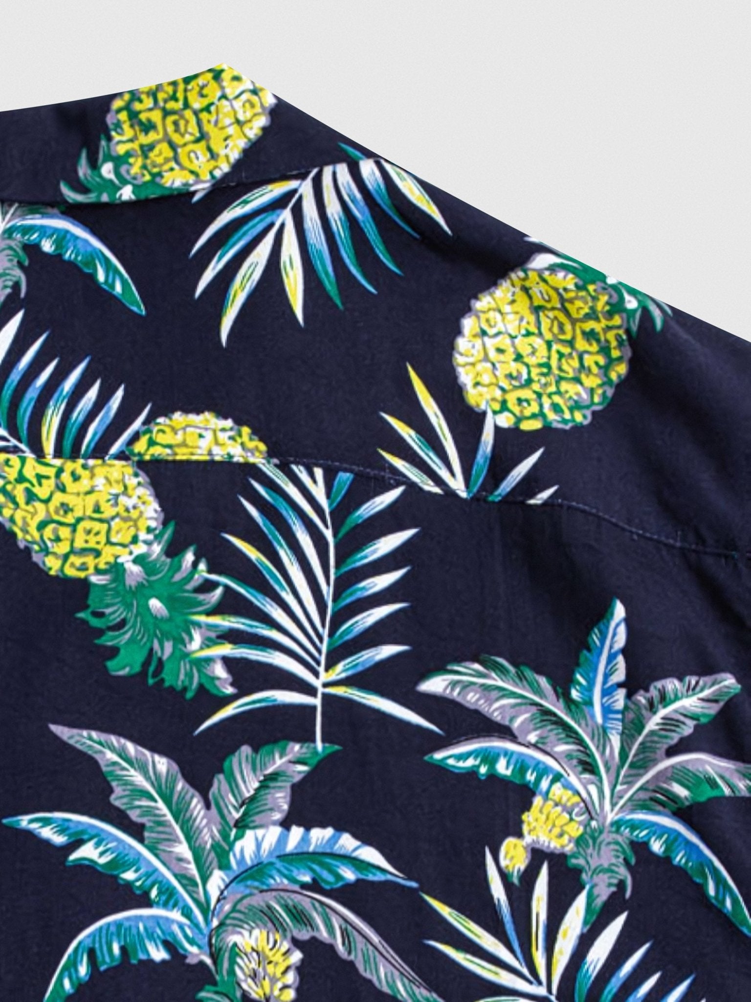 このアロハシャツは黒をベースとして、爽やかなパイナップル柄が使用されて、夏の清涼感とリラックス感を感じさせます。