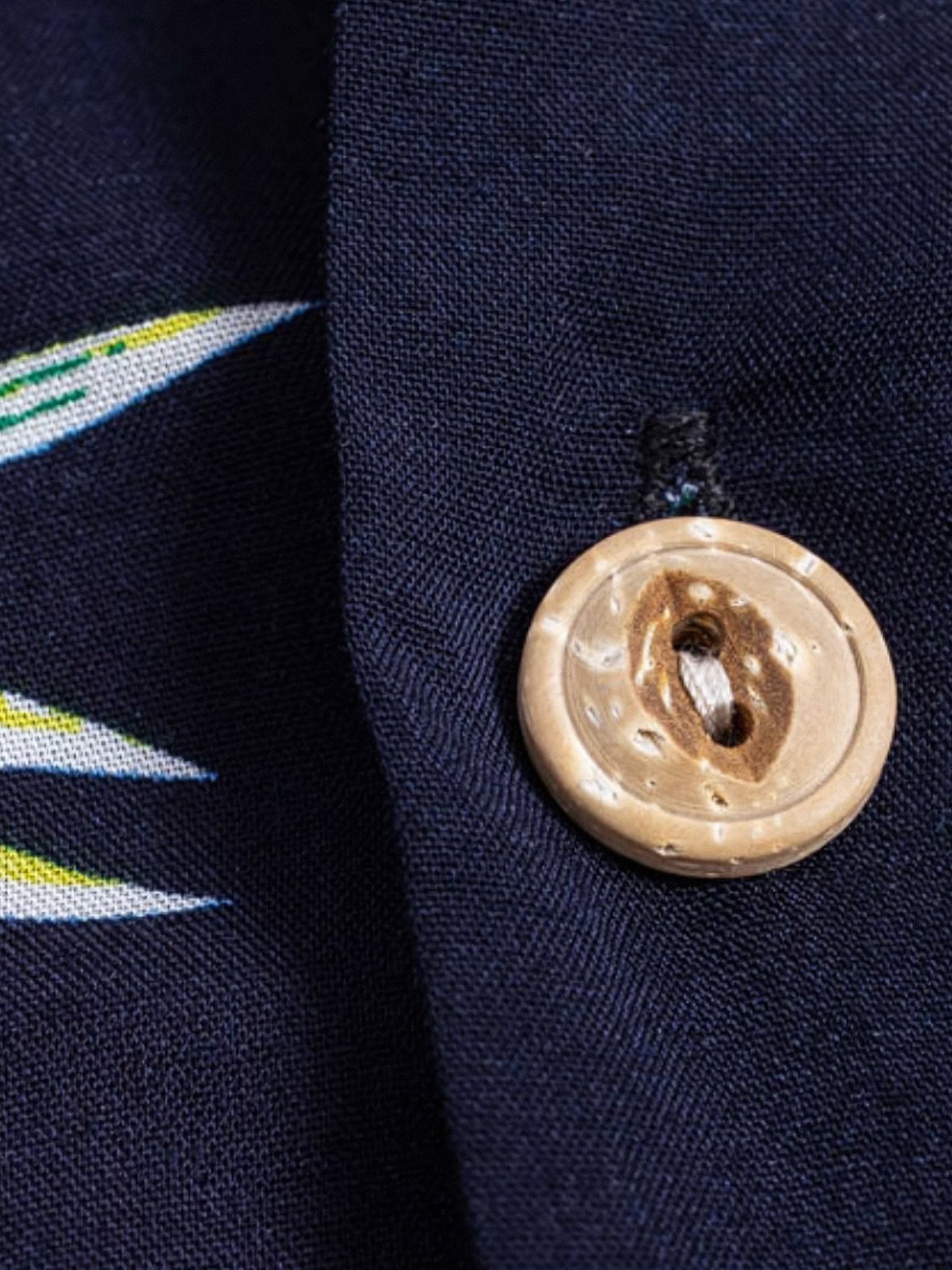 左胸元に装備されたワンポケット、シンプルなデザインながらも随所に遊び心を感じさせます。フロントにはココナッツボタンを使用し、リゾート感あるアクセントを加えました。裾周りにゆとりがあり、動きやすさと重ね着のしやすさを両立。