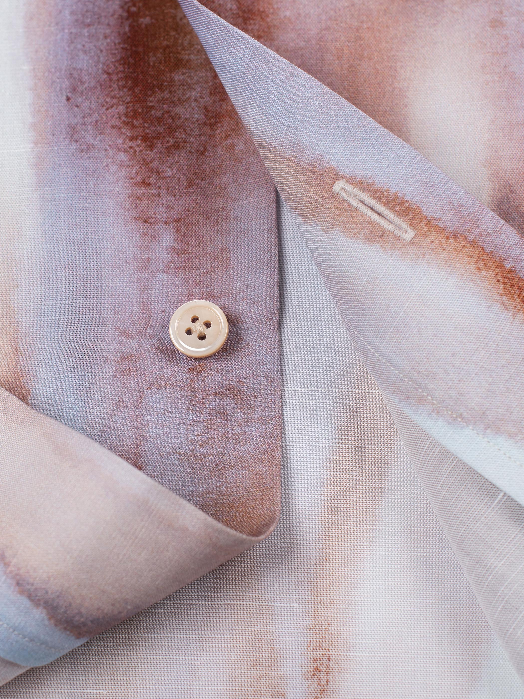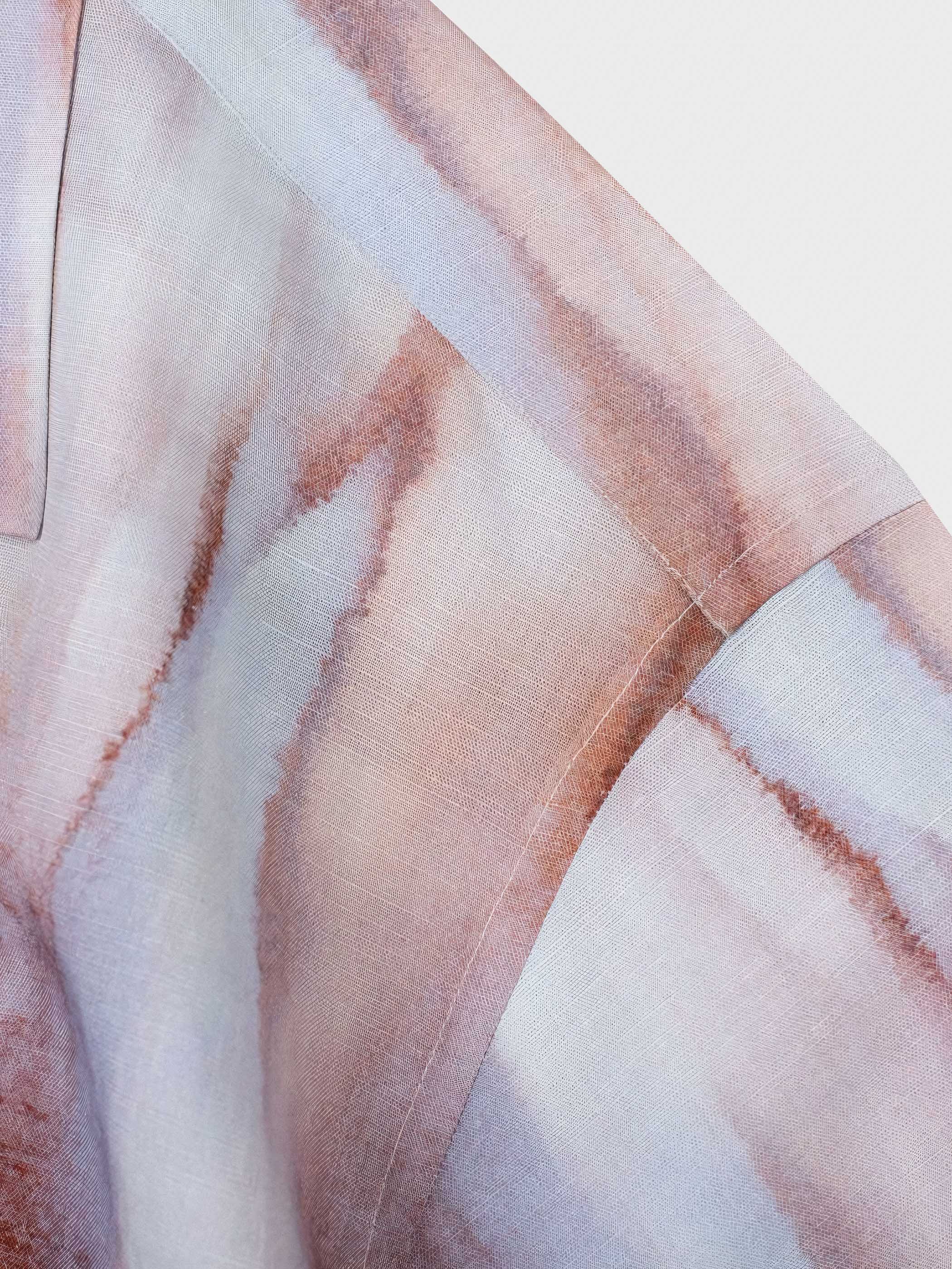 このシャツは、セルロース繊維と麻の混紡素材を使用しており、柔らかく快適な質感と良好な通気性を備えています。セルロース繊維は、廃棄物から再加工された繊維で、環境への負荷を軽減し、製品の耐久性を高めることができます。麻は、天然の涼しさと優れた吸湿性を持ち、夏季の着用に適しています。混紡された生地は、麻の特性を保持しながら、セルロース繊維の利点を追加し、このシャツにより優れた着用感をもたらしています。