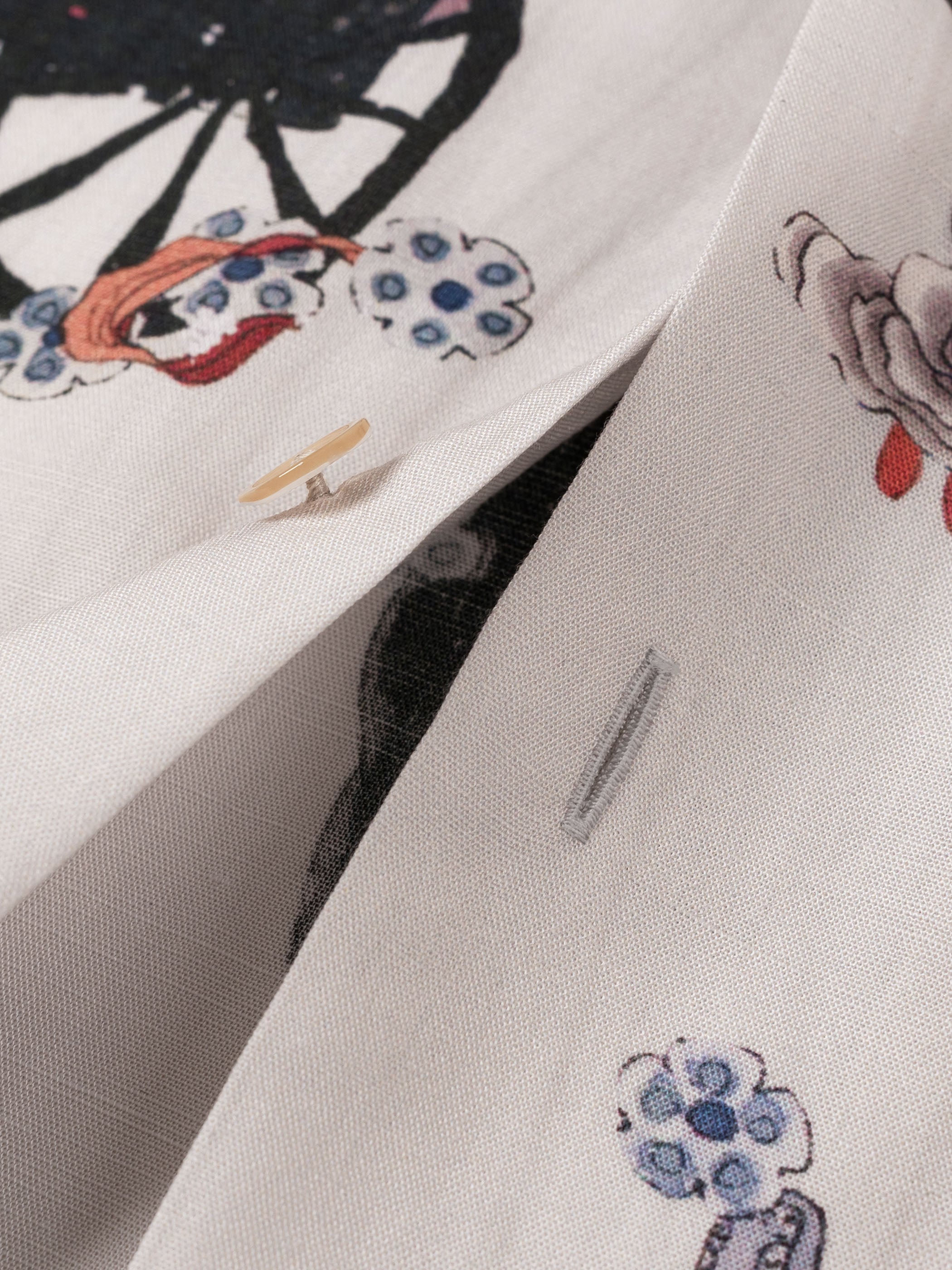 このアロハシャツは、濃いめの油絵風のデザインが特徴で、淡い緑色の地色と花柄が春の雰囲気を演出しています。細かいディテールと花柄がシャツをより個性的に見せ、着るとまるで花の香りと清々しい空気を感じるようです。