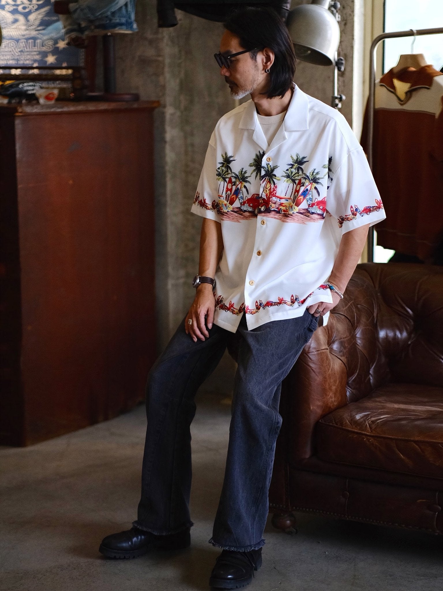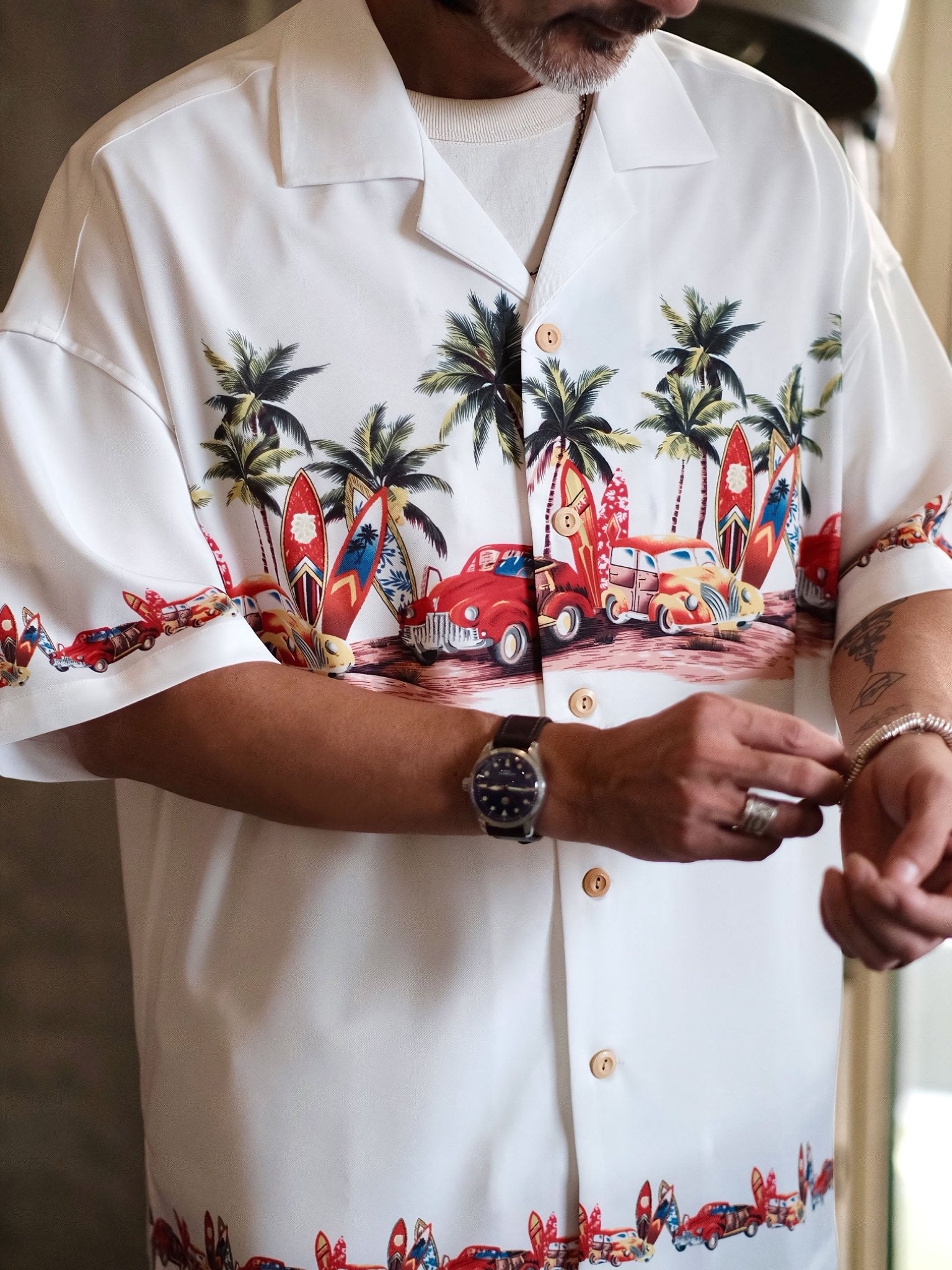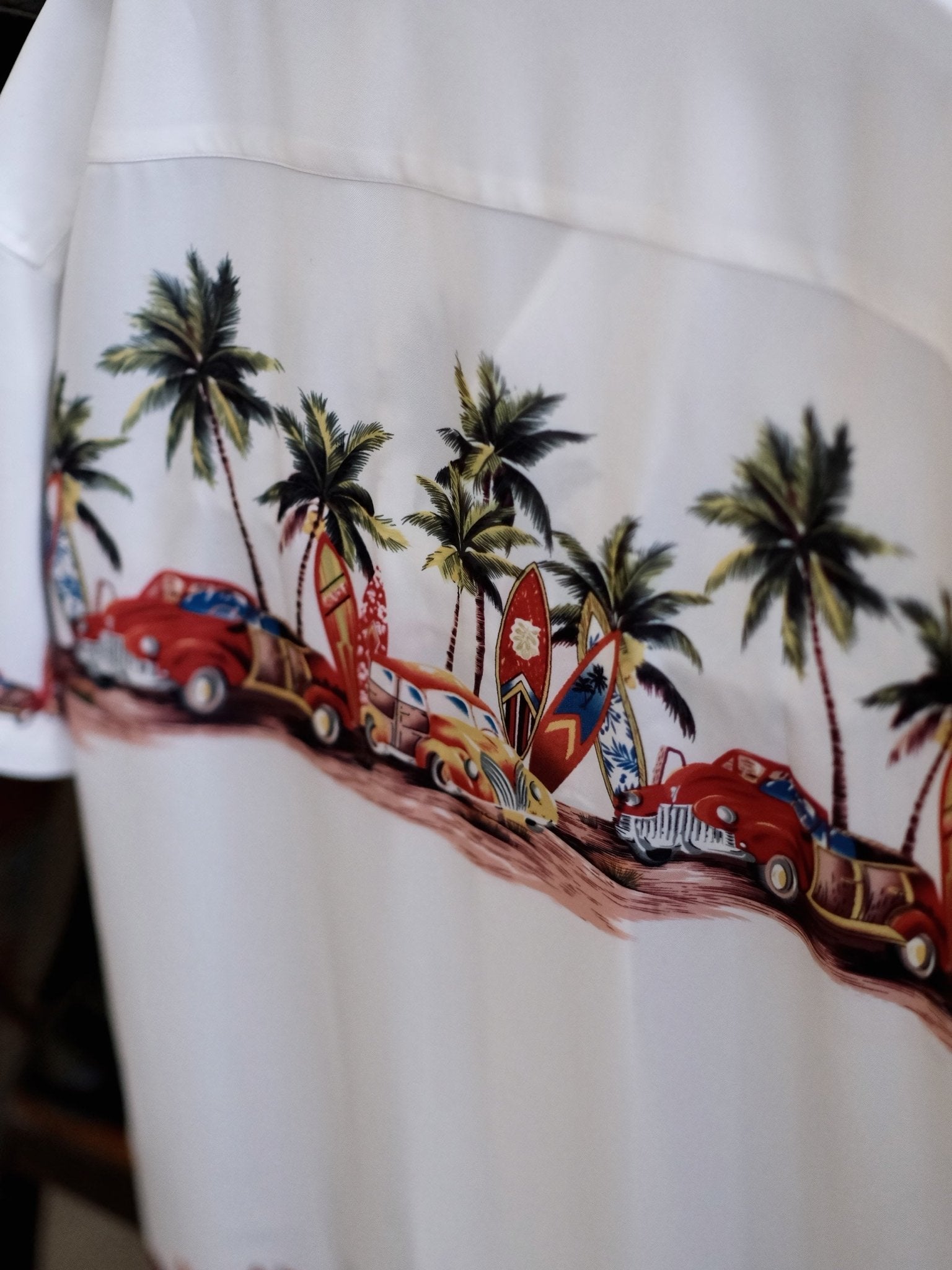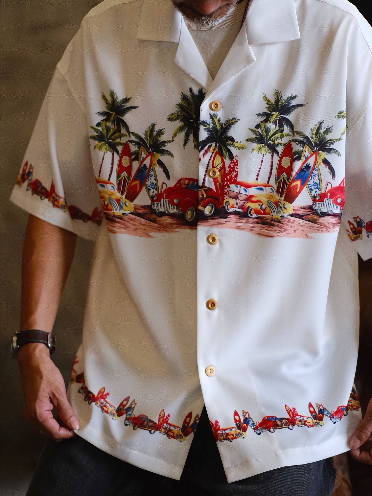 このシャツは、爽やかな夏の雰囲気を演出し、パームツリーやサーフボード、車などをモチーフにした柄が明るい夏の風景を描き出しています。このシャツを見れば、エルヴィス・プレスリーのクラシックアルバム「Blue Hawaii」のカバーを思い浮かべることでしょう。濃厚な夏の情緒に溢れています。をもたらします。