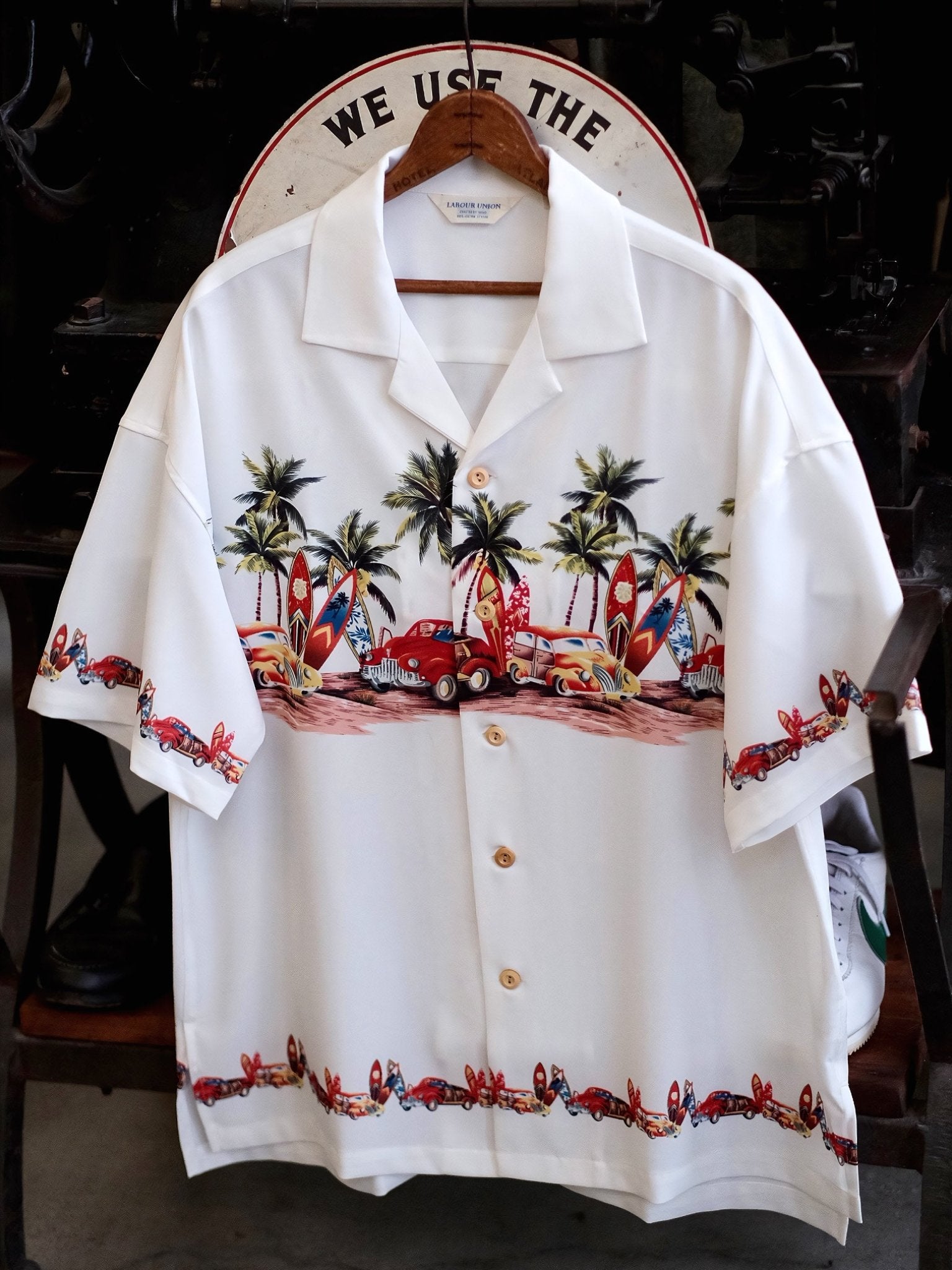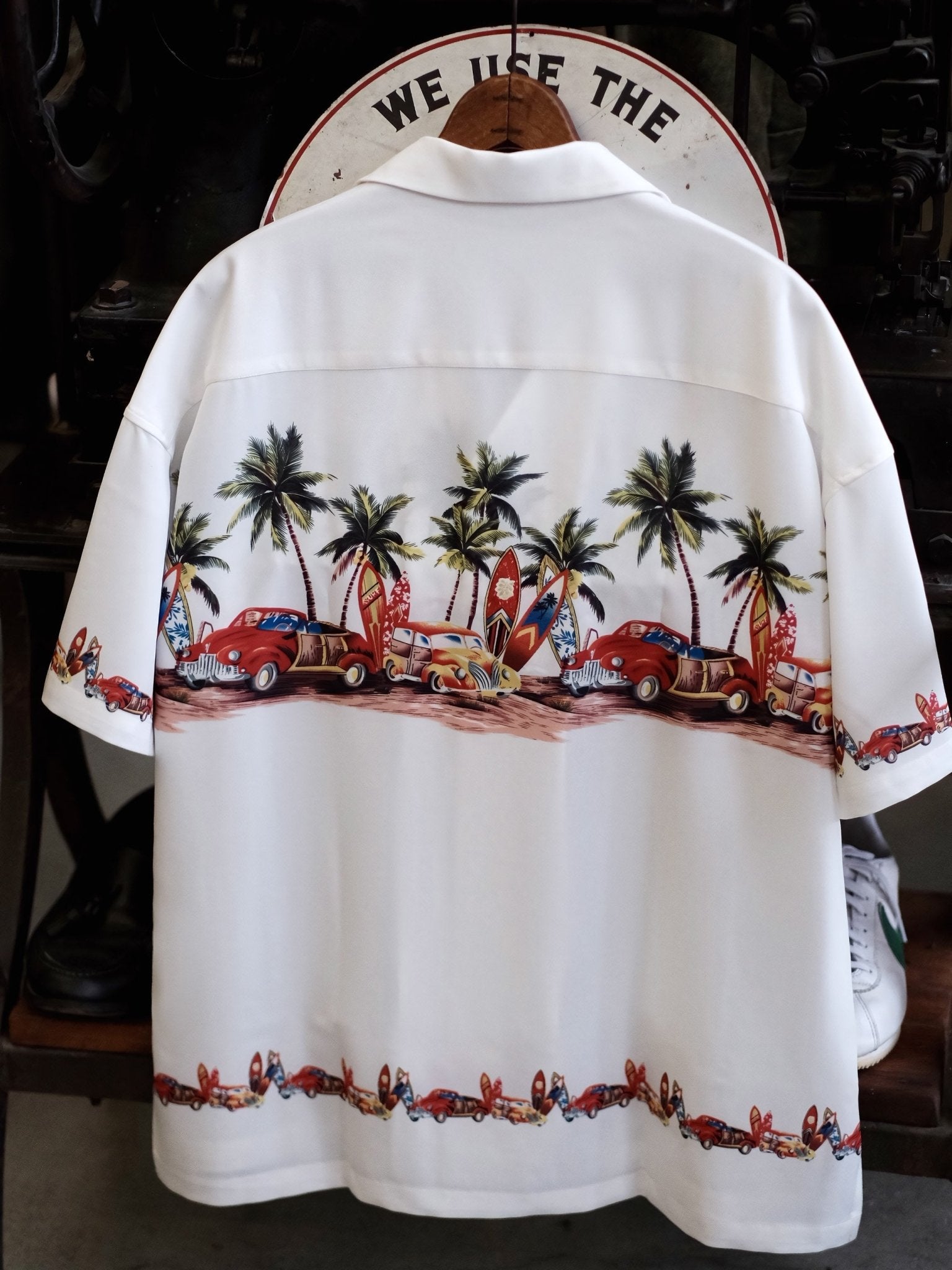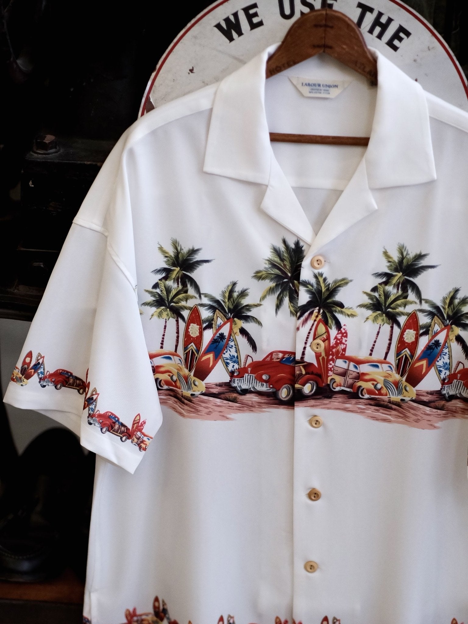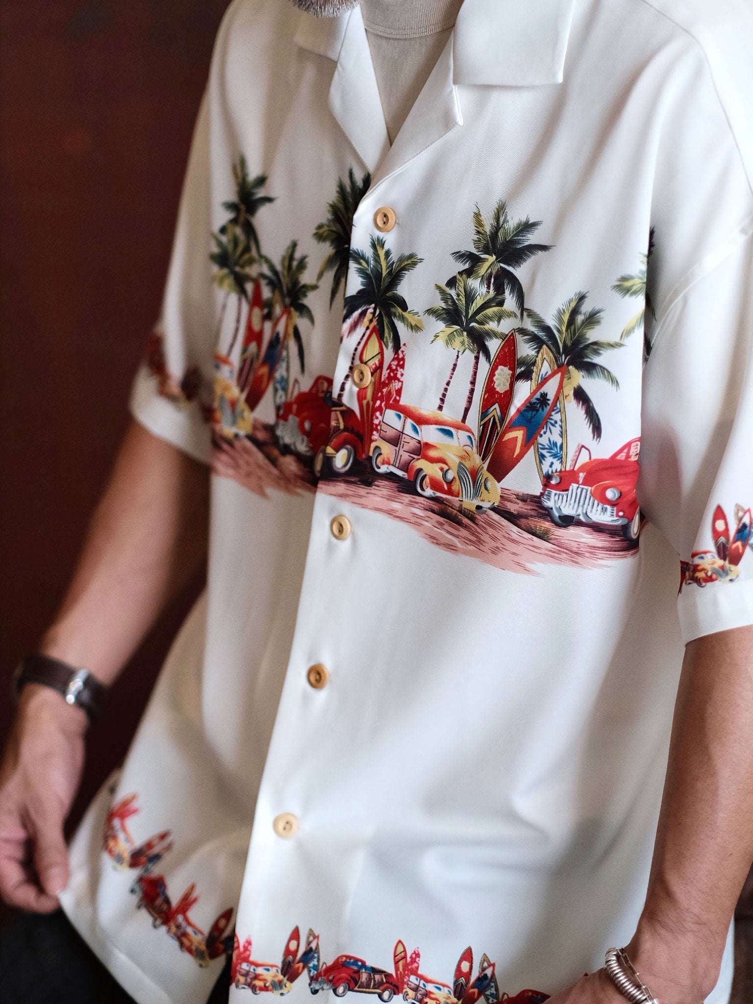 このシャツは、爽やかな夏の雰囲気を演出し、パームツリーやサーフボード、車などをモチーフにした柄が明るい夏の風景を描き出しています。このシャツを見れば、エルヴィス・プレスリーのクラシックアルバム「Blue Hawaii」のカバーを思い浮かべることでしょう。濃厚な夏の情緒に溢れています。をもたらします。