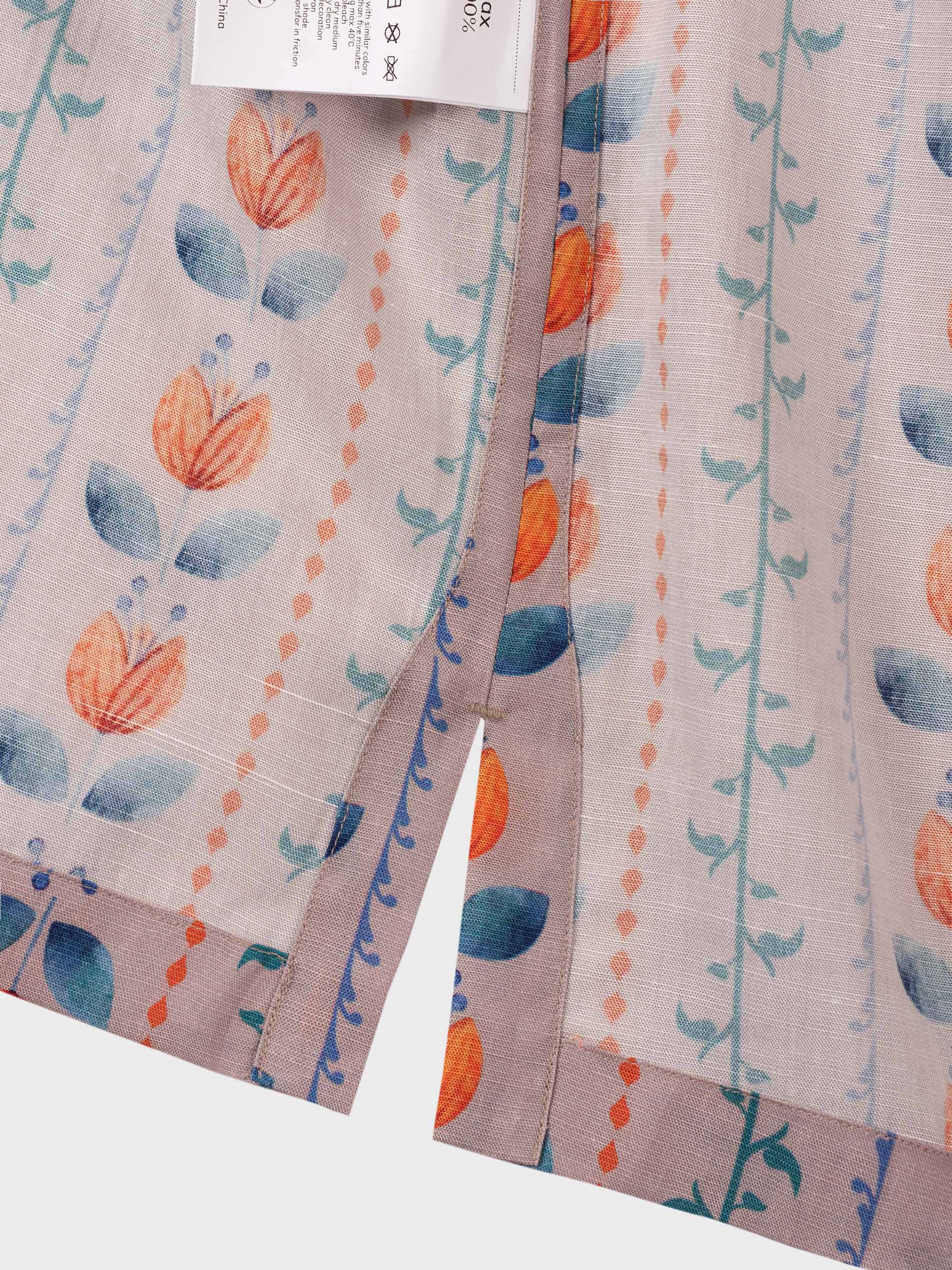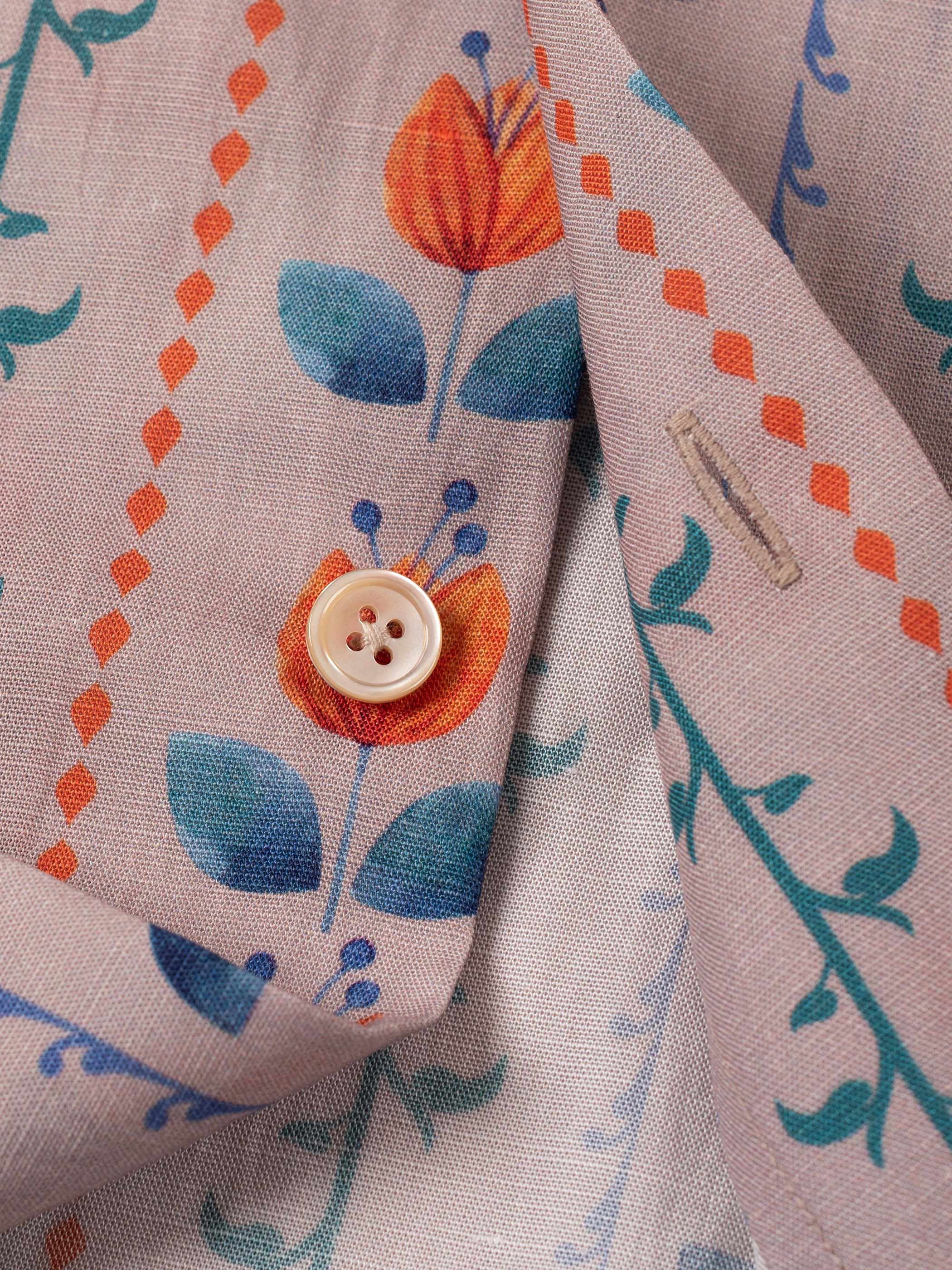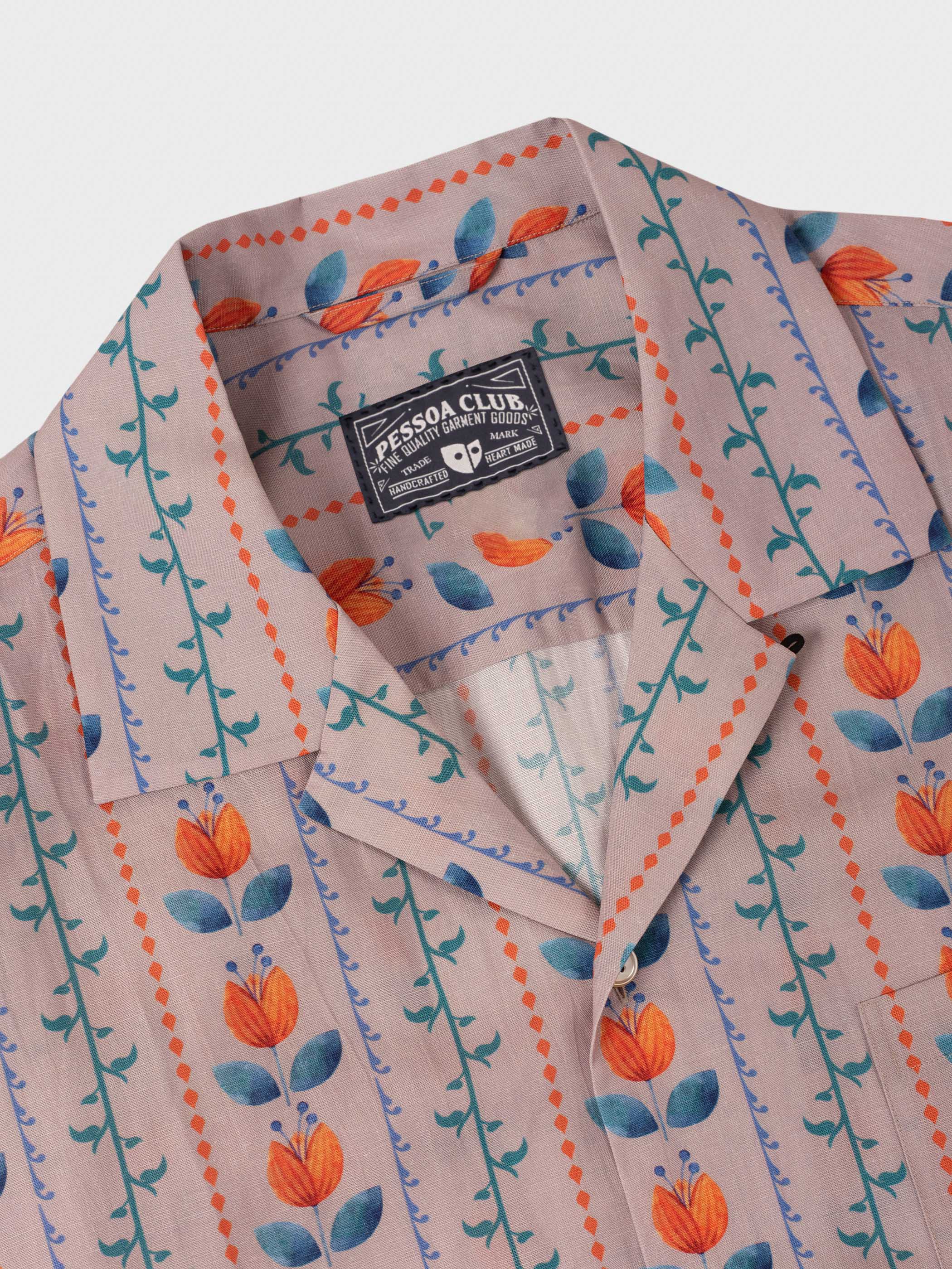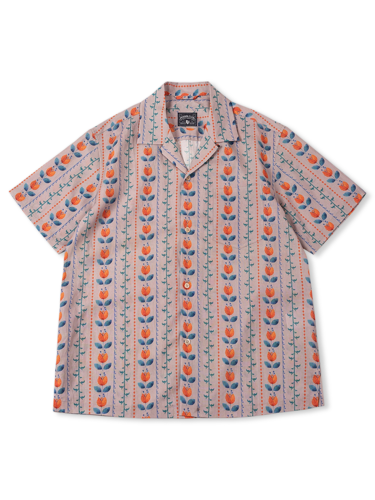 このデザインは、美しいチューリップがシャツ全体に鮮やかに描かれており、華やかさとエレガントさを演出しています。古巴風の襟がシャツに独自のスタイルを与え、ヴィンテージな雰囲気を醸し出しています。チューリップ柄は、爽やかな夏のイメージを表現しています。チューリップの美しい花々が細かく描かれ、シャツに優雅な魅力をもたらしています。