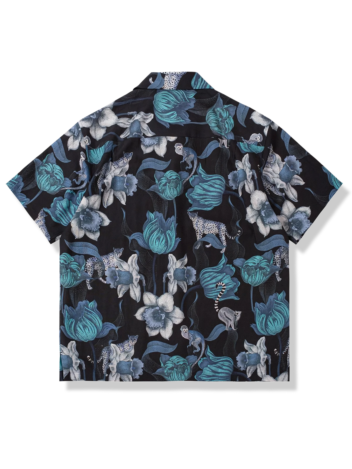 このキューバシャツは、花と葉にはヒョウとワオキツネザルが登場し、個性と魅力に溢れたデザインとなっています。このようなユニークなデザインは、絶対に見逃せません!