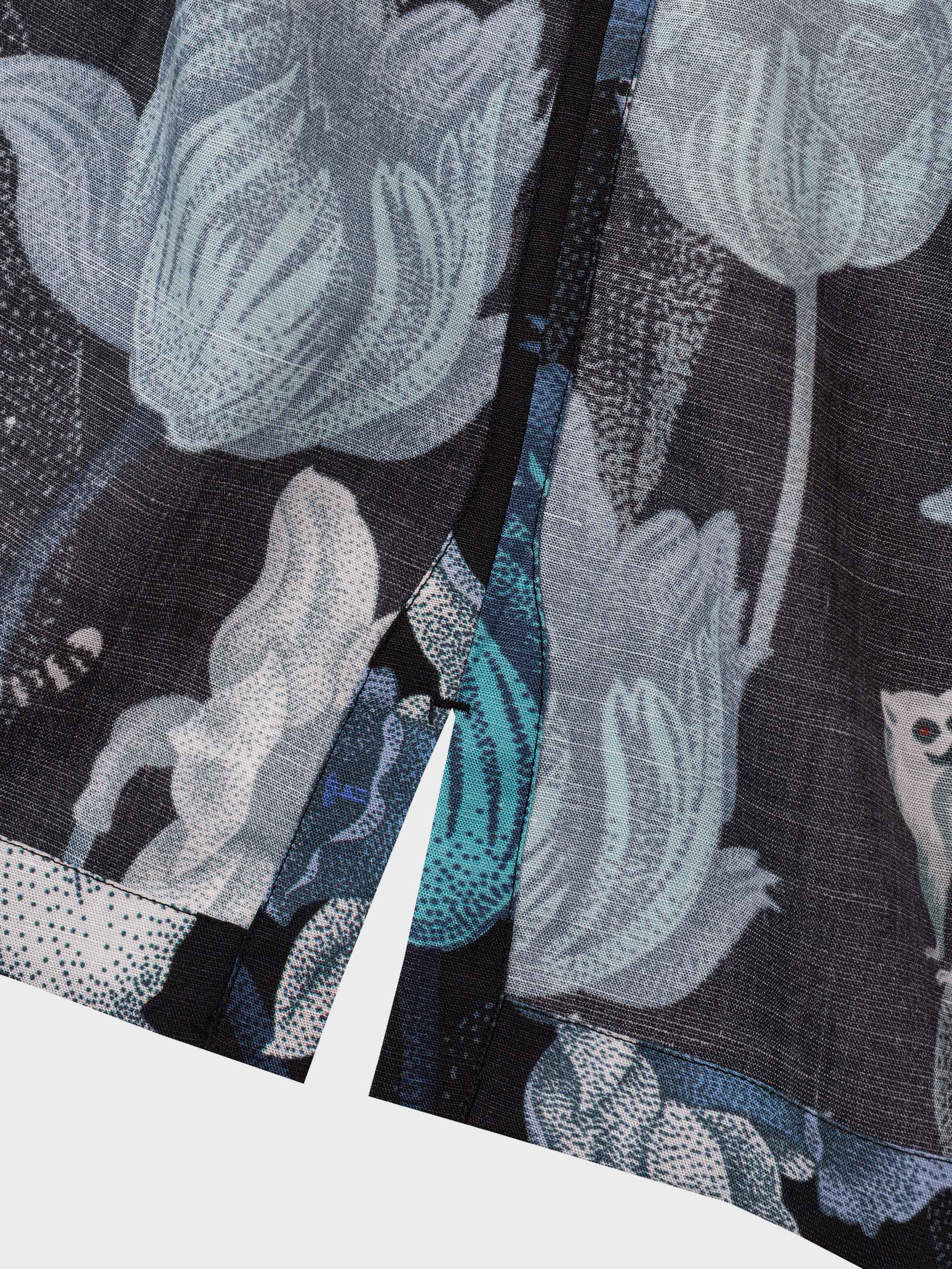 黒をベースに、異なる形の青い花のつぼみのパターンがアクセントとなり、妖艶な美しさを演出しています。襟元、袖口、ボタンまで、すべてが高品質なクラフトマンシップを示しています。