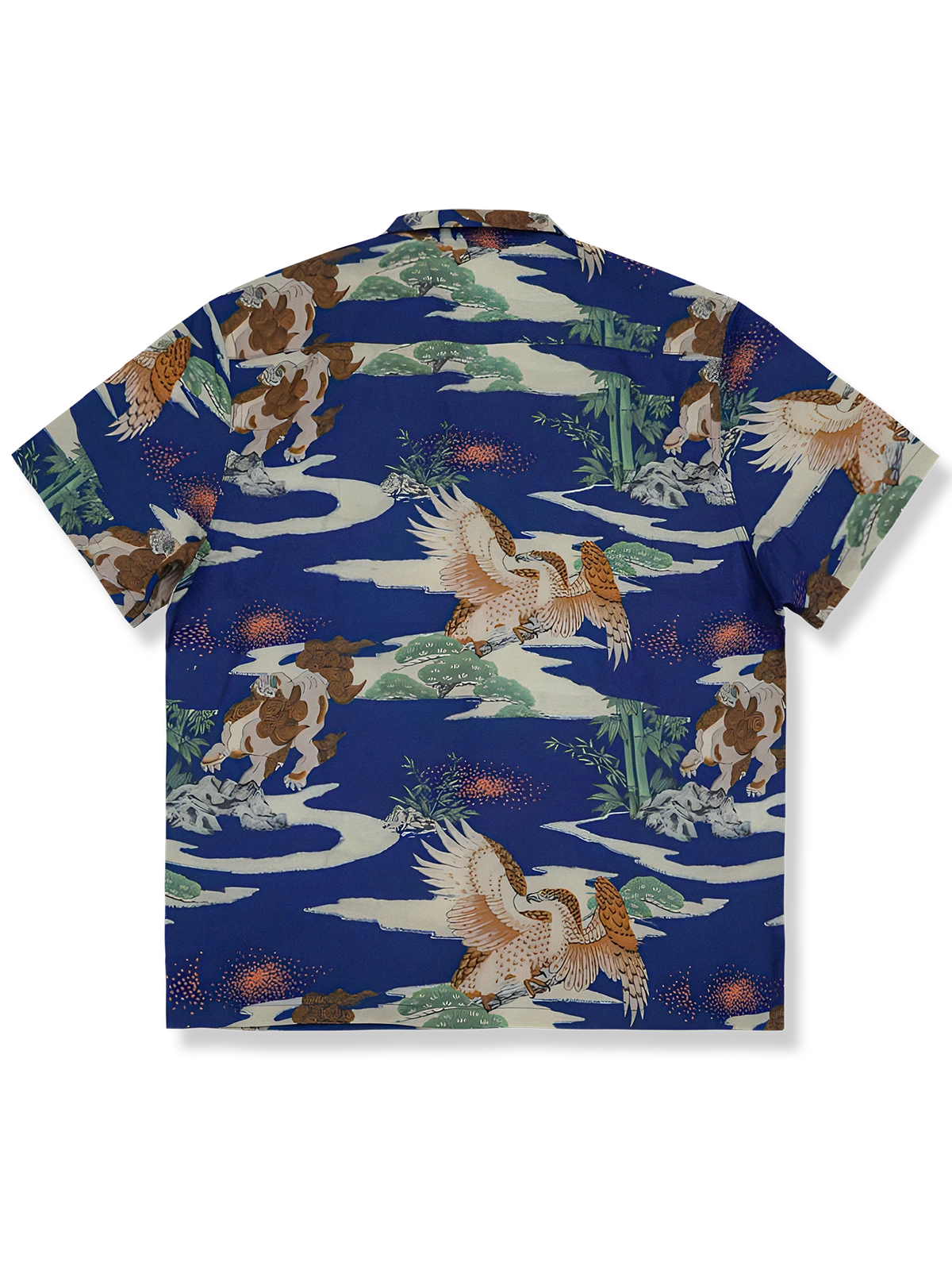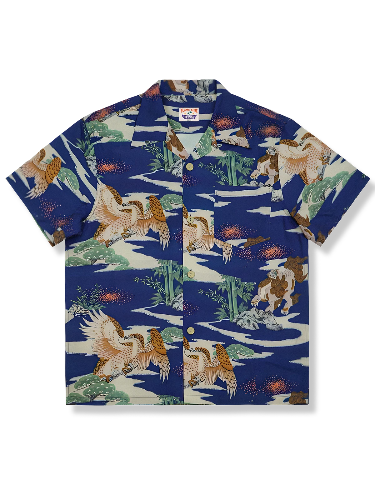 鷲、松、竹、獅子唐をモチーフにした深い青色のハワイアンシャツです。シャツはキューバ襟で、伝統的なハワイアンシャツの雰囲気を演出。さらに、ポケットやボタンに施されたデザインも、ハワイの自然と文化を思わせます。これらの要素が絶妙に組み合わされ、スタイリッシュで個性的な一着に仕上がりました。