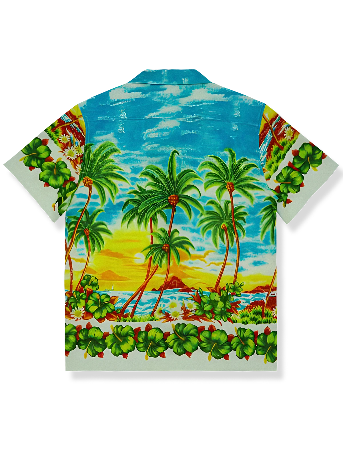 シャツのデザインとプリントは、鮮やかな青と黄色のコントラストと、大面積のヤシの木の模様が加わり、鮮やかで変化に富んだ色彩が特徴です。活力にあふれ、生気に満ちた雰囲気が漂う一枚です。