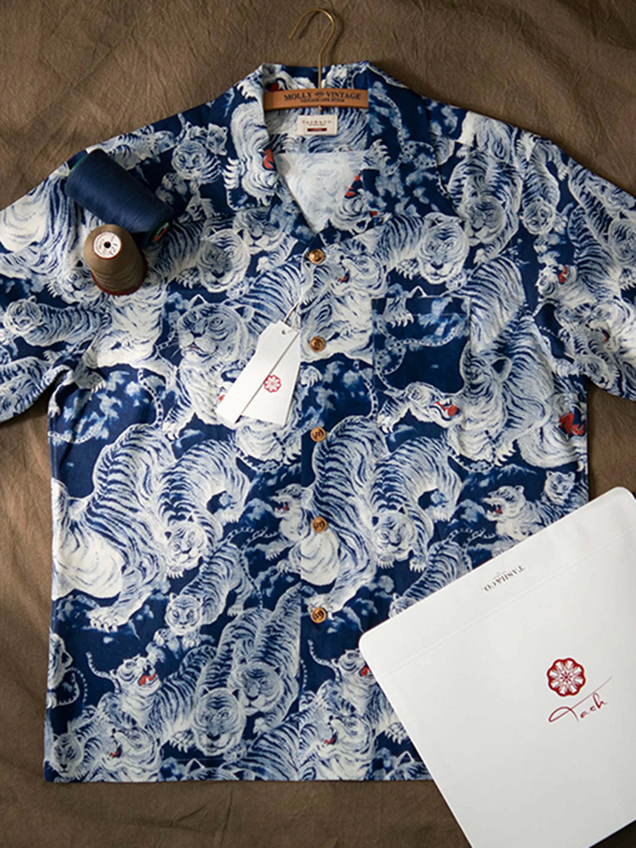 百虎柄はアロハシャツのクラシックな一つで、靛藍色をベースに、朱赤色をちりばめたデザインで、古風でありながらも生き生きとした表現をしています。