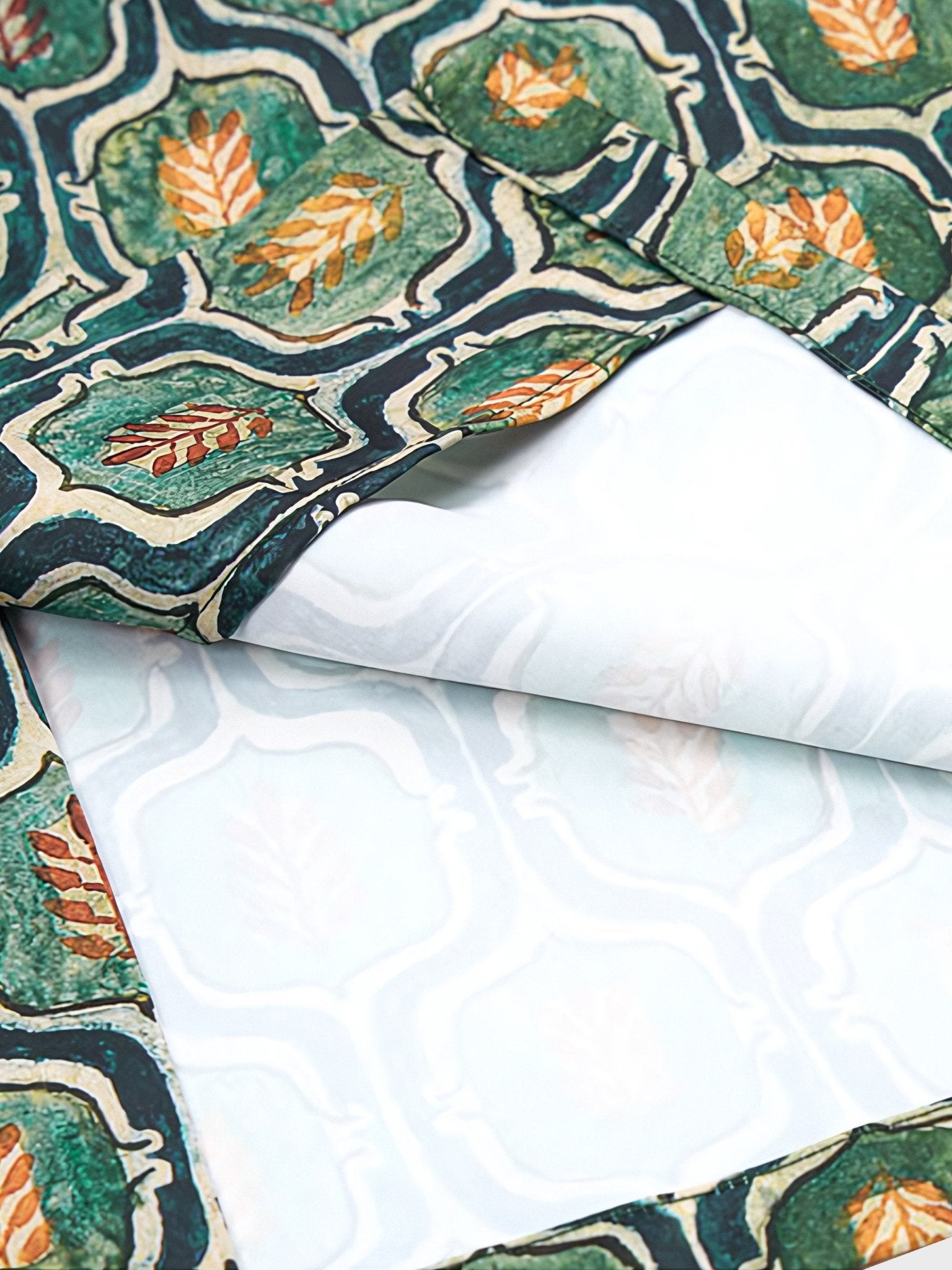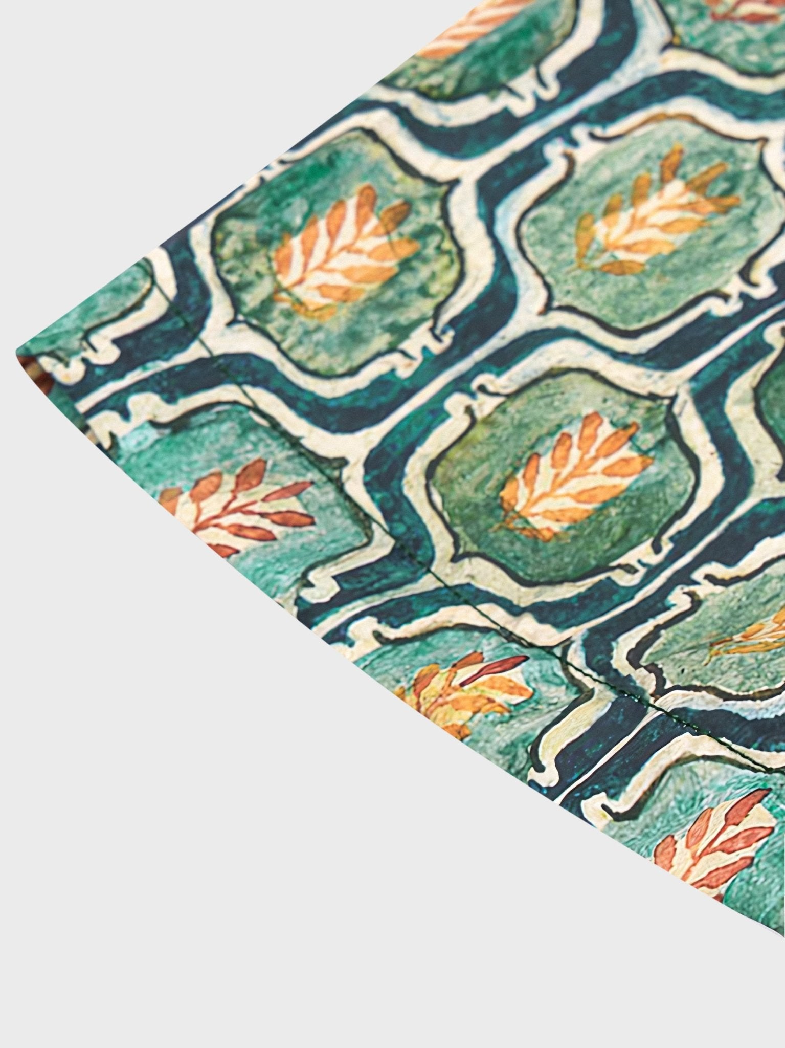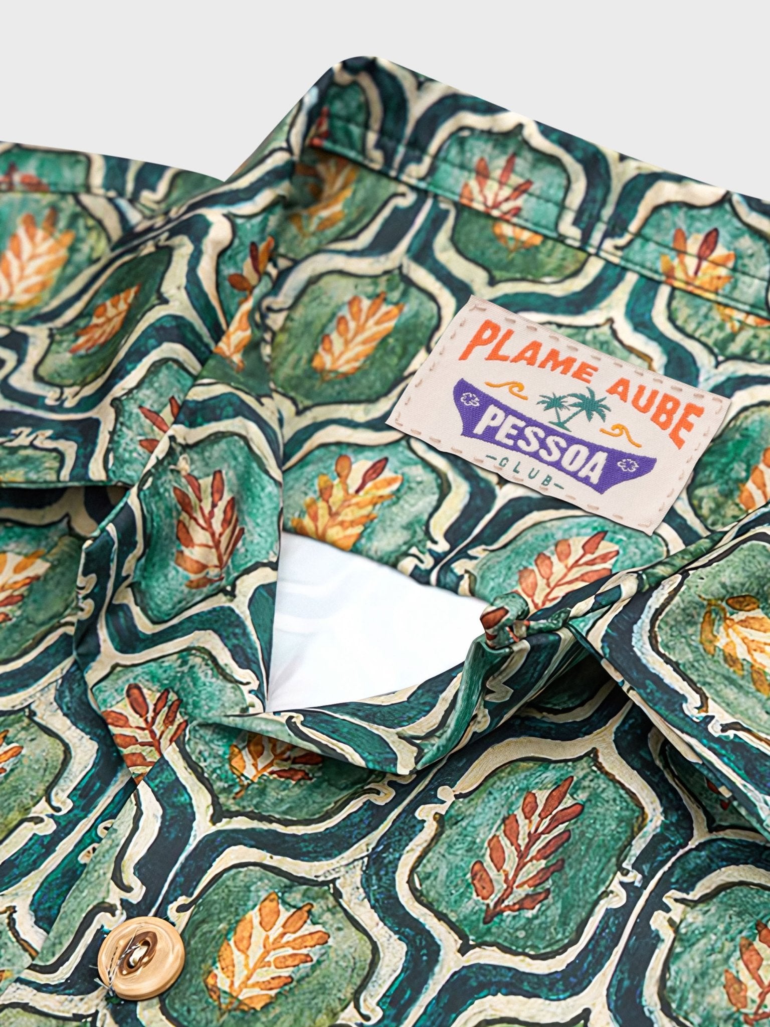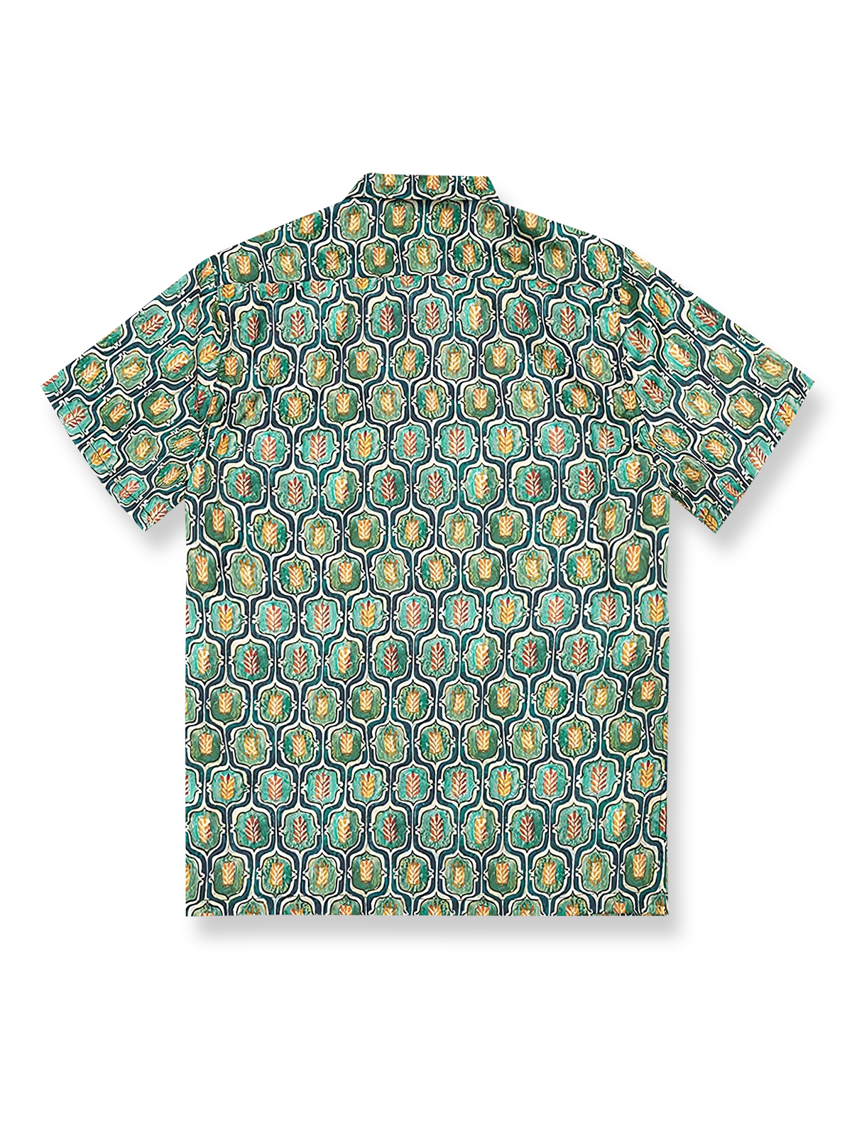シャツのプリント柄は、レトロな要素に満ちて、情熱的で活気にあふれた印象を与えます。柄の色合わせや配置は精巧にデザインされて、ファッション性と芸術性を醸し出しています。