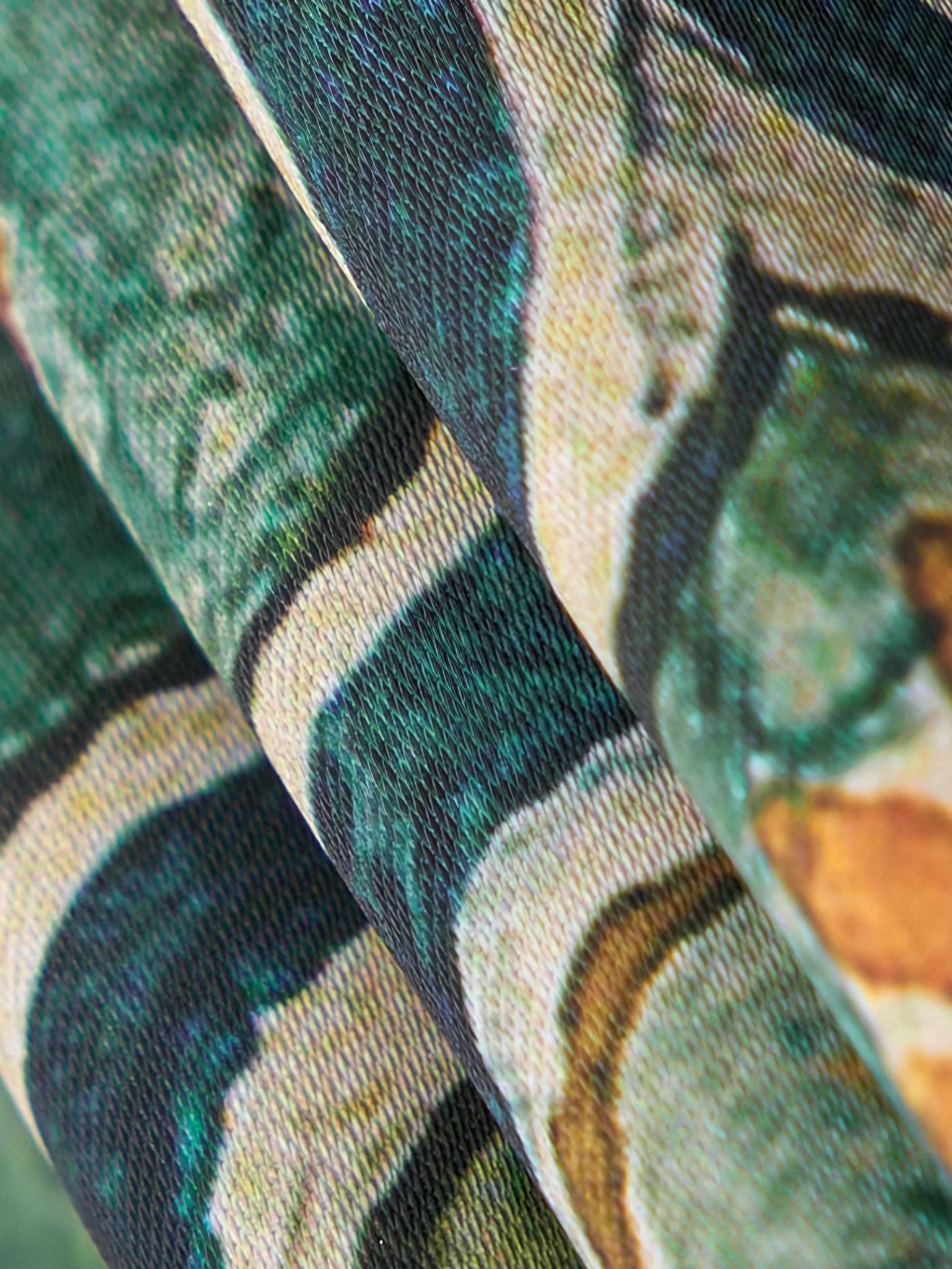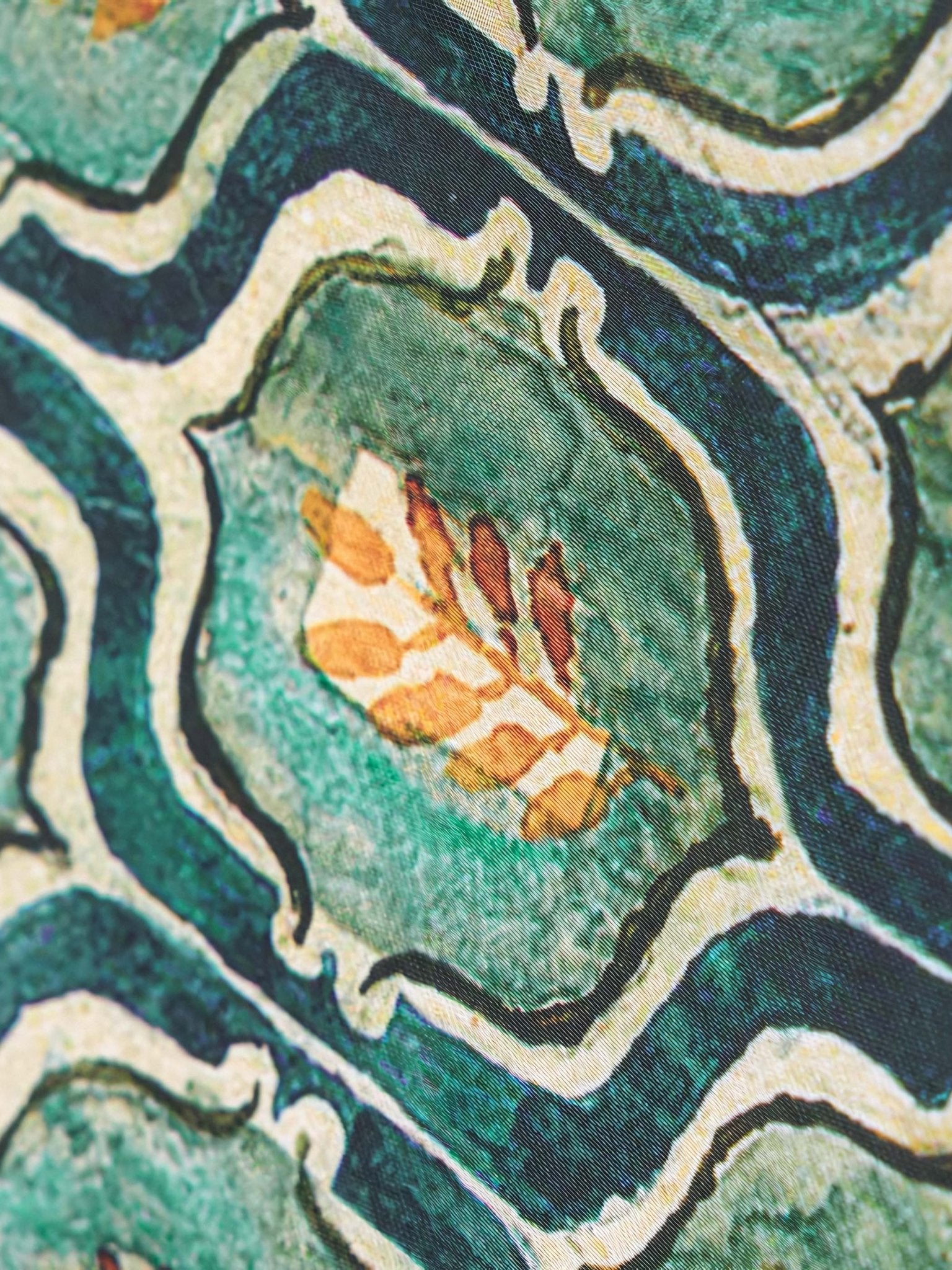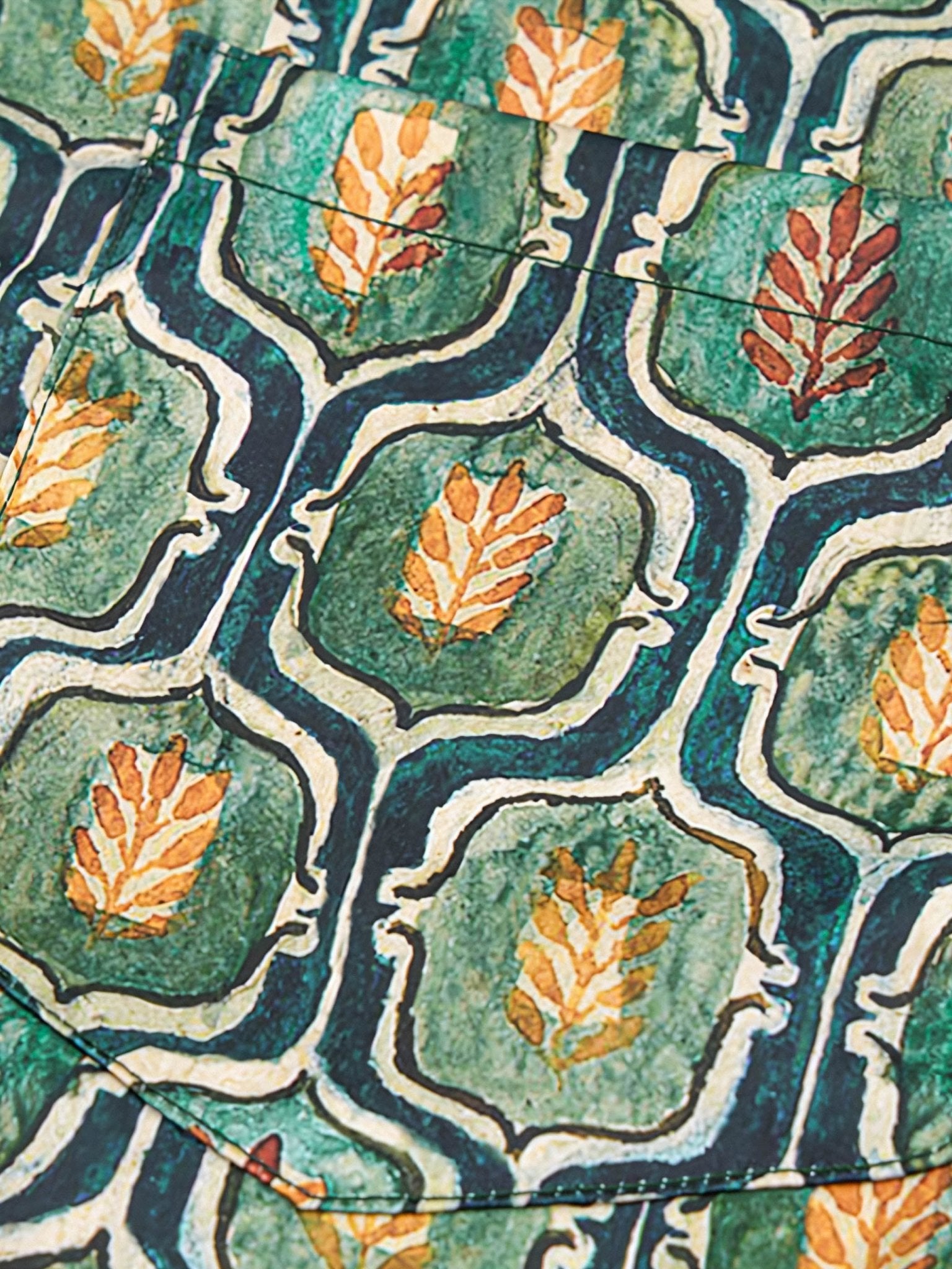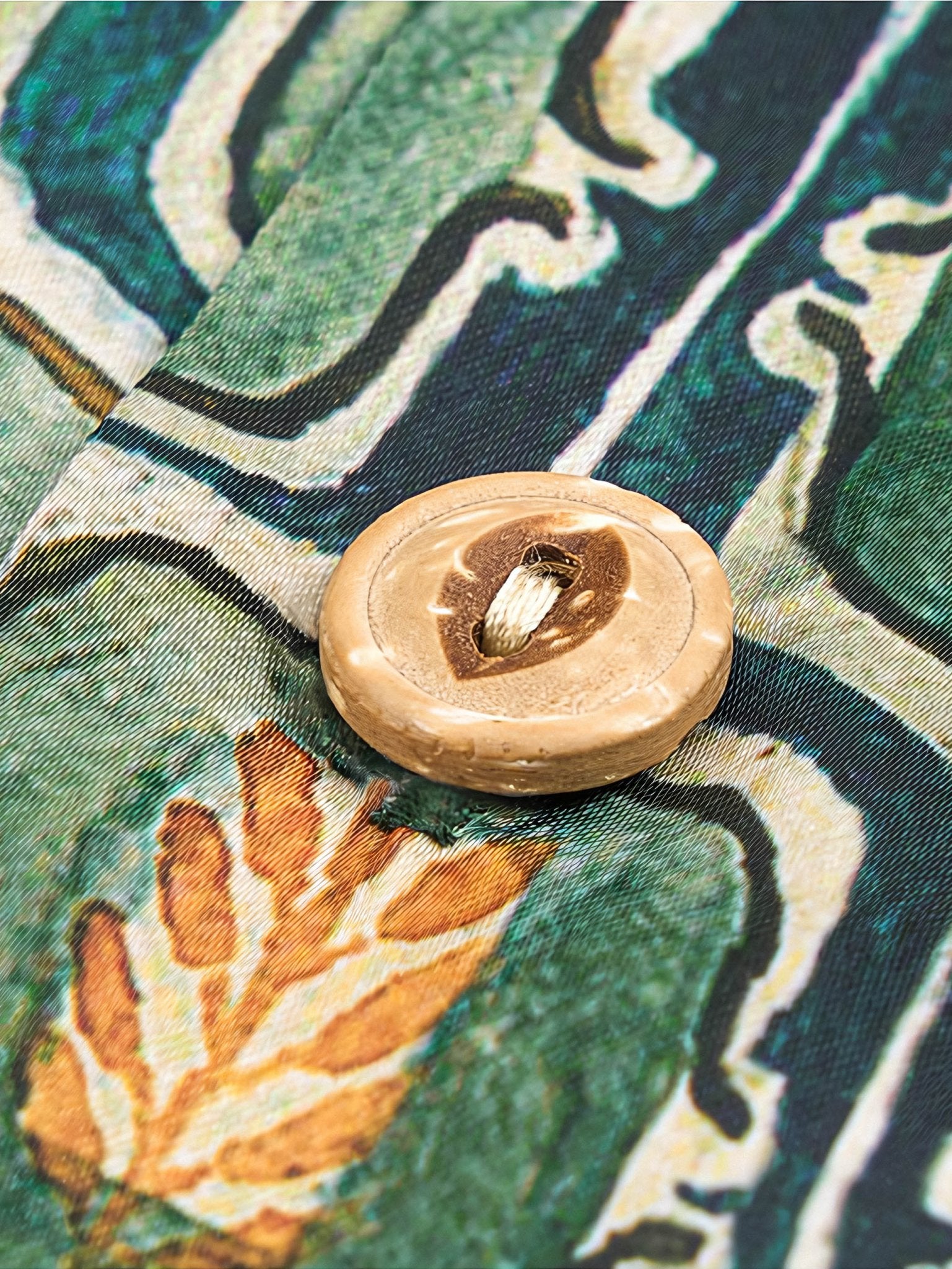 シャツのプリント柄は、レトロな要素に満ちて、情熱的で活気にあふれた印象を与えます。柄の色合わせや配置は精巧にデザインされて、ファッション性と芸術性を醸し出しています。