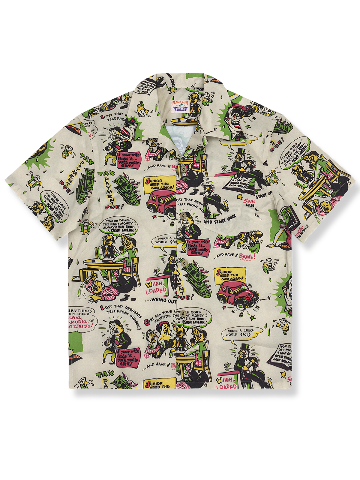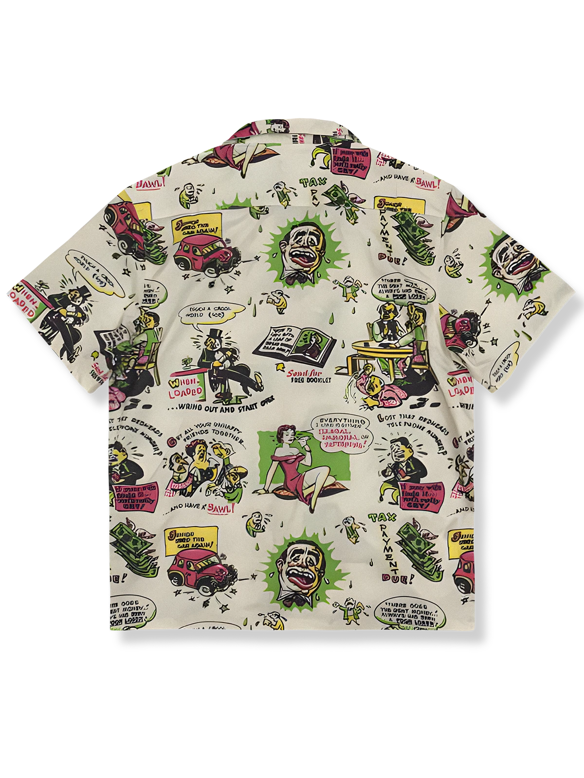 この夏、50年代のビンテージ感覚が漂う夏威夷シャツをお探しの方にオススメです。ビビッドな色使いとポップなデザインが特徴で、プリントは50年代のレトロなイラストで装飾されています。キューバ襟がさりげないアクセントとなり、よりヴィンテージ感を引き立たせます。軽快で涼し気なコットン素材で作られており、夏のカジュアルスタイルにピッタリです。