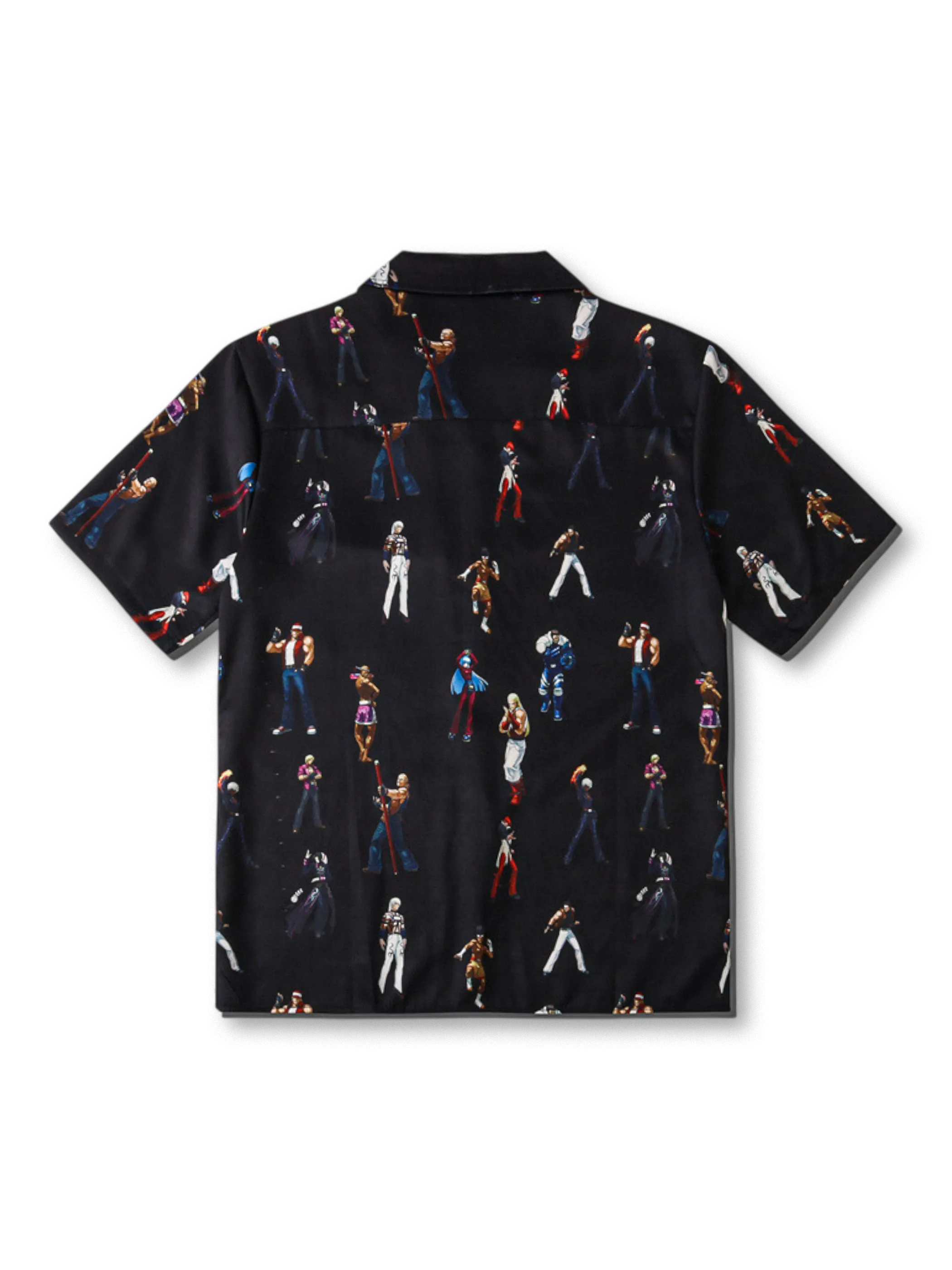 クラシックなボクシングキャラクタープリントを施したポリエステル製のリラックスフィットキューバカラー半袖シャツ。
