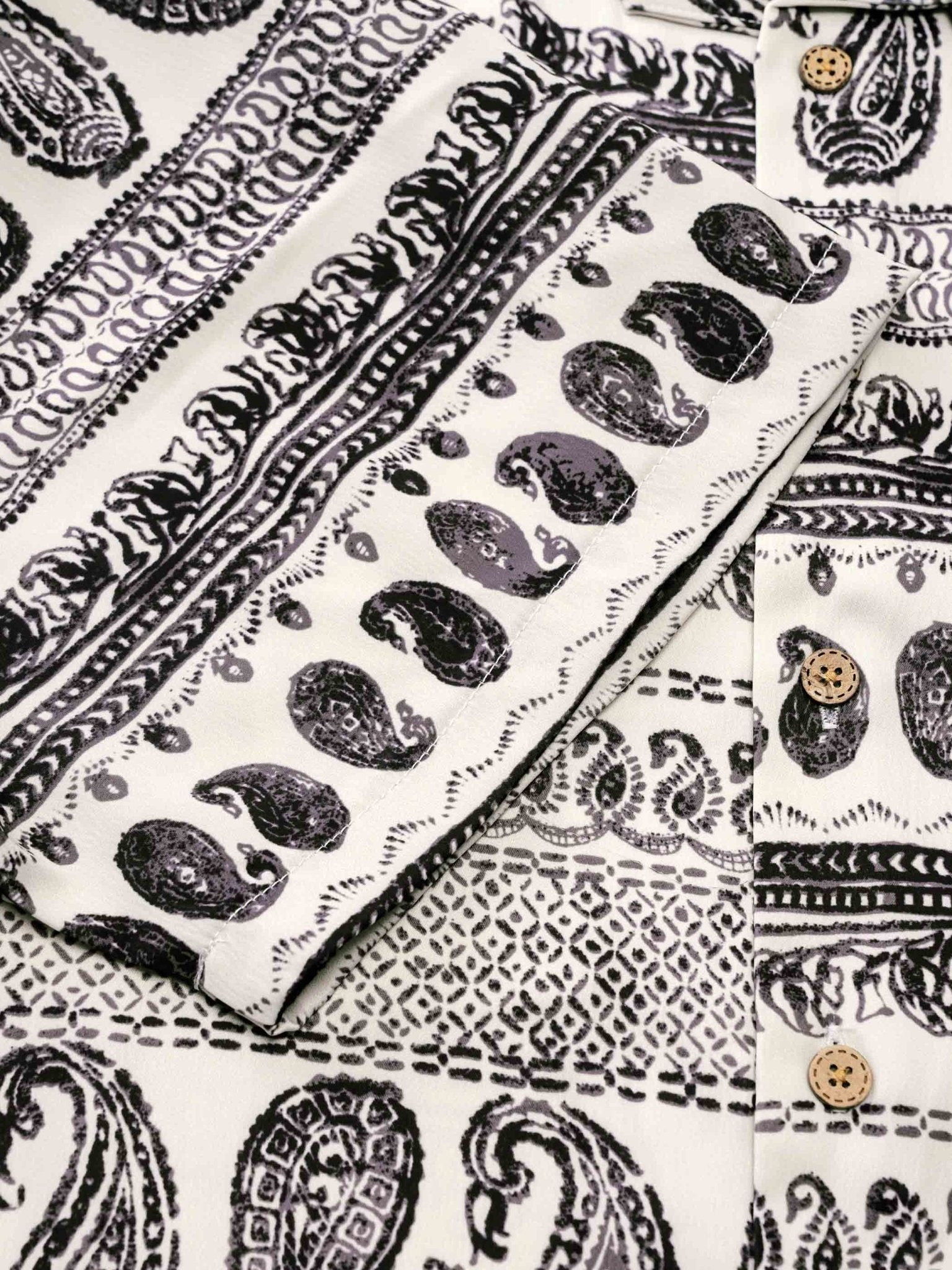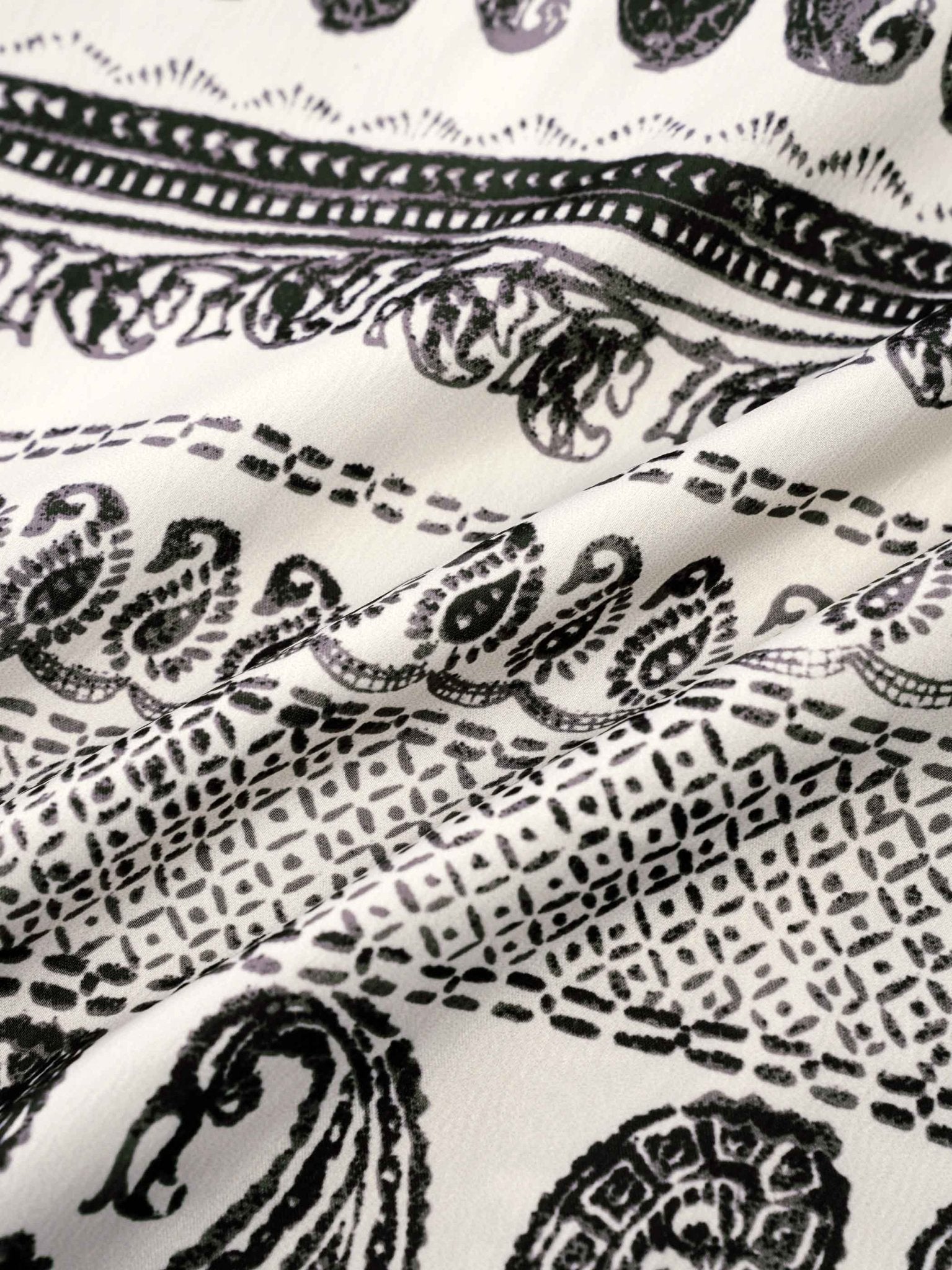 肌触りの細かい質感の素材を使用し、透け感があり、暑い夏でも快適に着用できます。また、ポケット部分のカシューナッツの花柄と切り替えのデザインは、芸術的で創造的な印象を与えます。