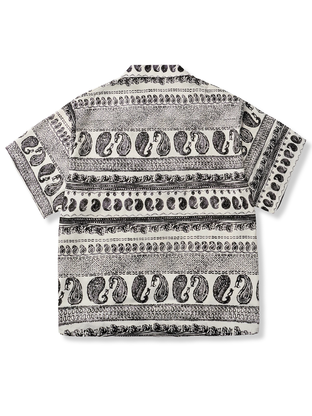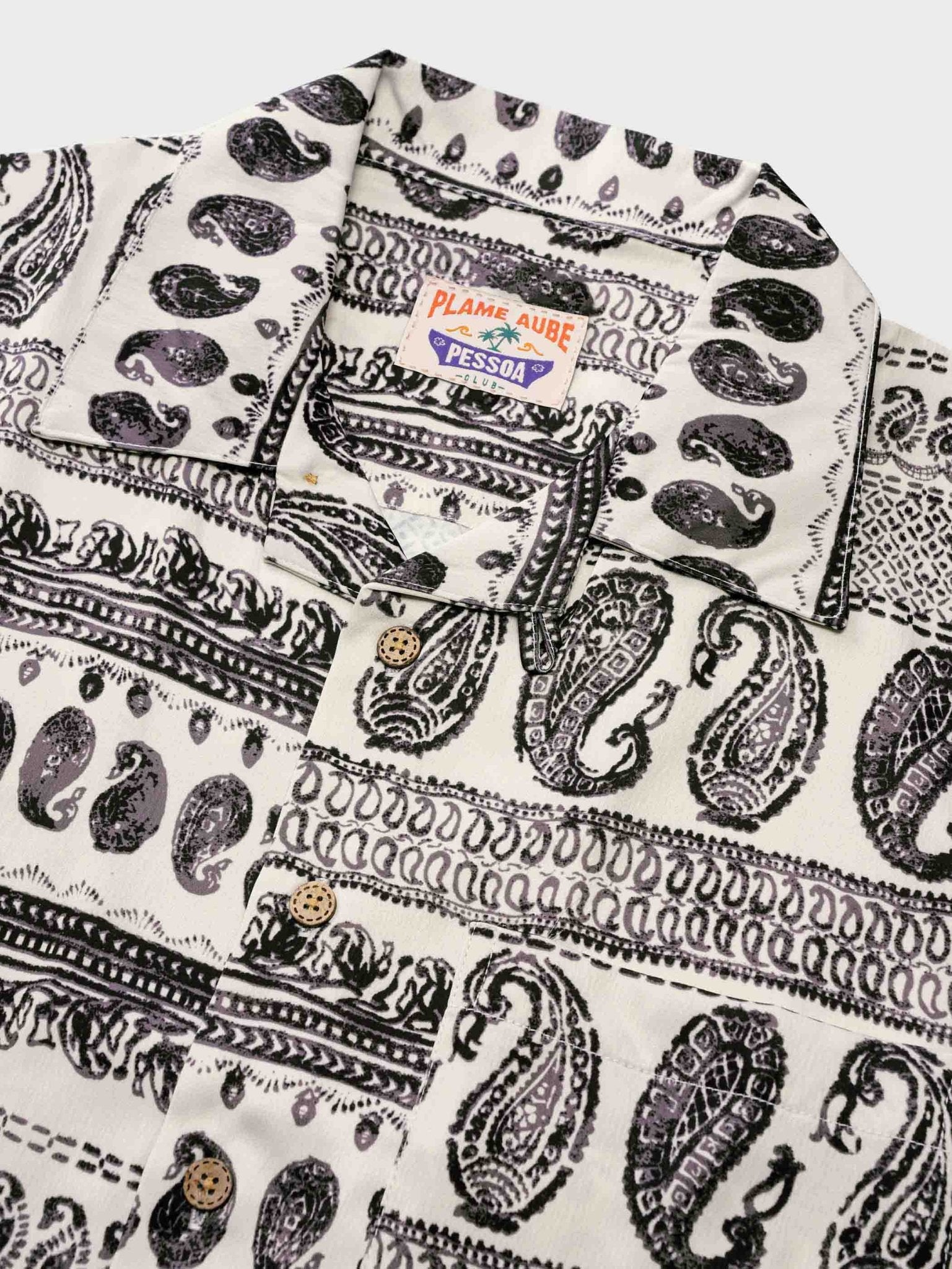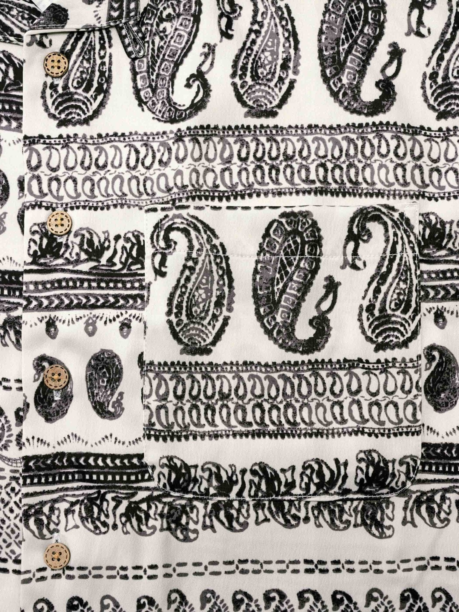 白い地にカシューナッツの花柄を施した夏のハワイアンシャツで、ポケット部分に独自のカットを加え、破壊感と個性を演出しています。伝統的なハワイアンデザインと現代的な要素を融合させ、独自のスタイルを生み出した、ユニークな夏のハワイアンシャツです。