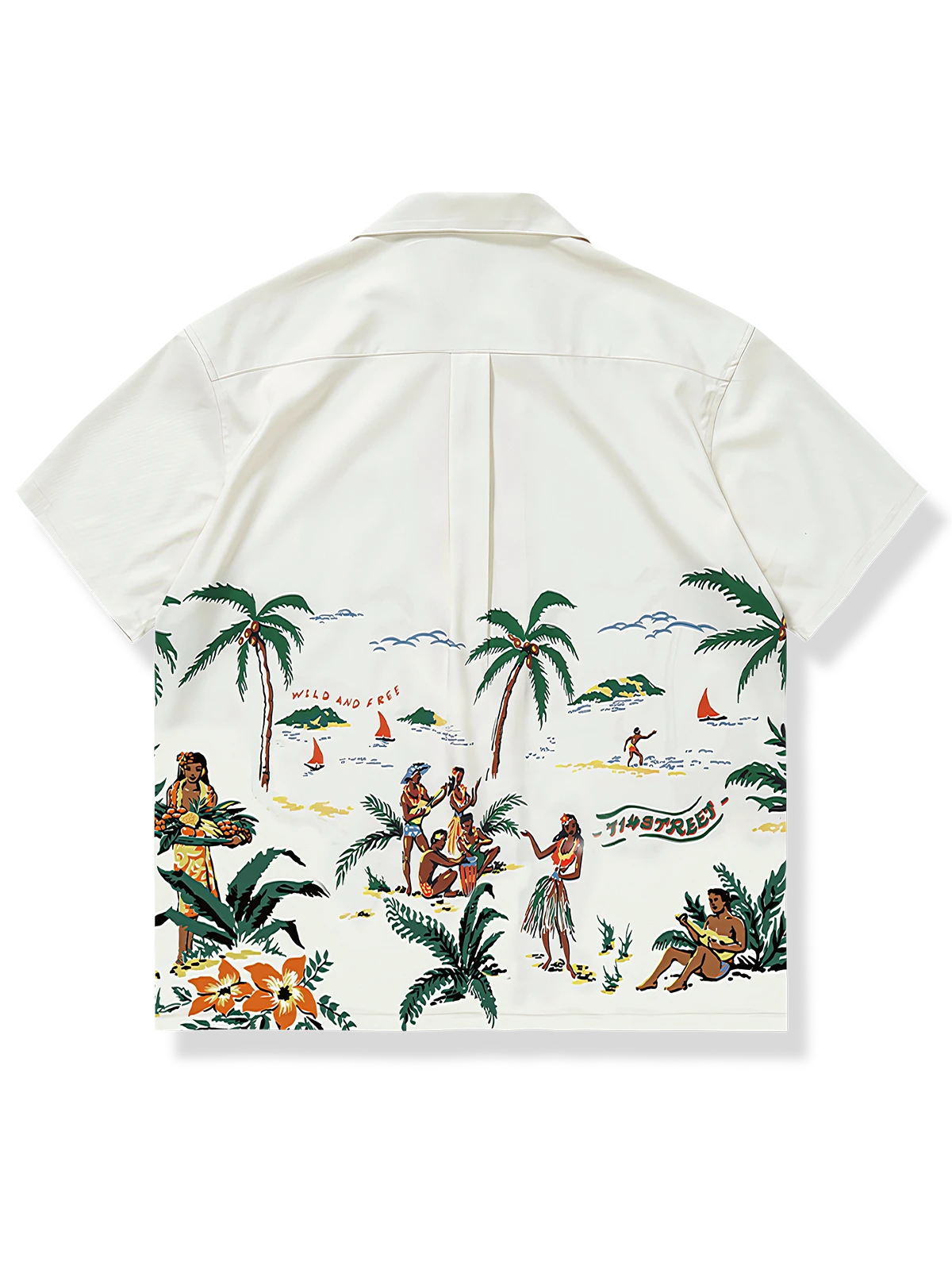 デジタルプリント技術を使用し、アイボリーのベースカラーにビーチやヤシの木をテーマにしたレトロなハワイの風景を表現し、夏の雰囲気に溢れています。