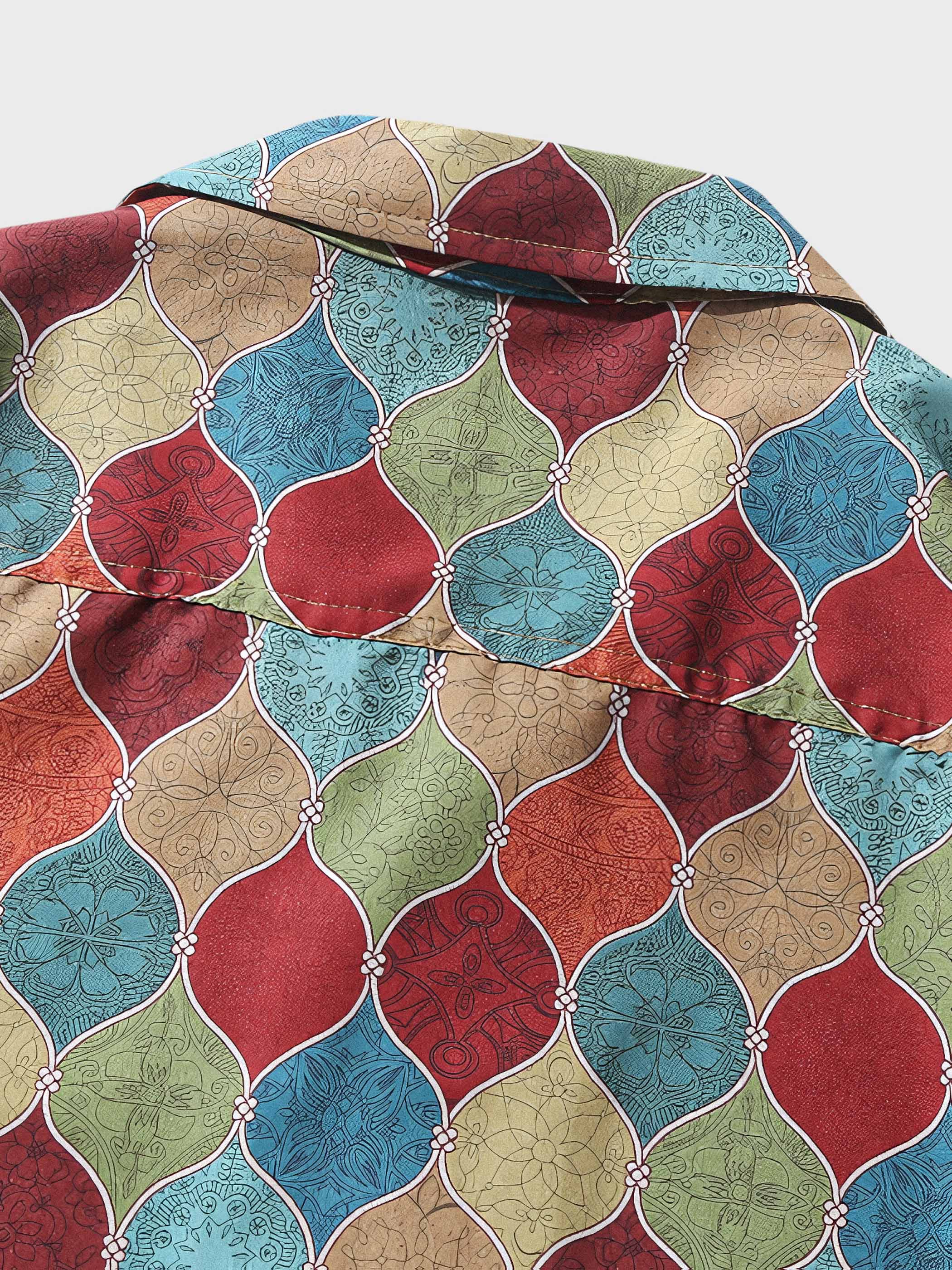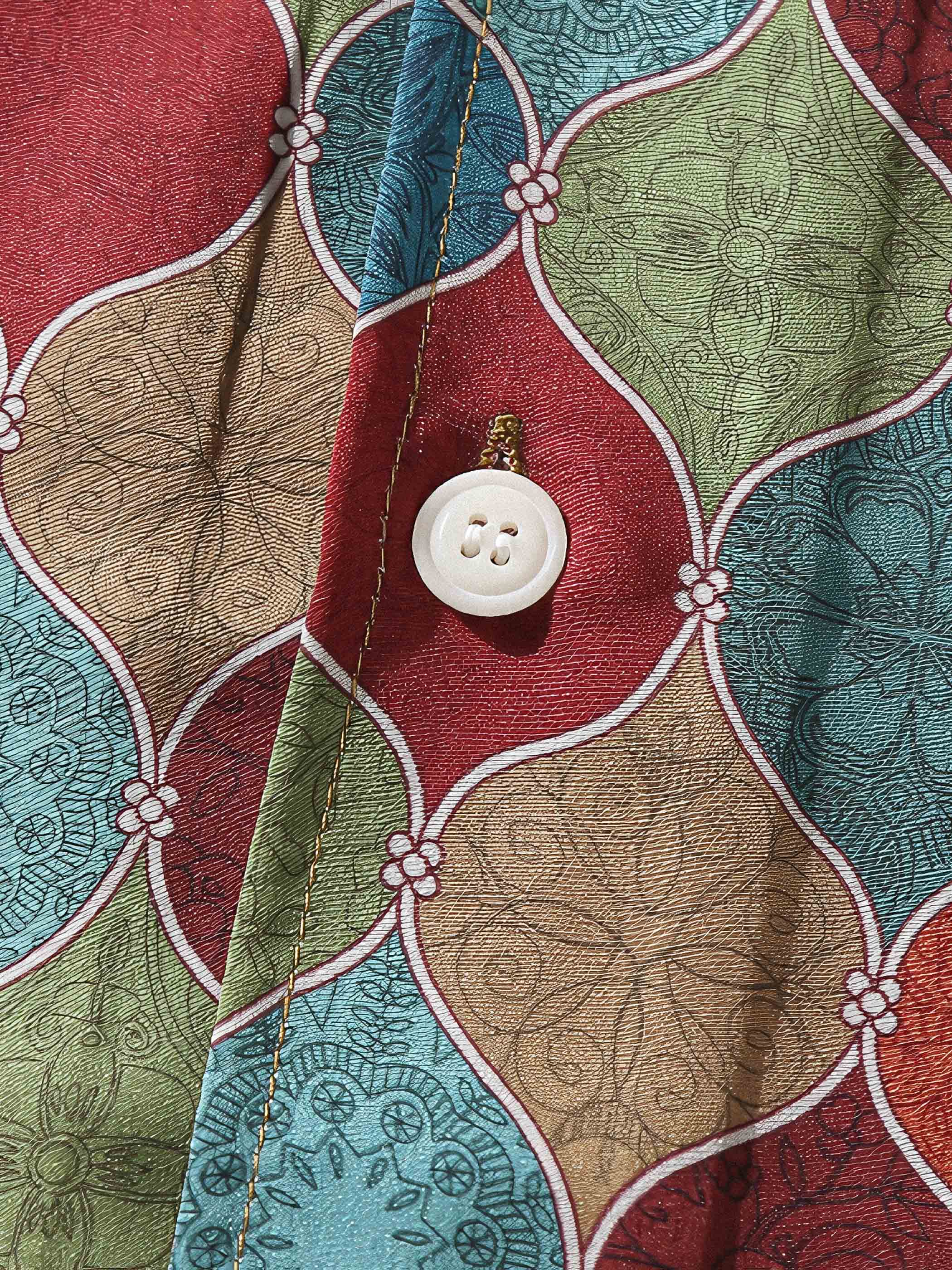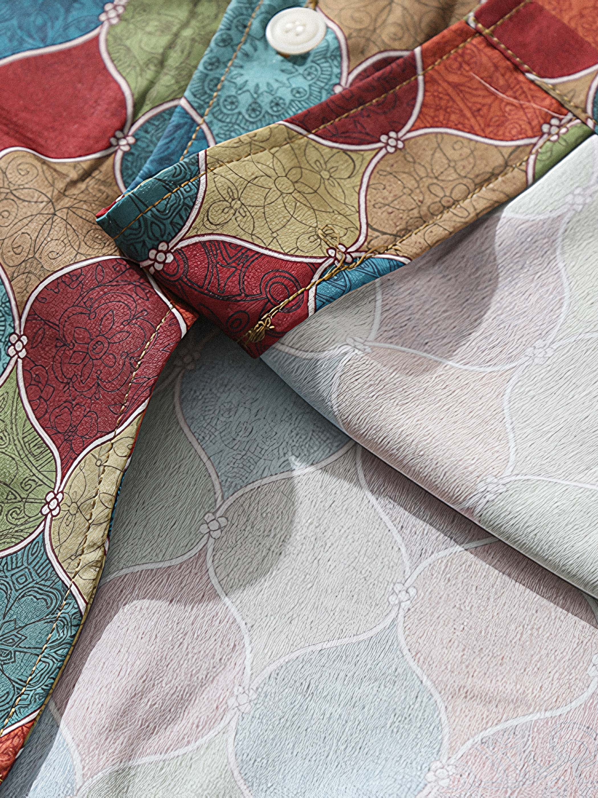 シャツの各色ブロックには細かいボディにボヘミアン風のパターンが施されており、デザインのディテールと質感が高品質の工芸とデザインを表現しています。細かいステッチと繊細な仕上げにより、シャツは耐久性があり、全体の質感を向上させます。胸ポケットは実用性を持ち、小物を簡単に収納することができるだけでなく、おしゃれな印象も与えます。