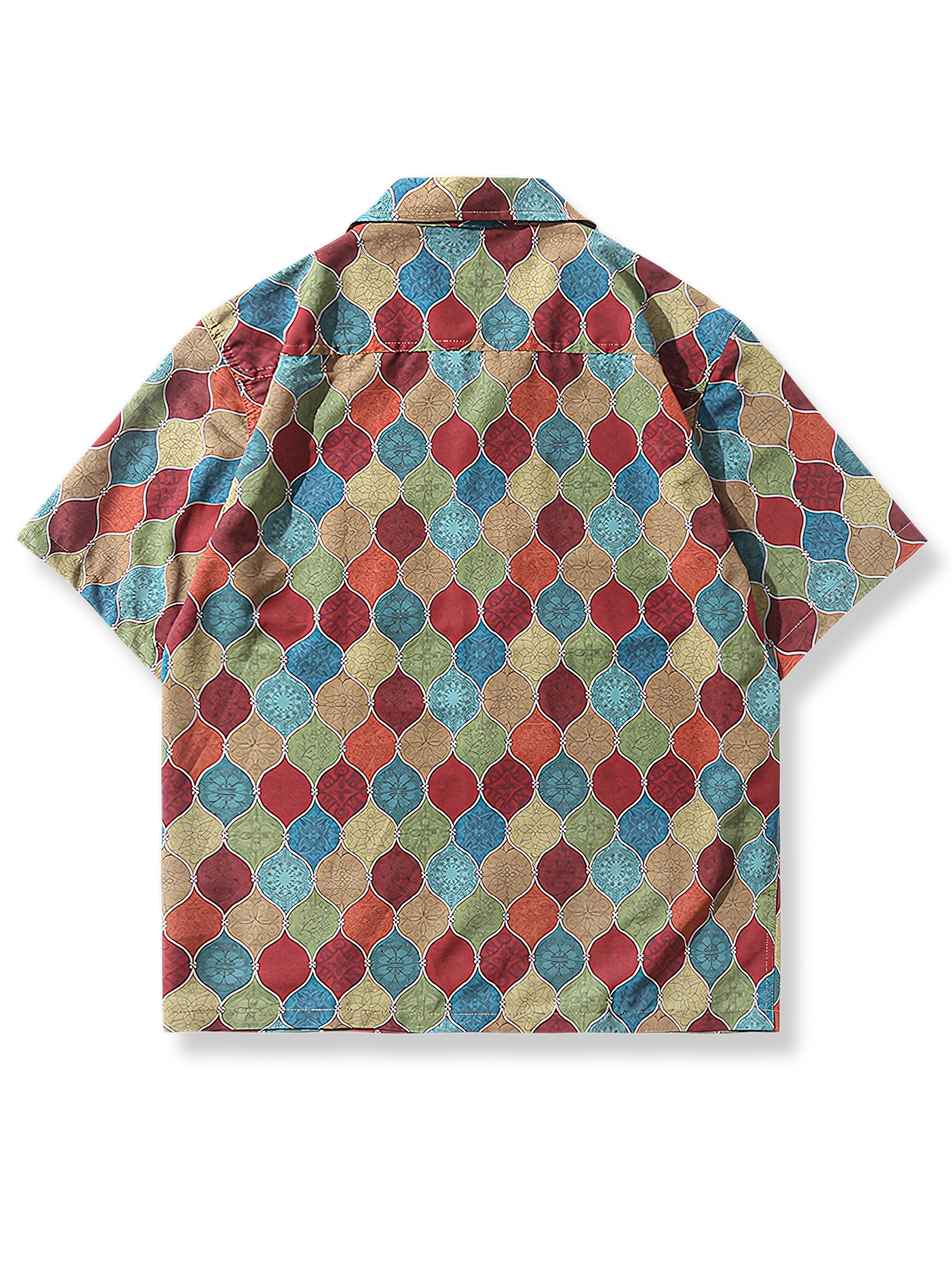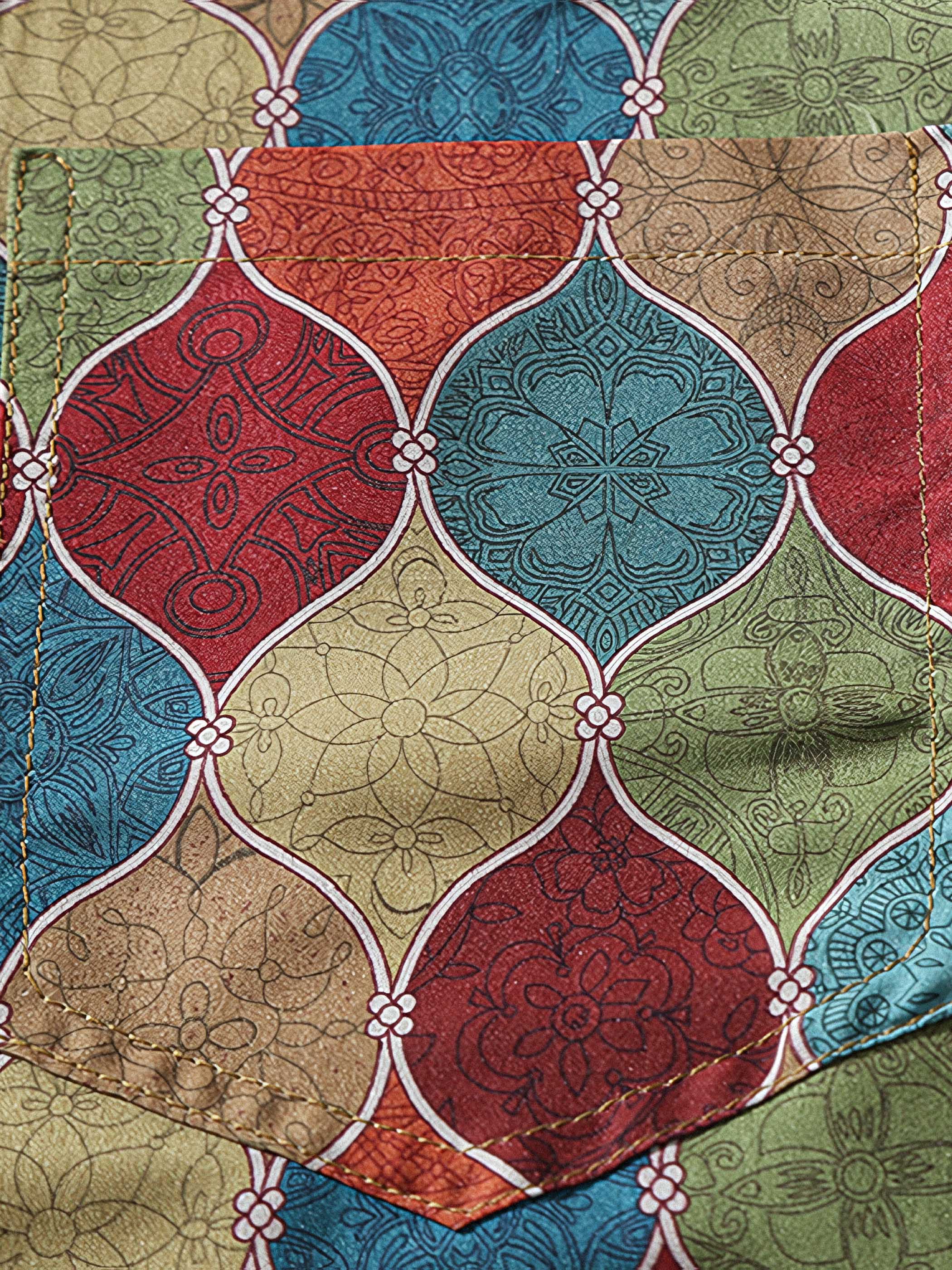 ボディにボヘミアン風プリントを使用しており、自由な精神やカラフルなデザインが特徴です。花や葉っぱ、鳥など自然をモチーフにした柄が多く使われています。色使いにもこだわりがあり、鮮やかな色やコントラストの強い組み合わせが目立ちます。各色ブロックには独特なデザインが取り入れられています。このデザインは鮮明さ、活力、およびファッション感を表現し、人々の注目を集めます。胸ポケットは実用性とデザイン性を高め、シャツ全体の豊かさを引き立てます。