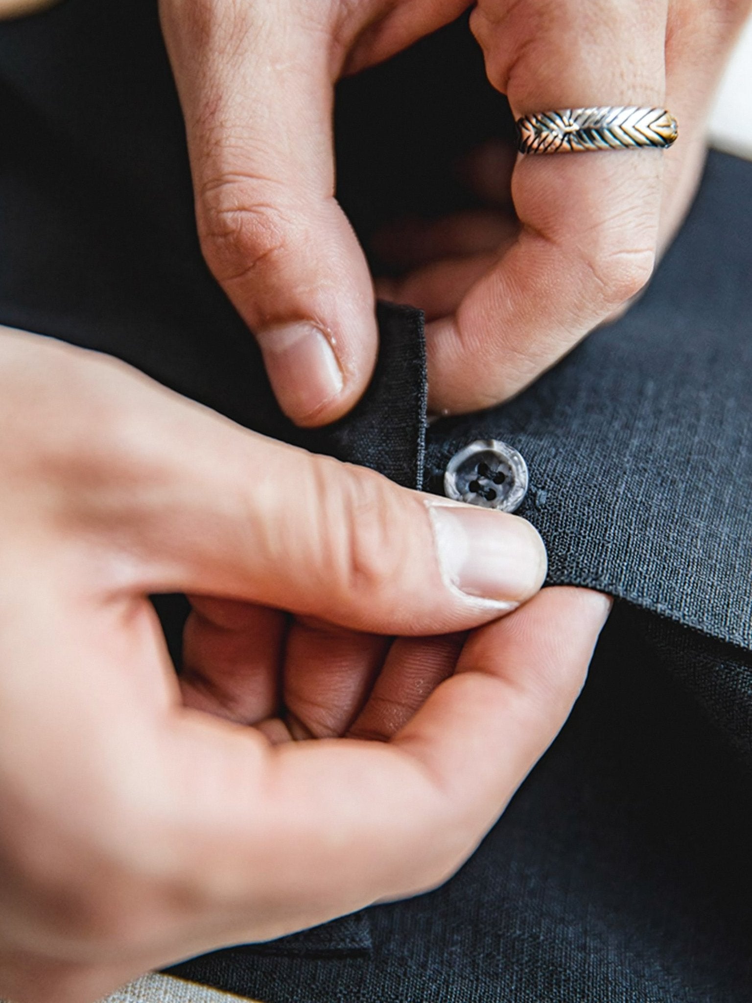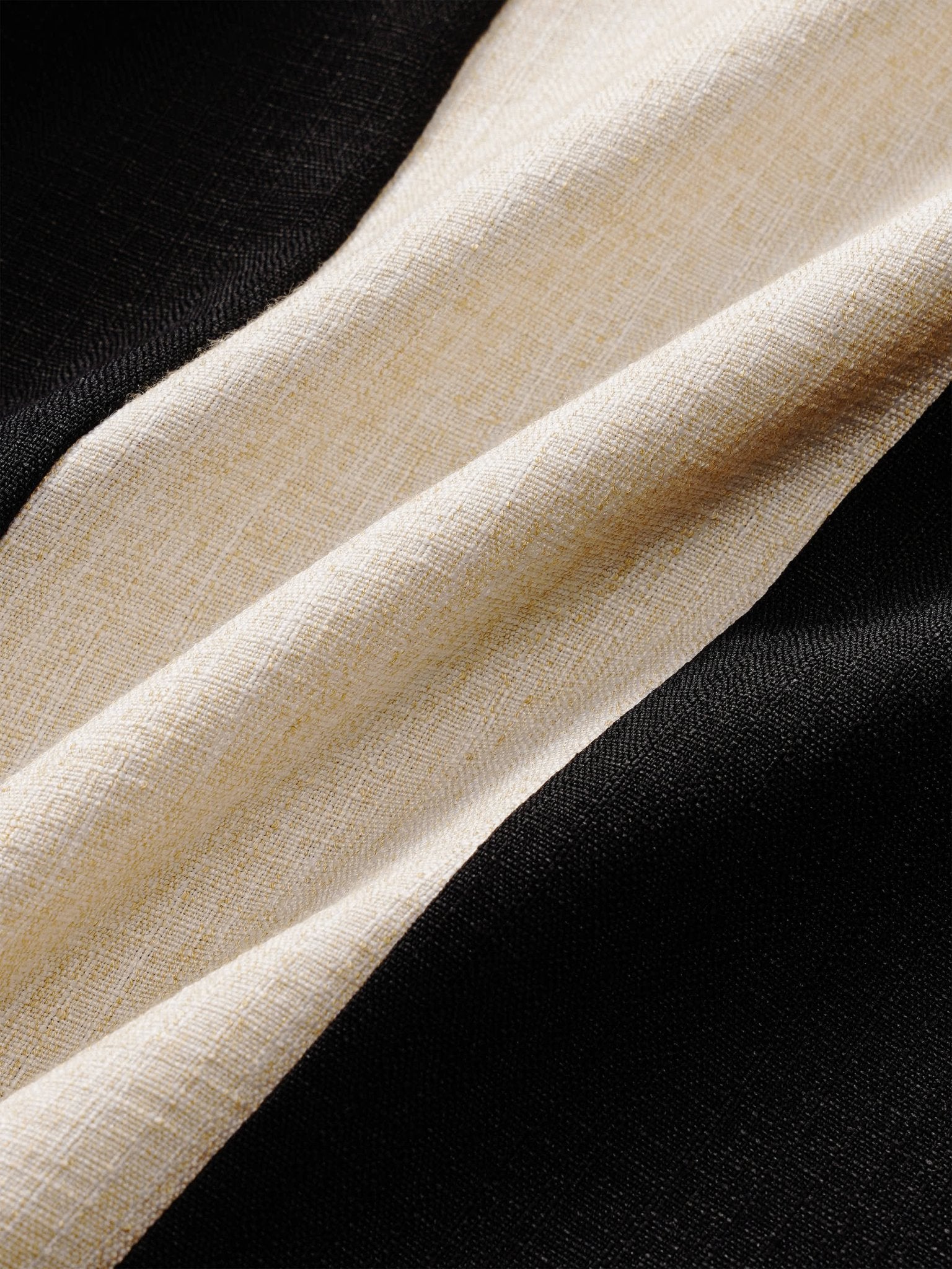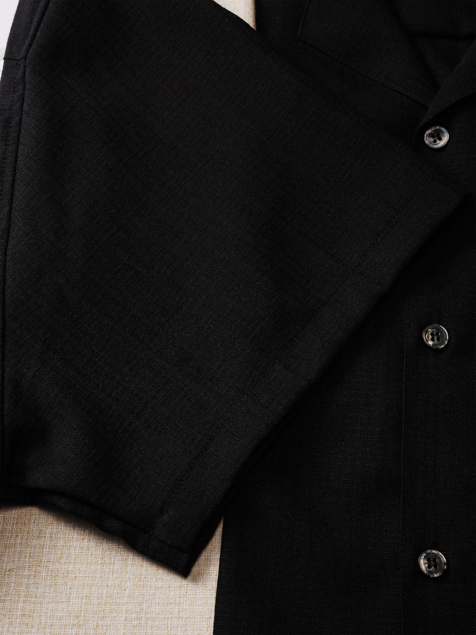 経糸にベージュ色、横糸に白を使用した生地は、糸染め織物による軽さと柔らかさを兼ね備え、独特な霜降り感と光沢感が特長です。また、平織手法をナチュラルリネンのタッチを残すために柔らかく生地になじむ加工、ウォッシュ加工でヴィンテージの風合いを演出しています。