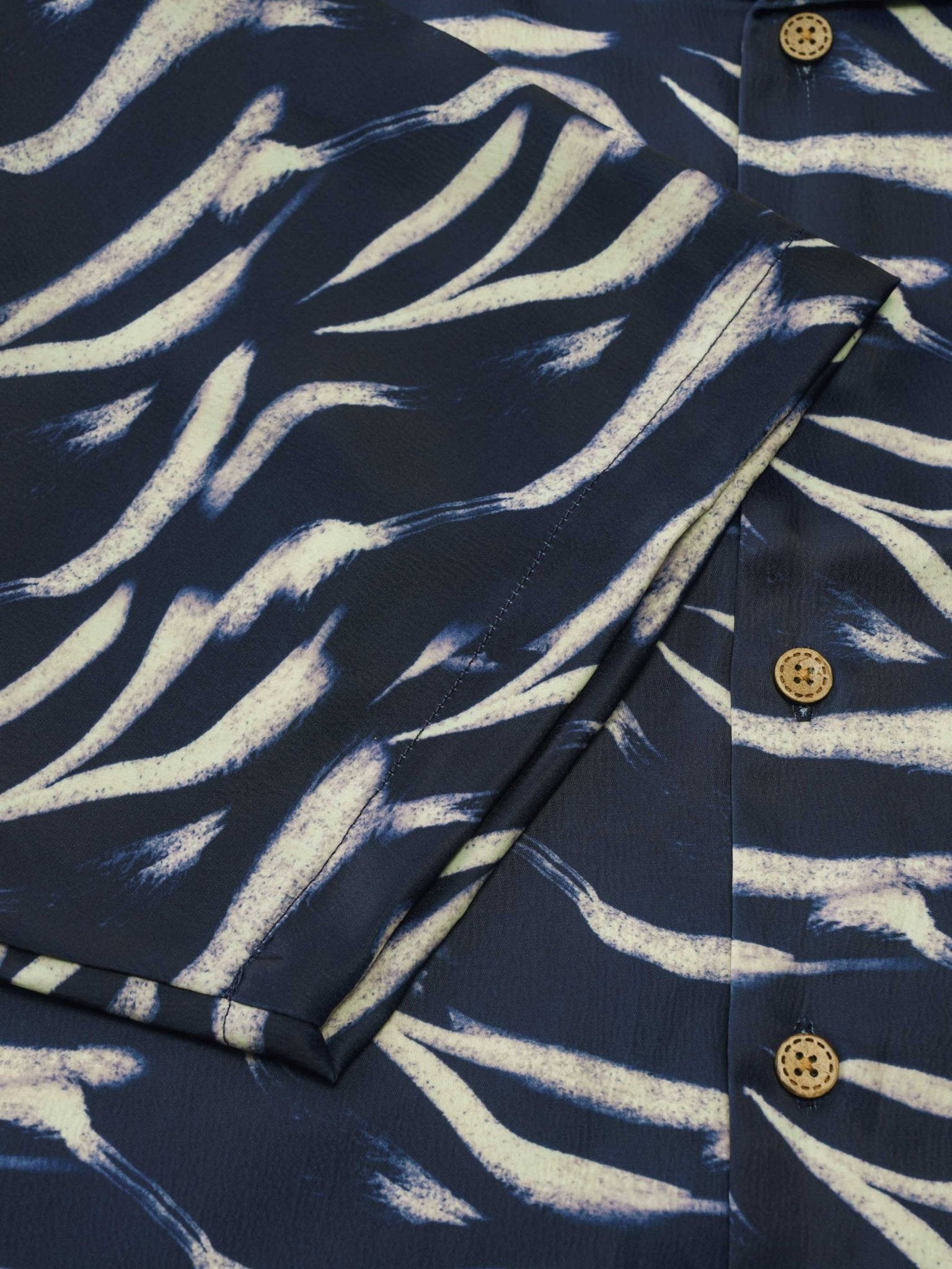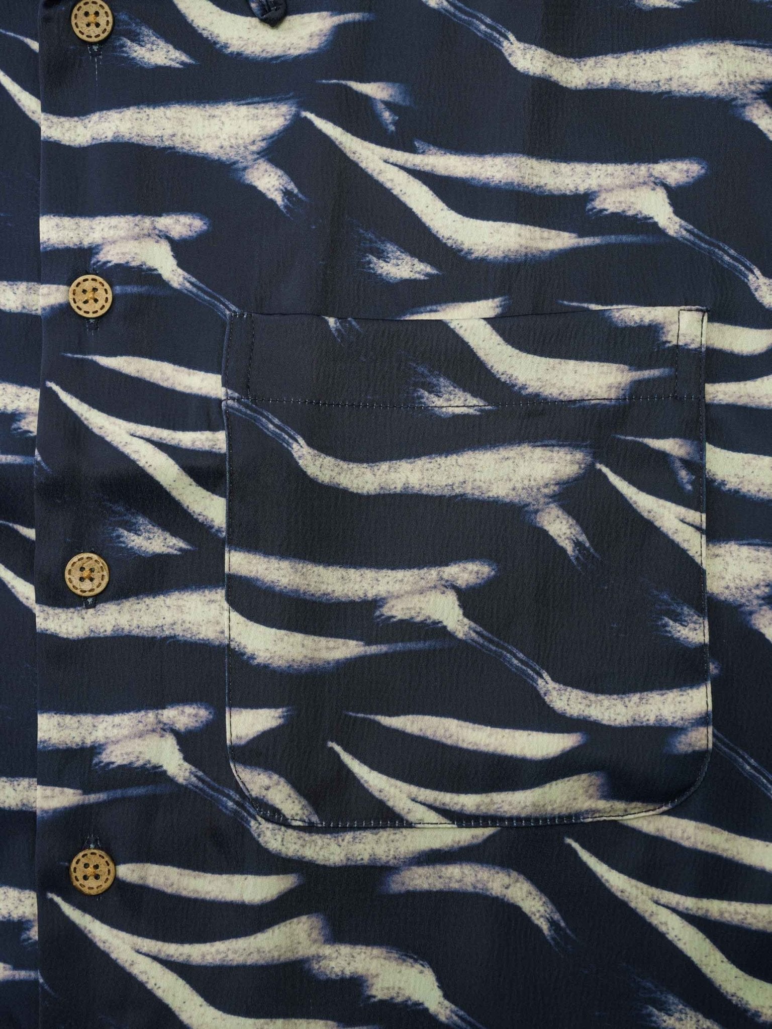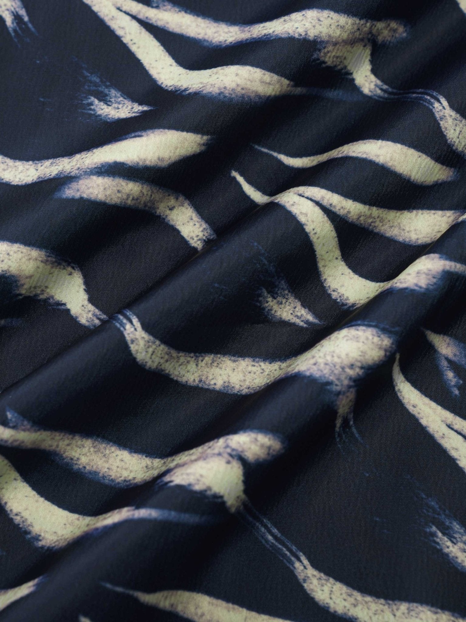 拔染の手法によって生み出された柄は、線がくっきりとしており、色の濃淡が視覚的な奥行きを演出しています。また、素材に微細な肌理があり、蒸し暑い夏でも快適に着用できます。