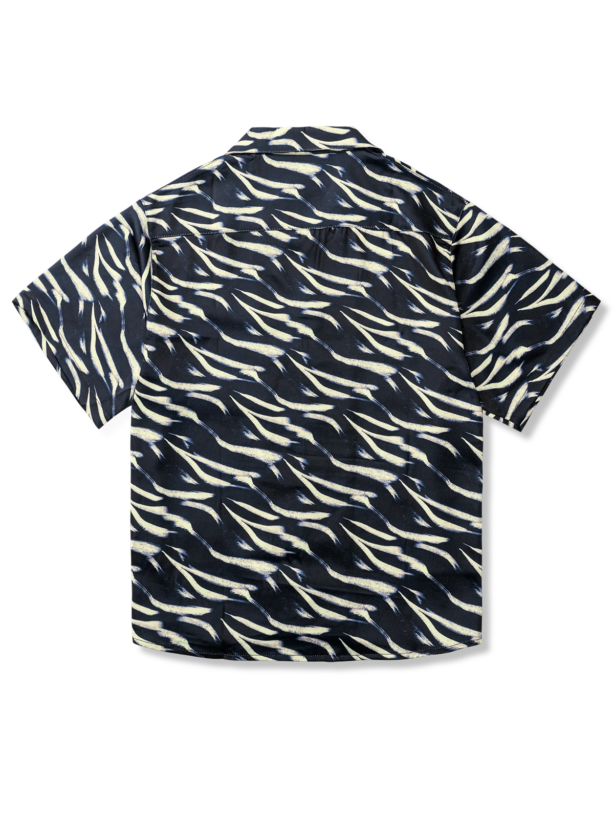 クラシックなキューバ襟が採用され、サイドスリットがなく、曲線を描く裾になっています。全体的にゆったりとしたシルエットで、リラックスした着心地で、夏のカジュアルスタイルにぴったりです。