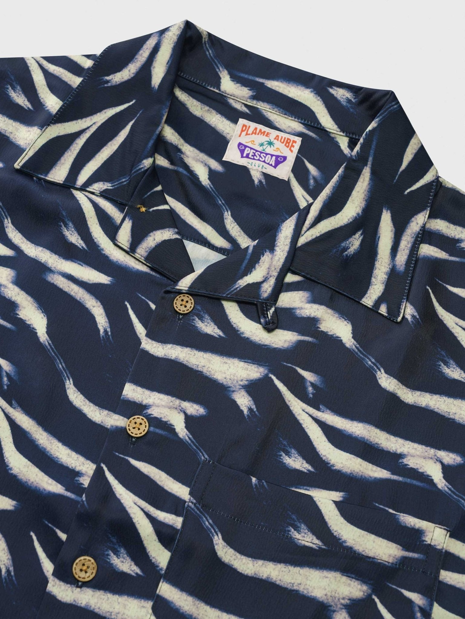 テキスタイルアートの一種である拔染の手法を使って作られました。ブルーの布地に、手描き風の染色が施され、ユニークな手作り感が表現されています。他のシャツとは異なる、個性的なデザインが魅力です。