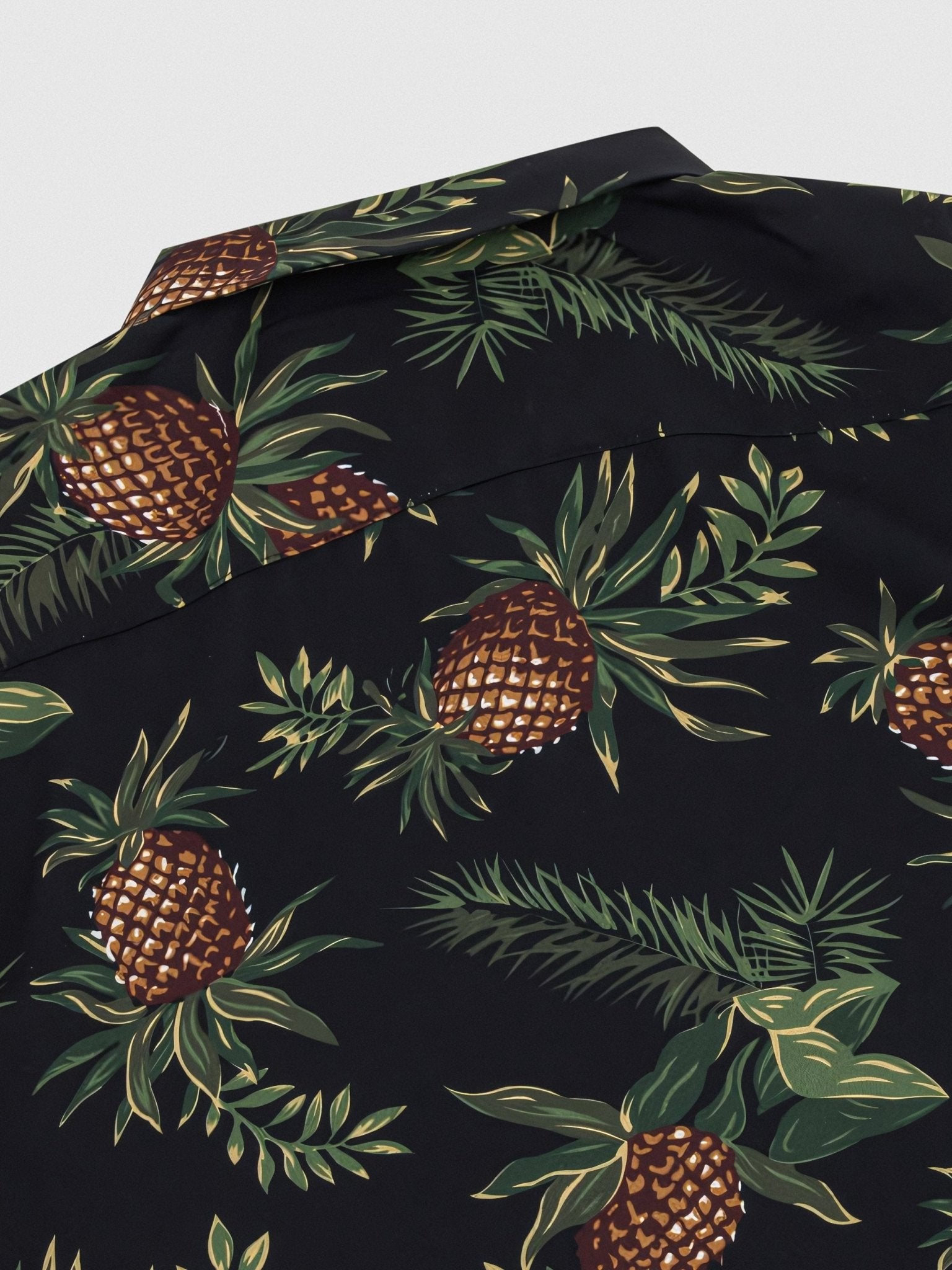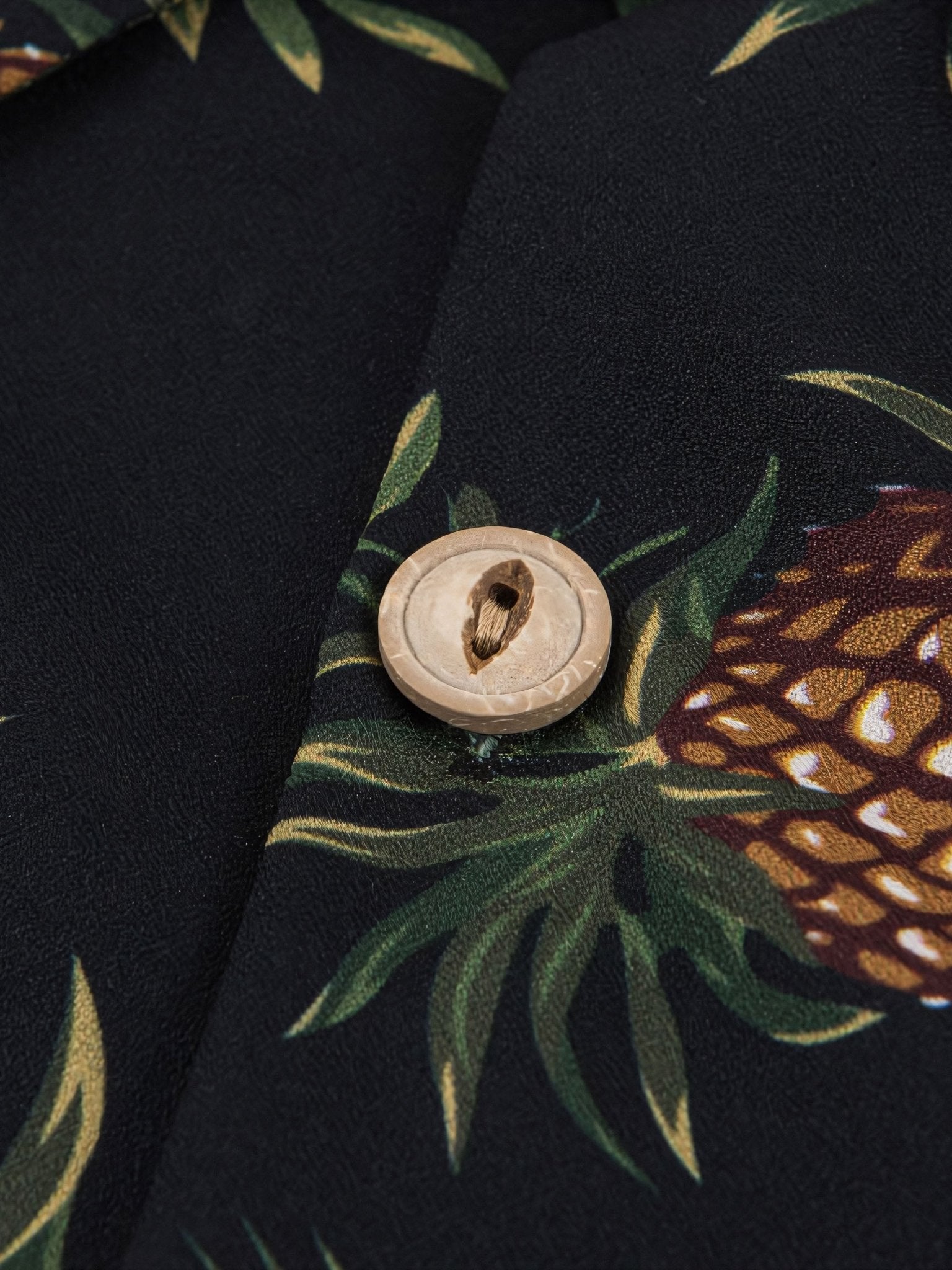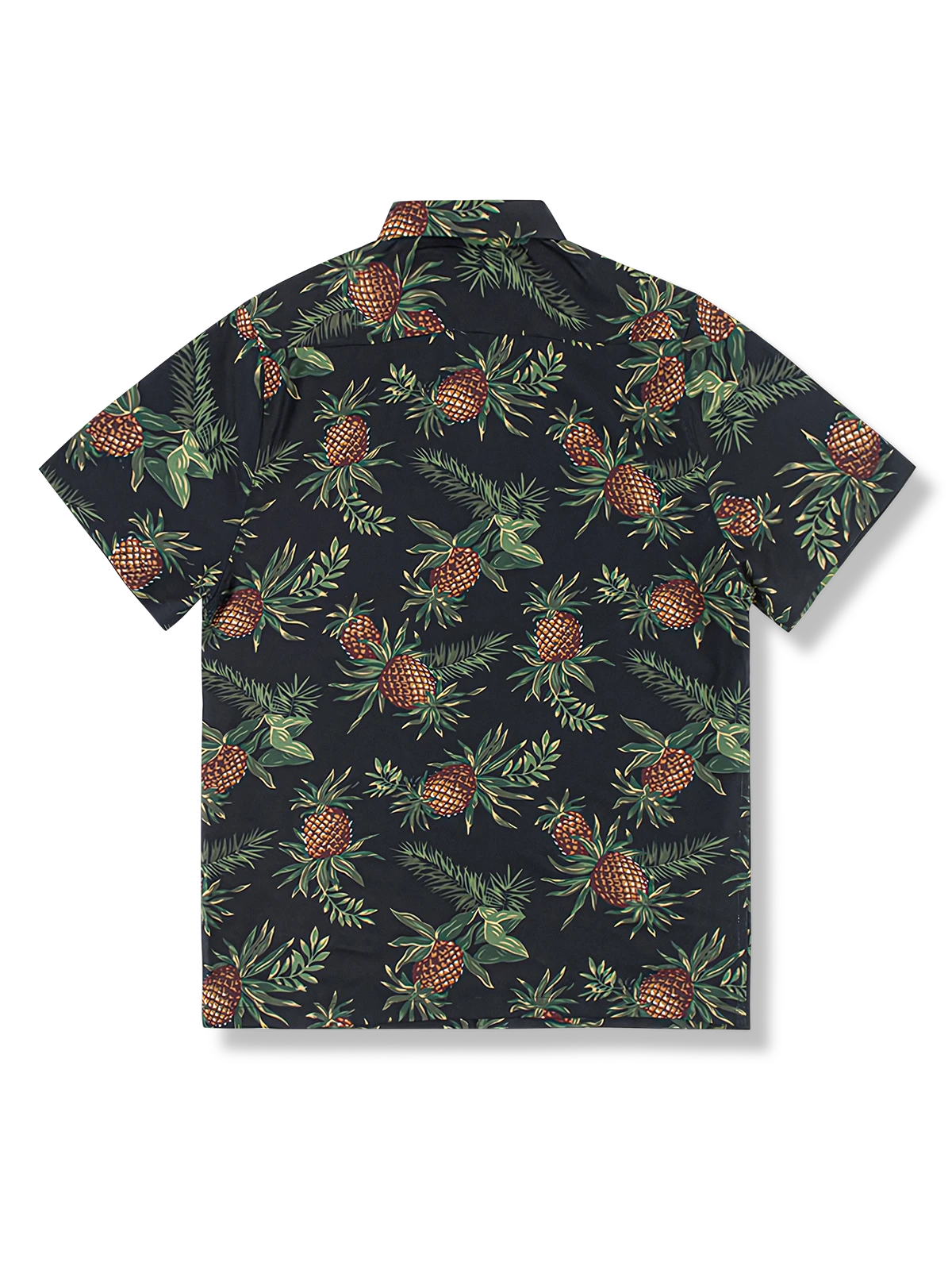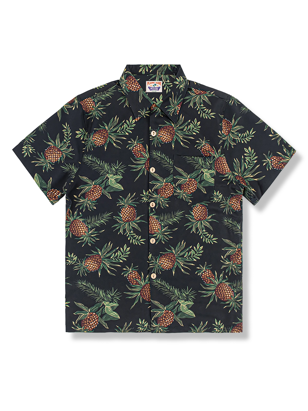 このアロハシャツは黒をベースとして、爽やかなパイナップル柄が使用されて、夏の清涼感とリラックス感を感じさせます。