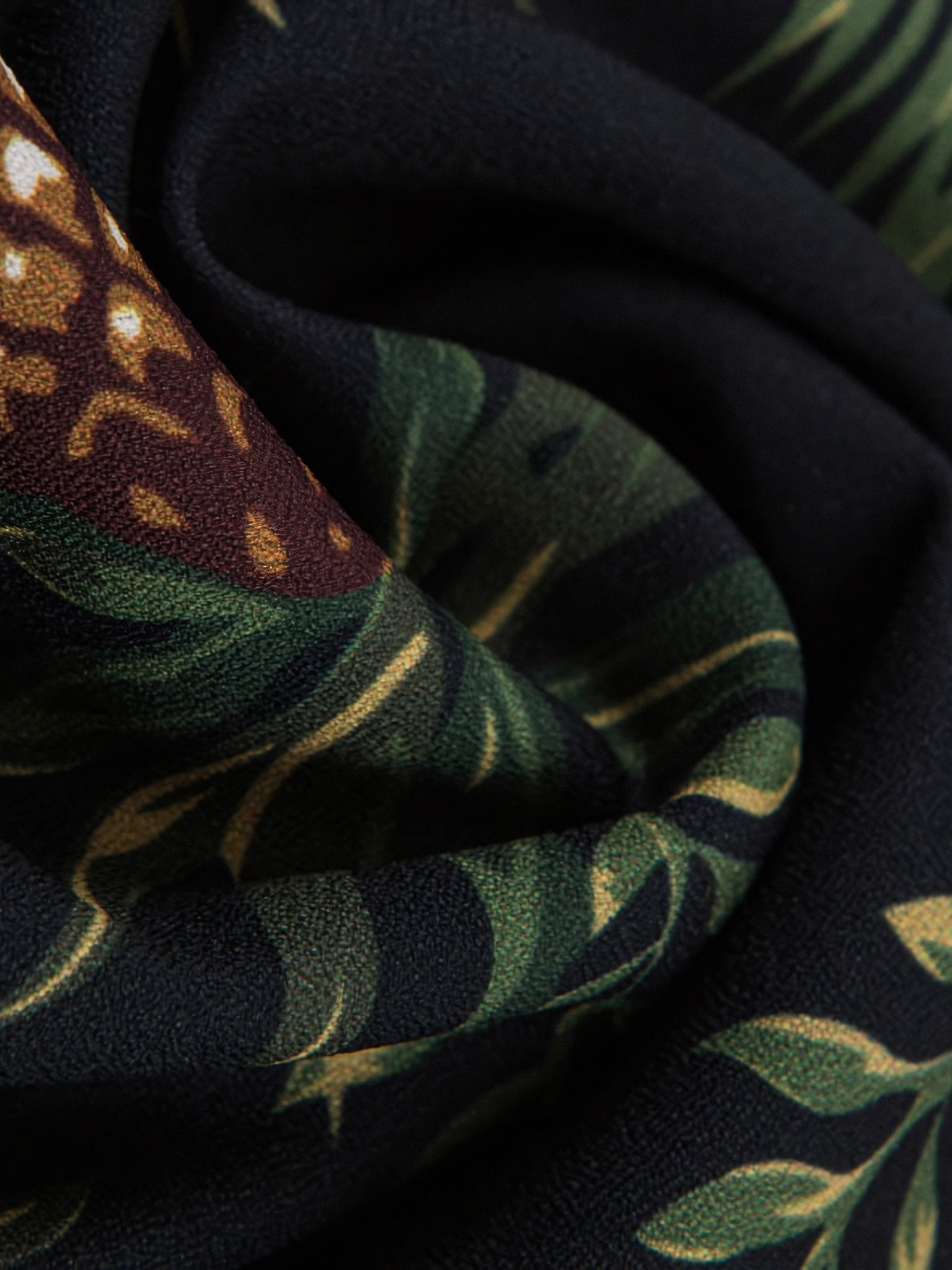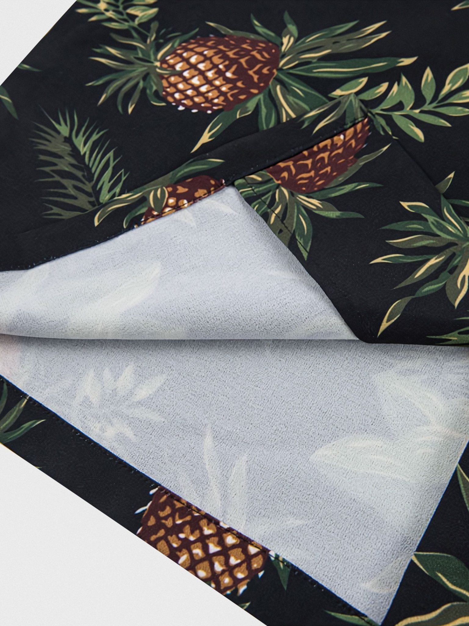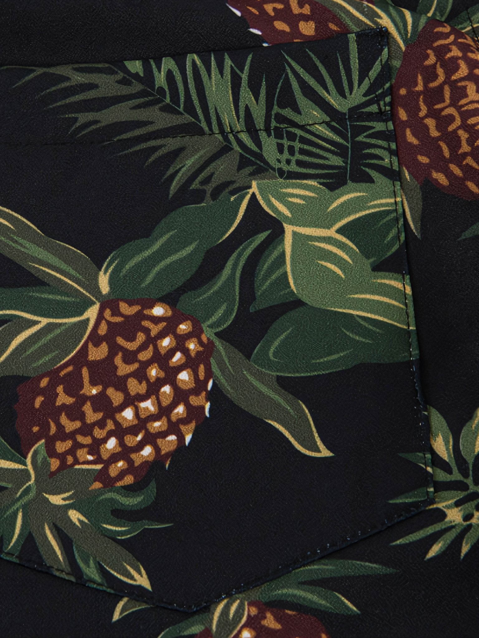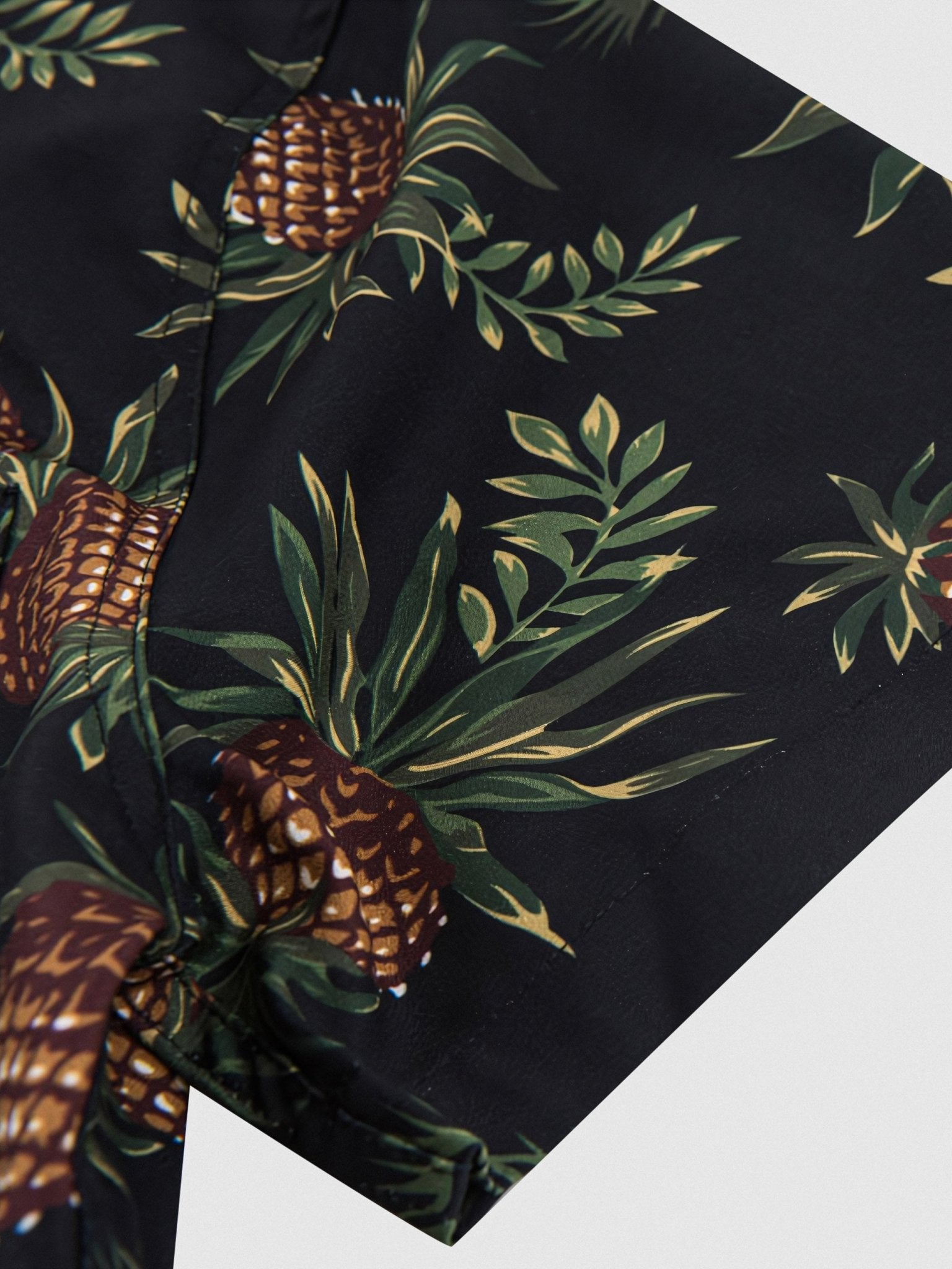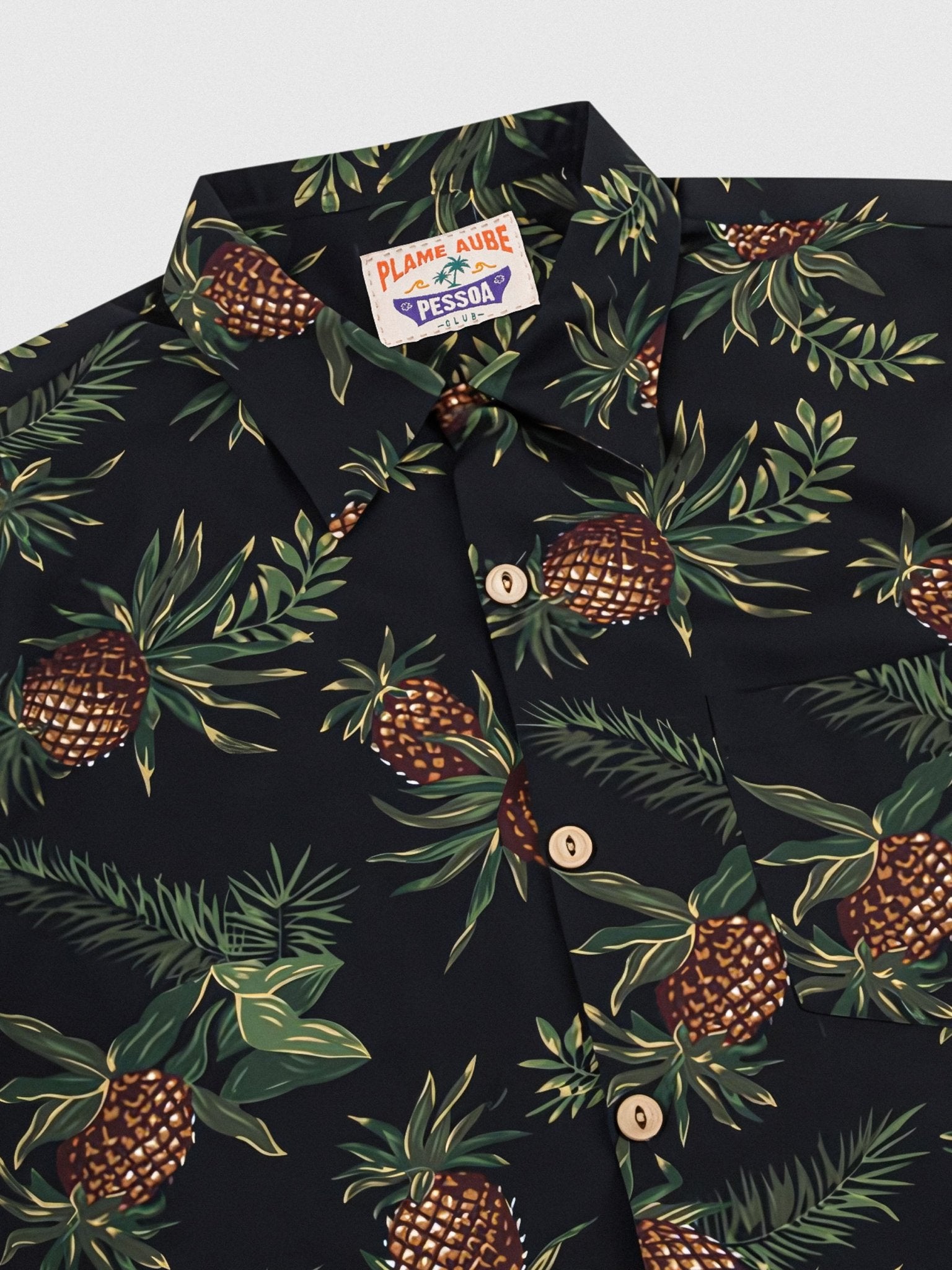 このアロハシャツは黒をベースとして、爽やかなパイナップル柄が使用されて、夏の清涼感とリラックス感を感じさせます。