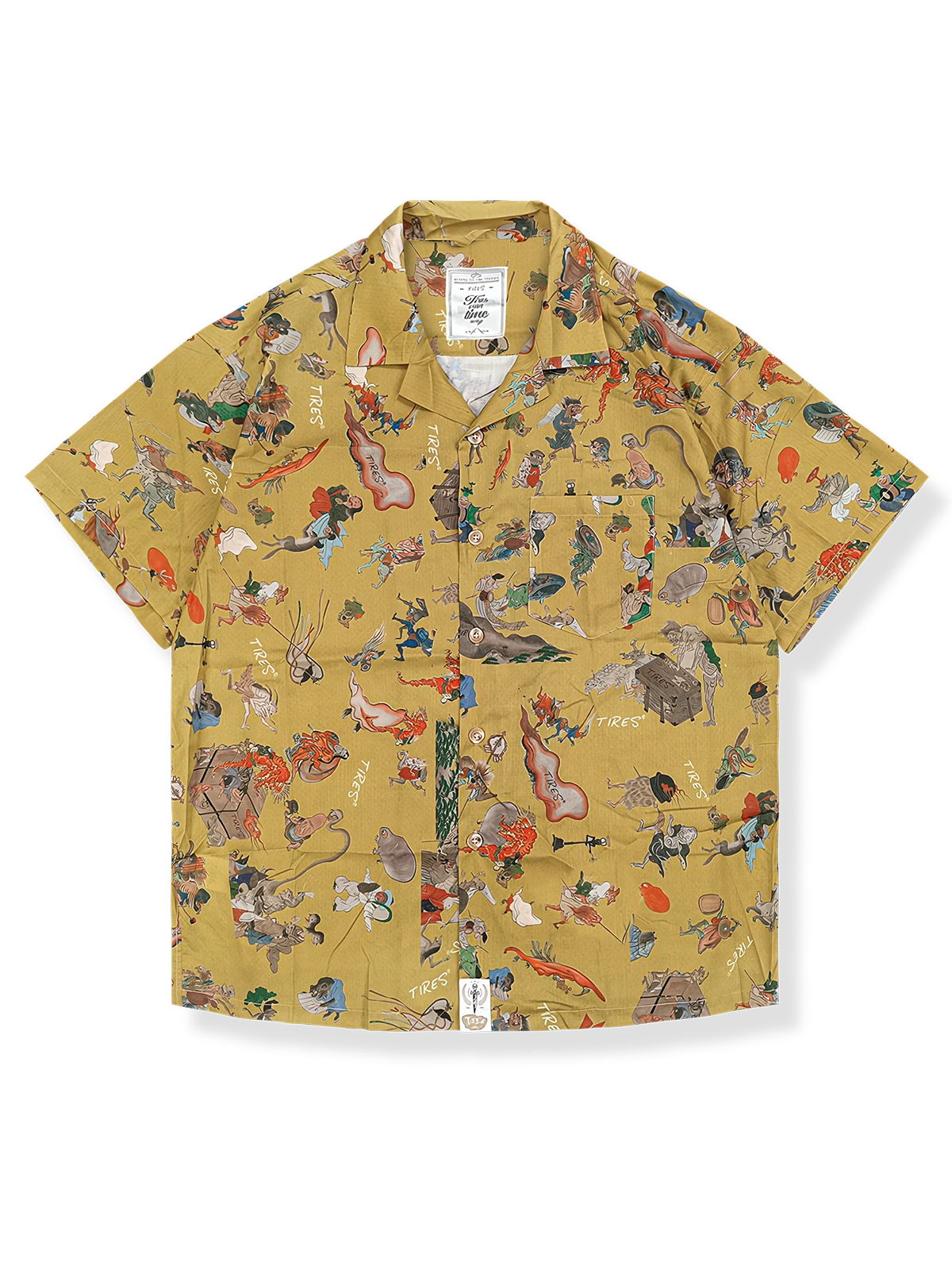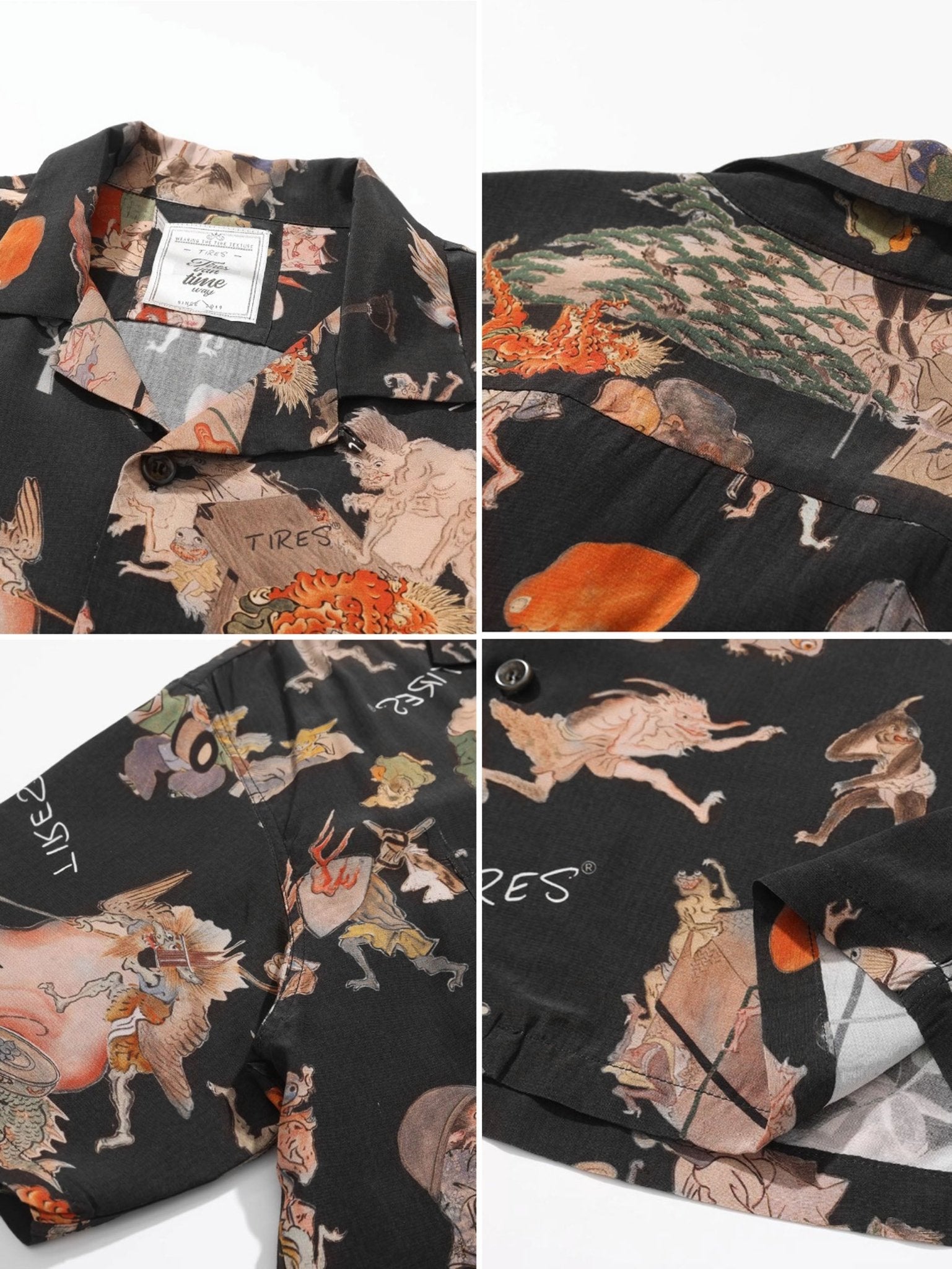 日本の妖怪要素を取り入れつつも、クラシックなキューバカラーとシングルポケットのデザインが残されており、全体にユニークなスタイルが加わっています。ハワイのトロピカルな雰囲気が感じられます。柄には妖怪が描かれ、ユニークな光景は活気に満ち、まるで人間のような忙しい夜の生活のようです。