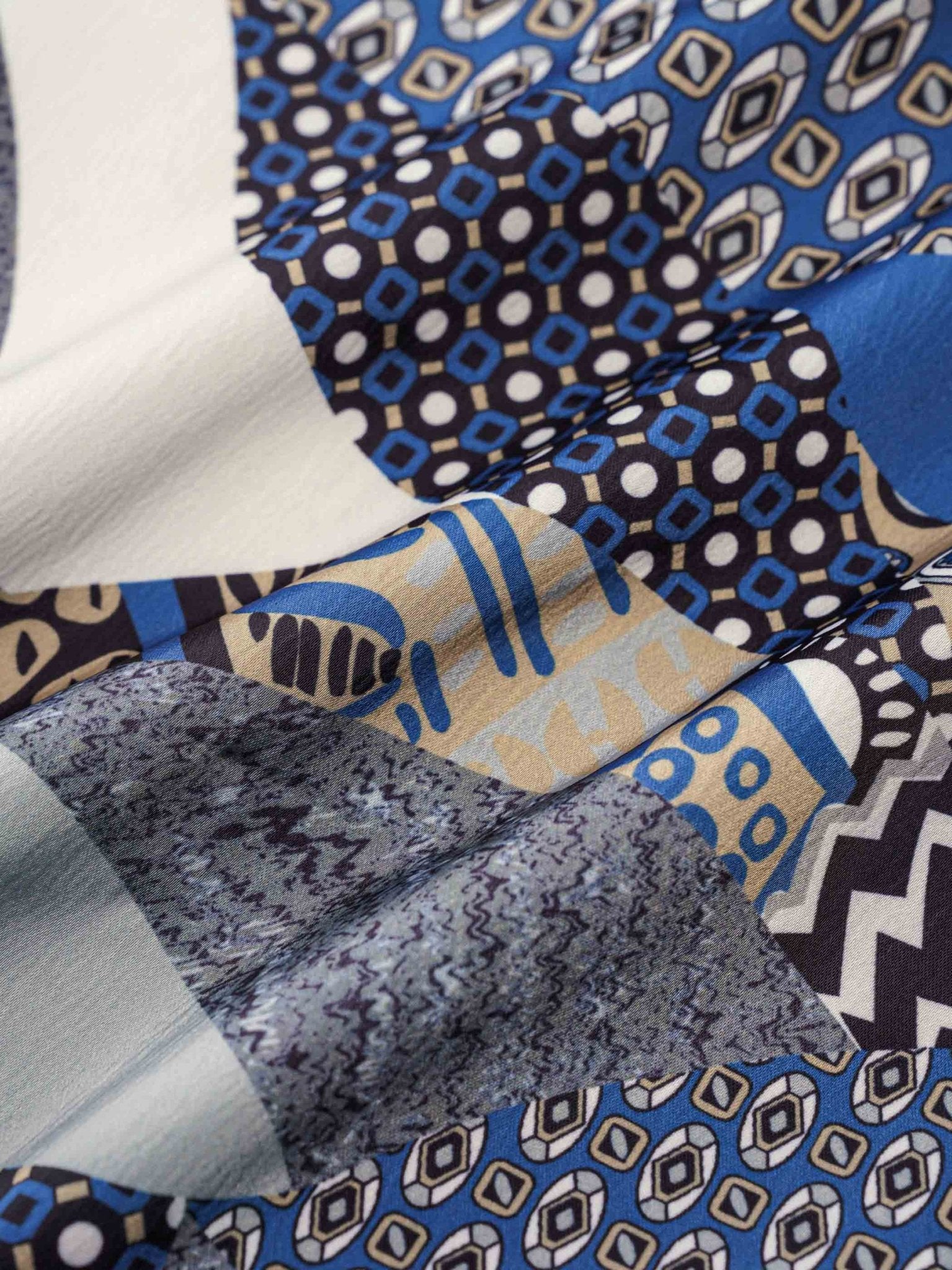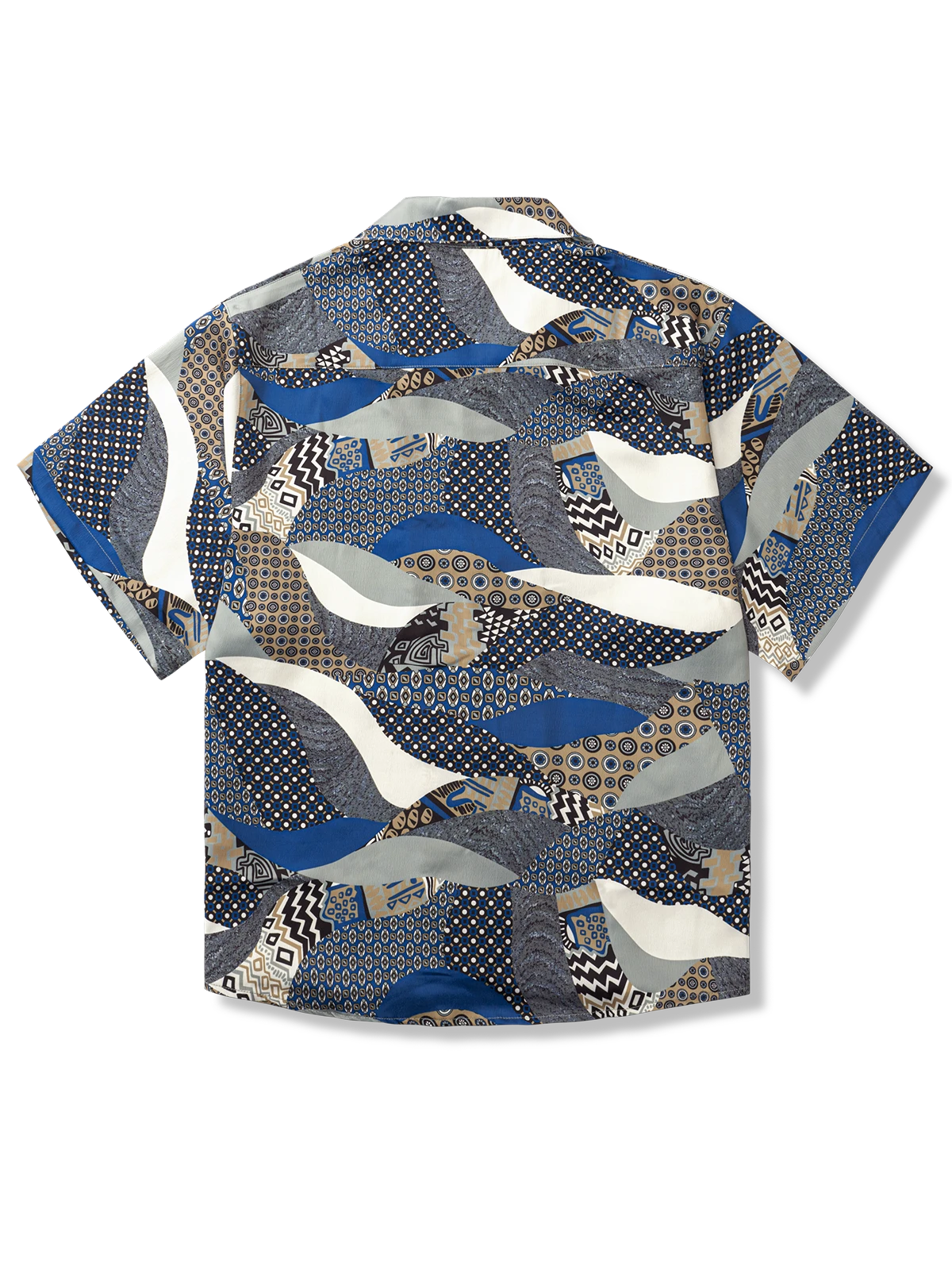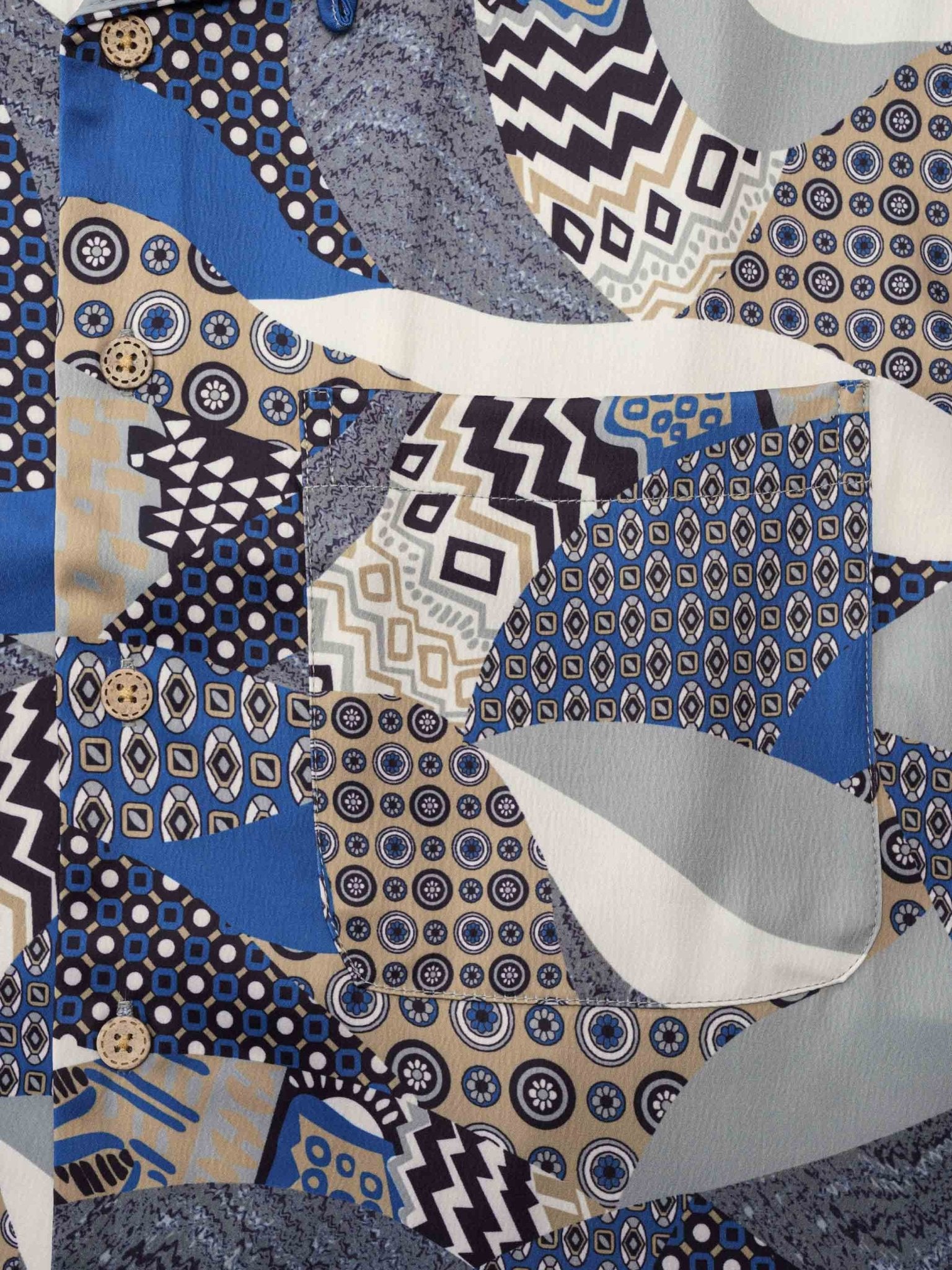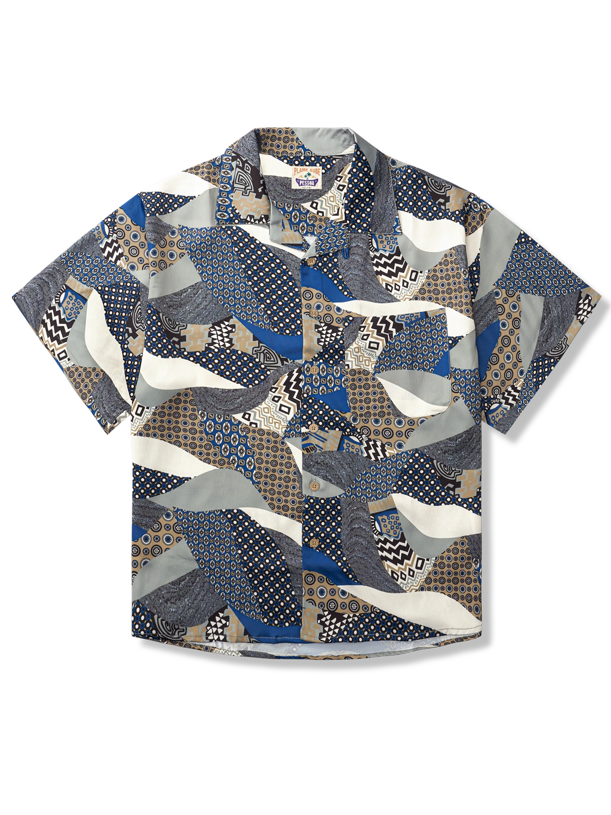 このシャツは、ブルー、グレー、ベージュの相互のパッチワークデザインを採用しており、レトロな木製のボタンが加わって、濃厚なレトロ感を漂わせています。