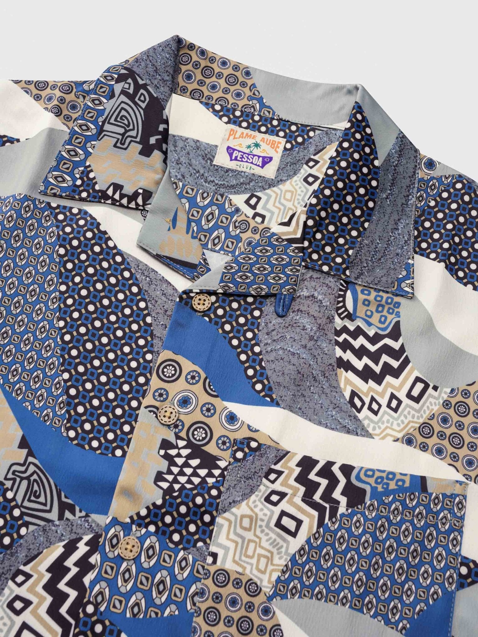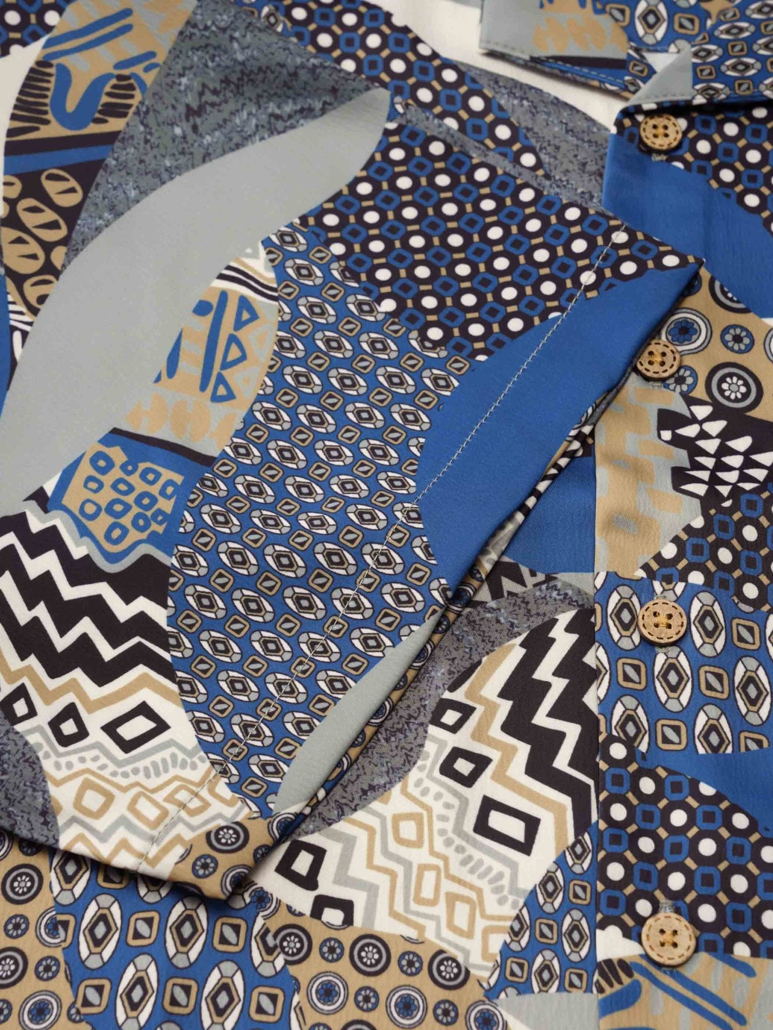 シャツのボタンにはレトロな木製ボタンが採用され、シャツ全体に独特の魅力を添えています。パッチワーク部分には、レトロな模様もあります。