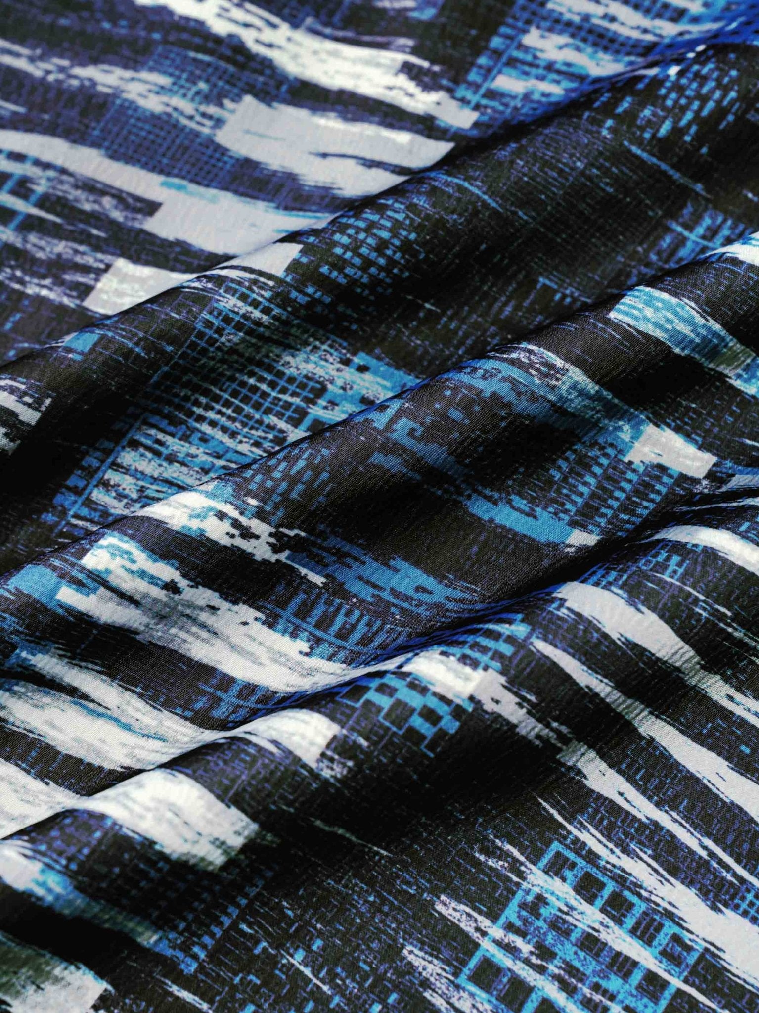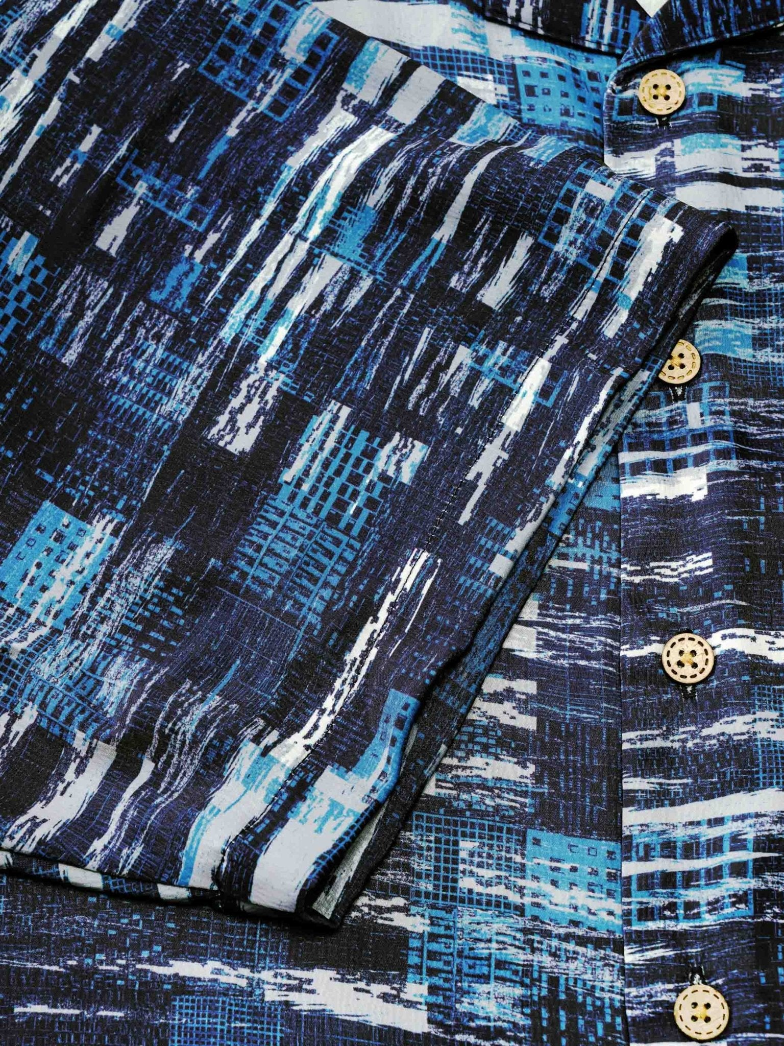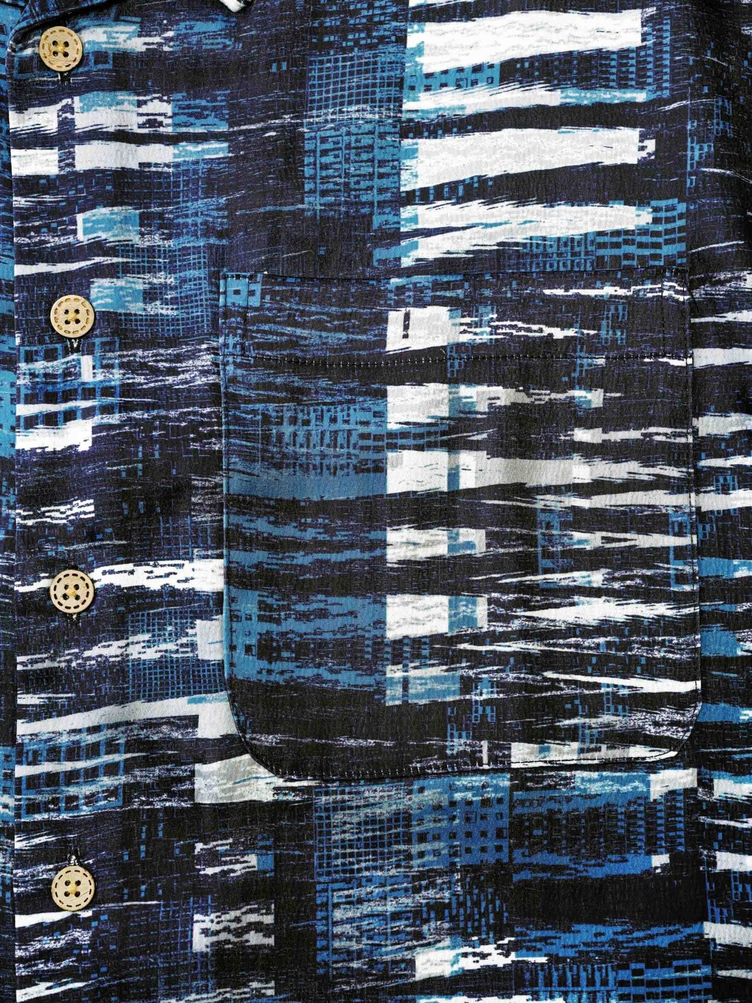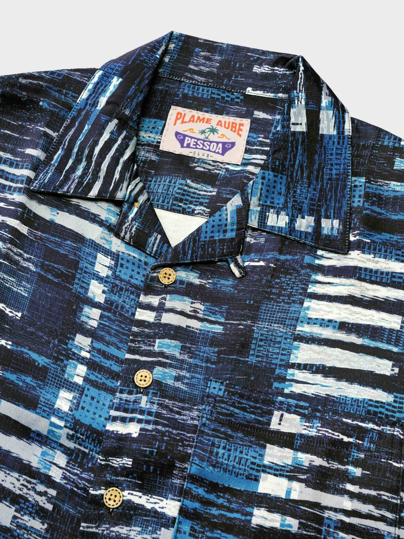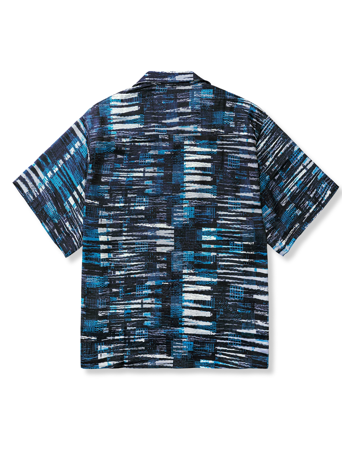 ブルーの色ブロックで構成された夏のハワイアンシャツは、創造的なデザインの一つで、深いブルー、浅いブルー、白色が不規則な形で組み合わさっています。まるでフィルムのような感じです。現代的なグラフィック要素とハワイの伝統的な要素を融合させ、ユニークなファッション性を演出しています。