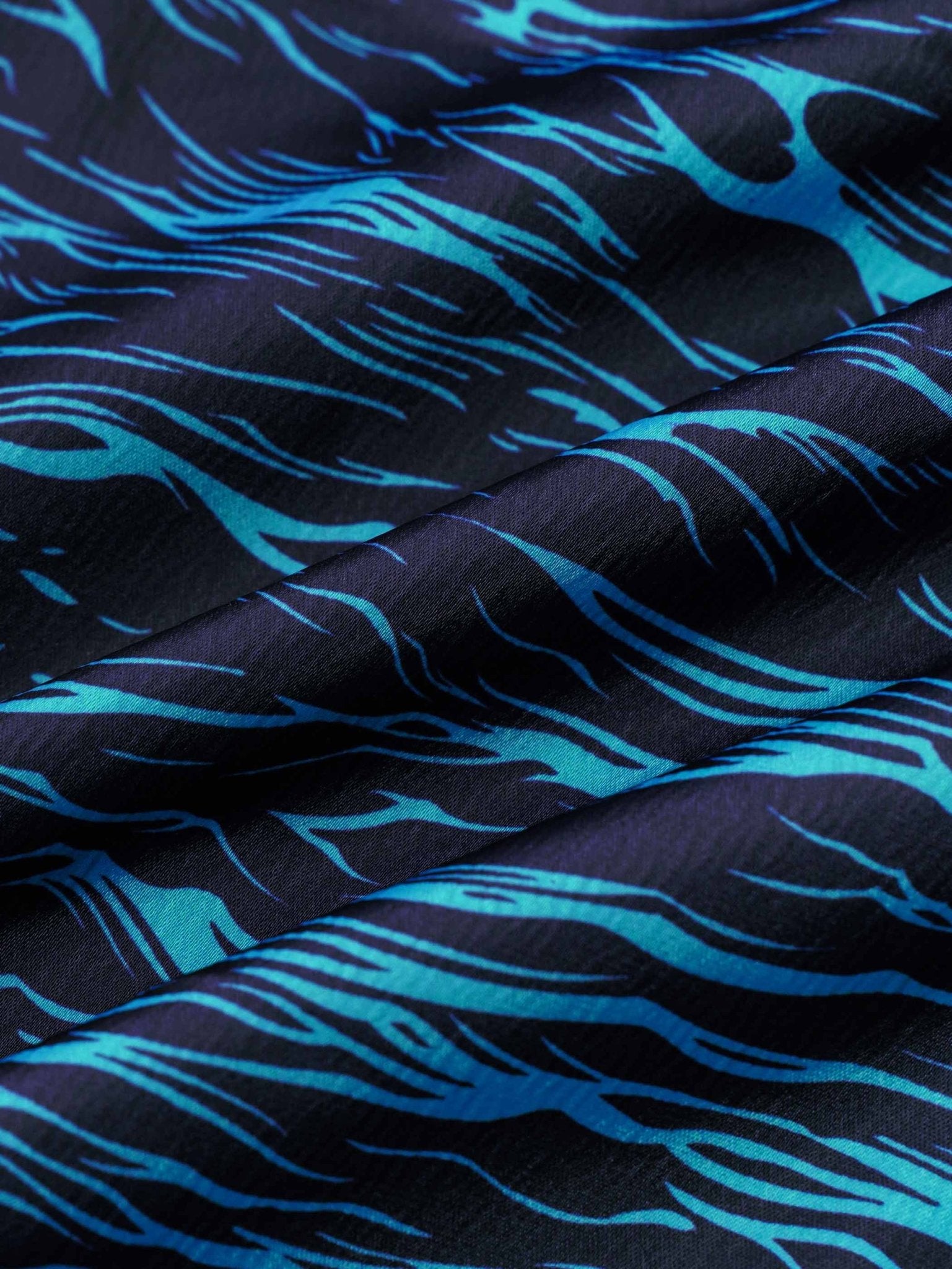 ポリエステル100%の素材は、耐摩耗性、抗シワ性などの利点があります。同時に、生地の通気性と快適性も非常に優れています。微細な肌触りのデザインで、シャツの手触りと品質感を高めます。全体的なブルーの波柄デザインで、シャツをよりファッショナブルかつ個性的にします。