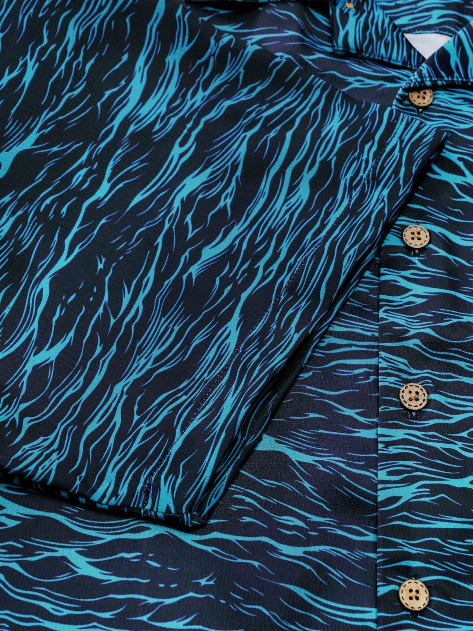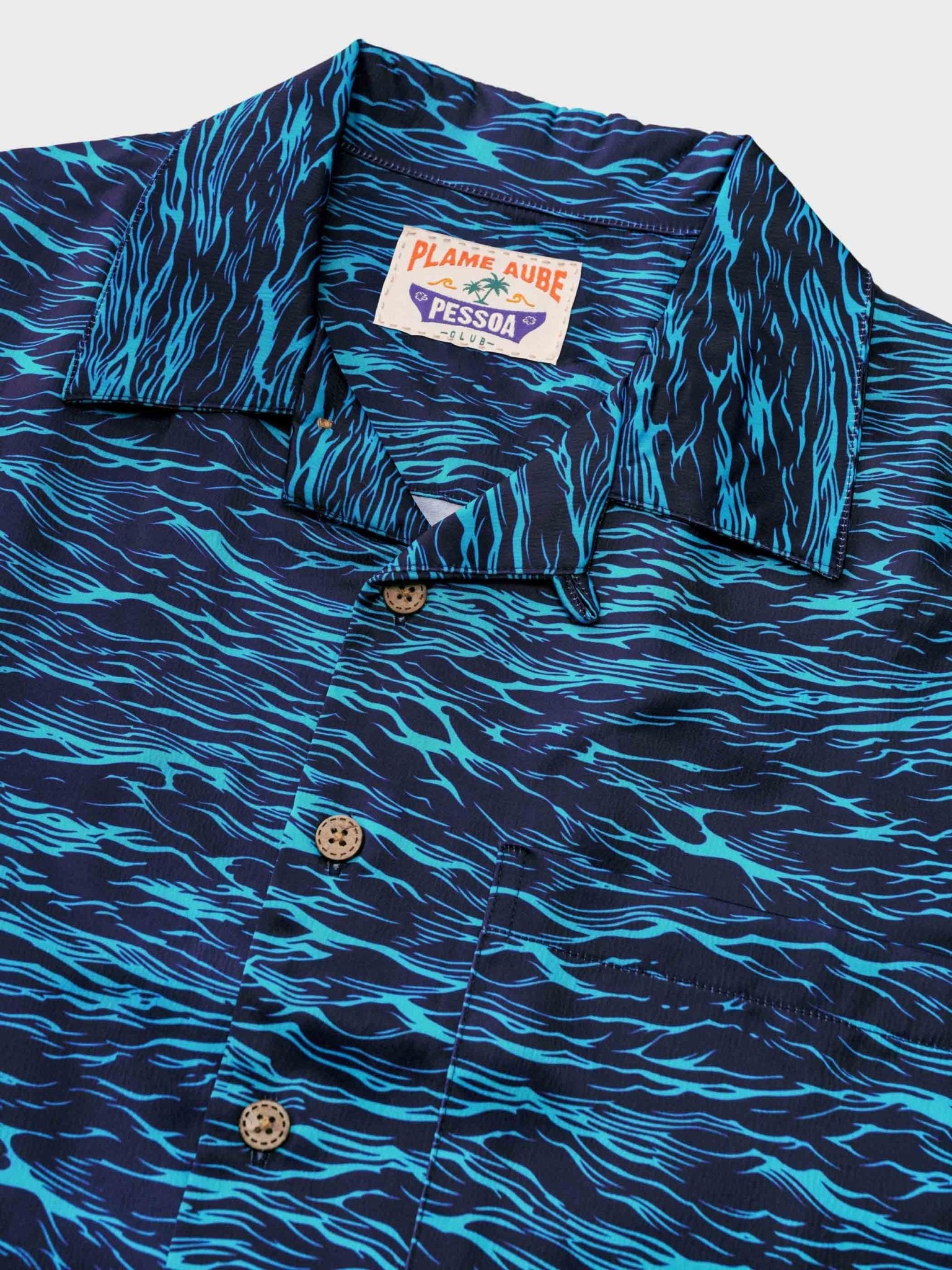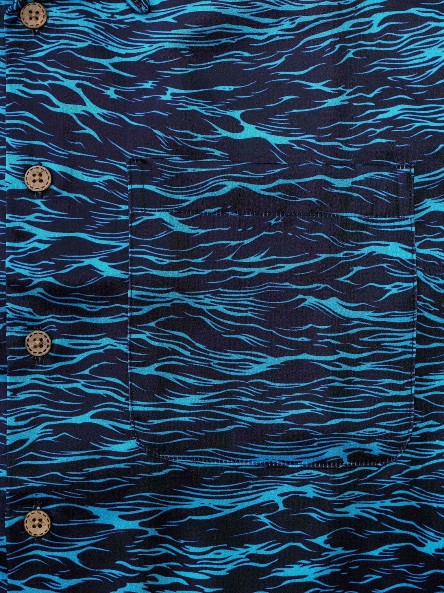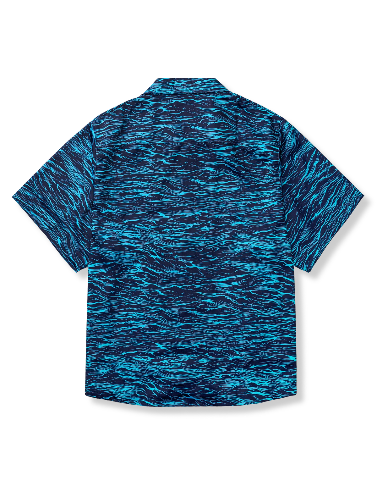 ブルーの波柄ハワイアンシャツは海の波をインスピレーションにし、全体的なデザインは清新で自然な感じを演出しています。深い青色をベースに、浅い青色の波模様が散りばめられ、深海の景色を表現しています。キューバカラーはクラシックな要素を残し、弧を描くように下がるデザインで、シャツをより快適で自然なものにします。