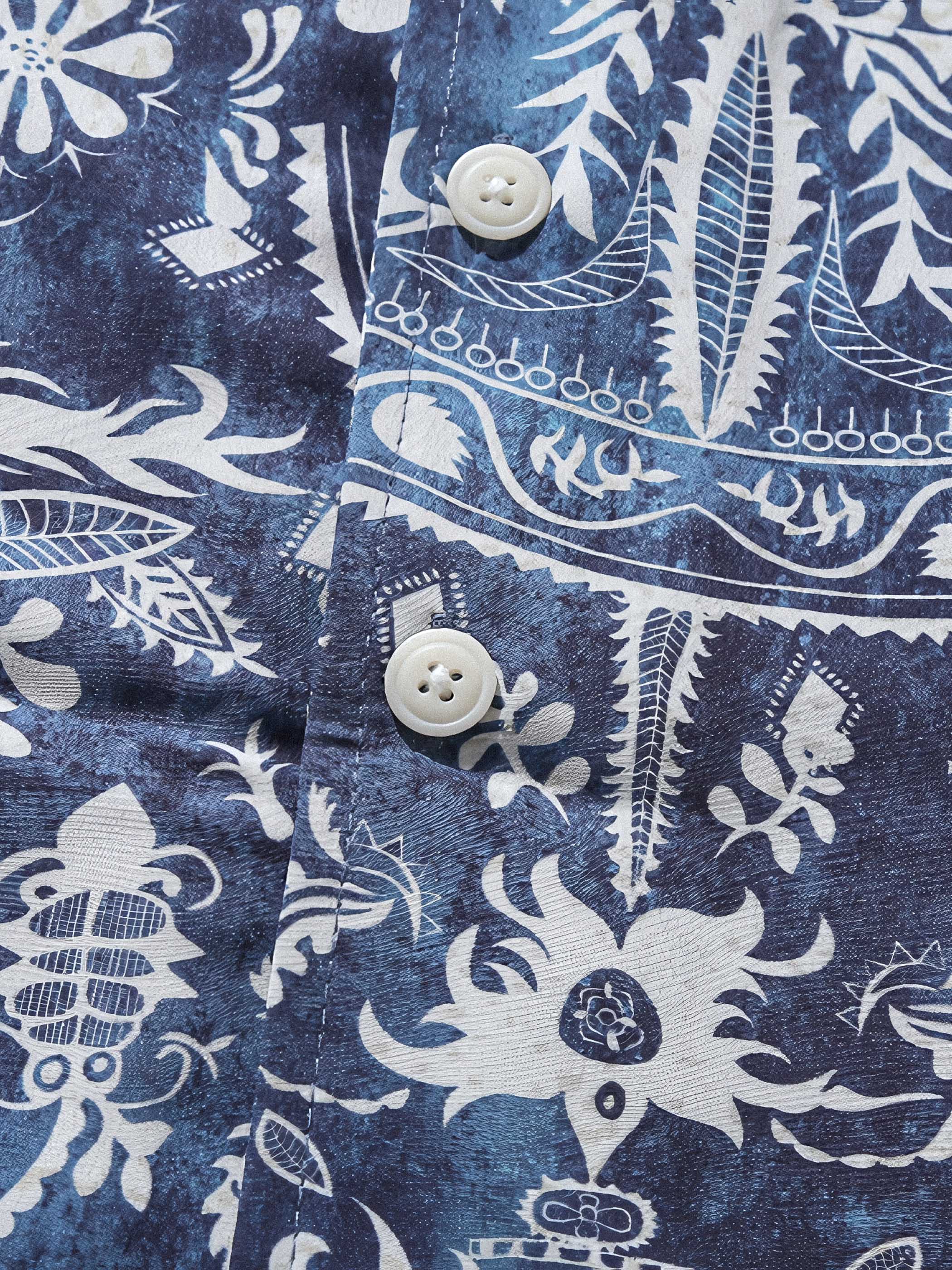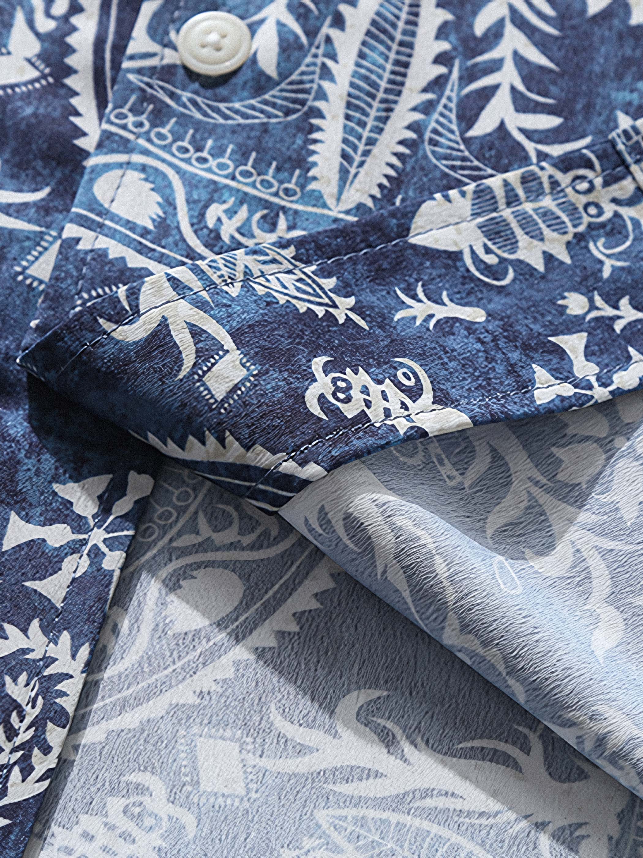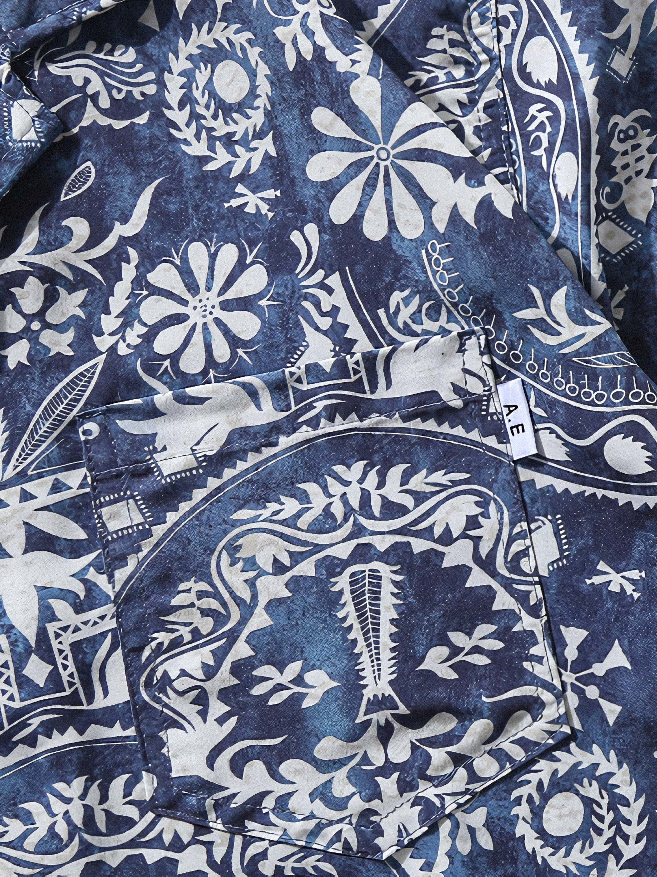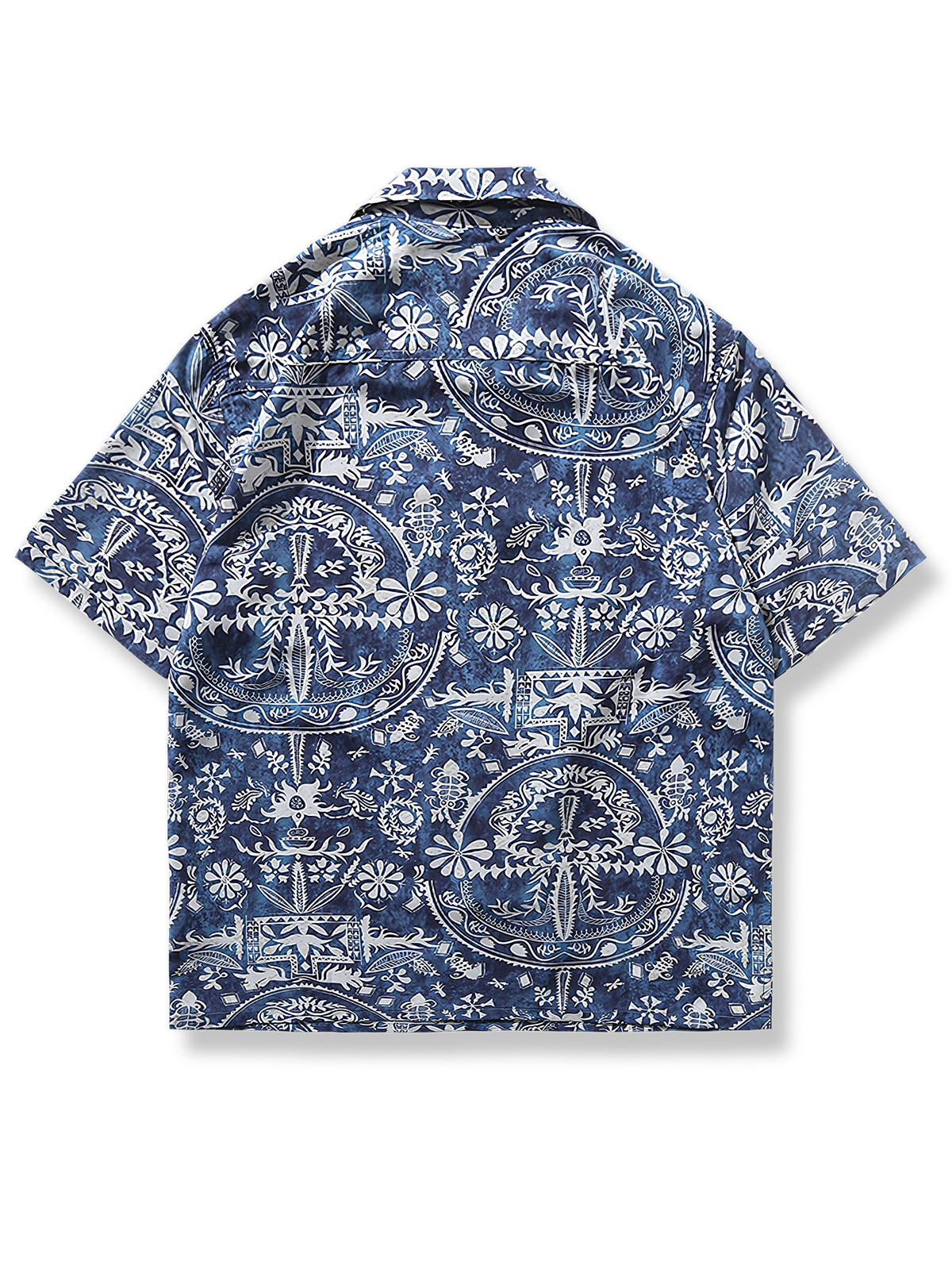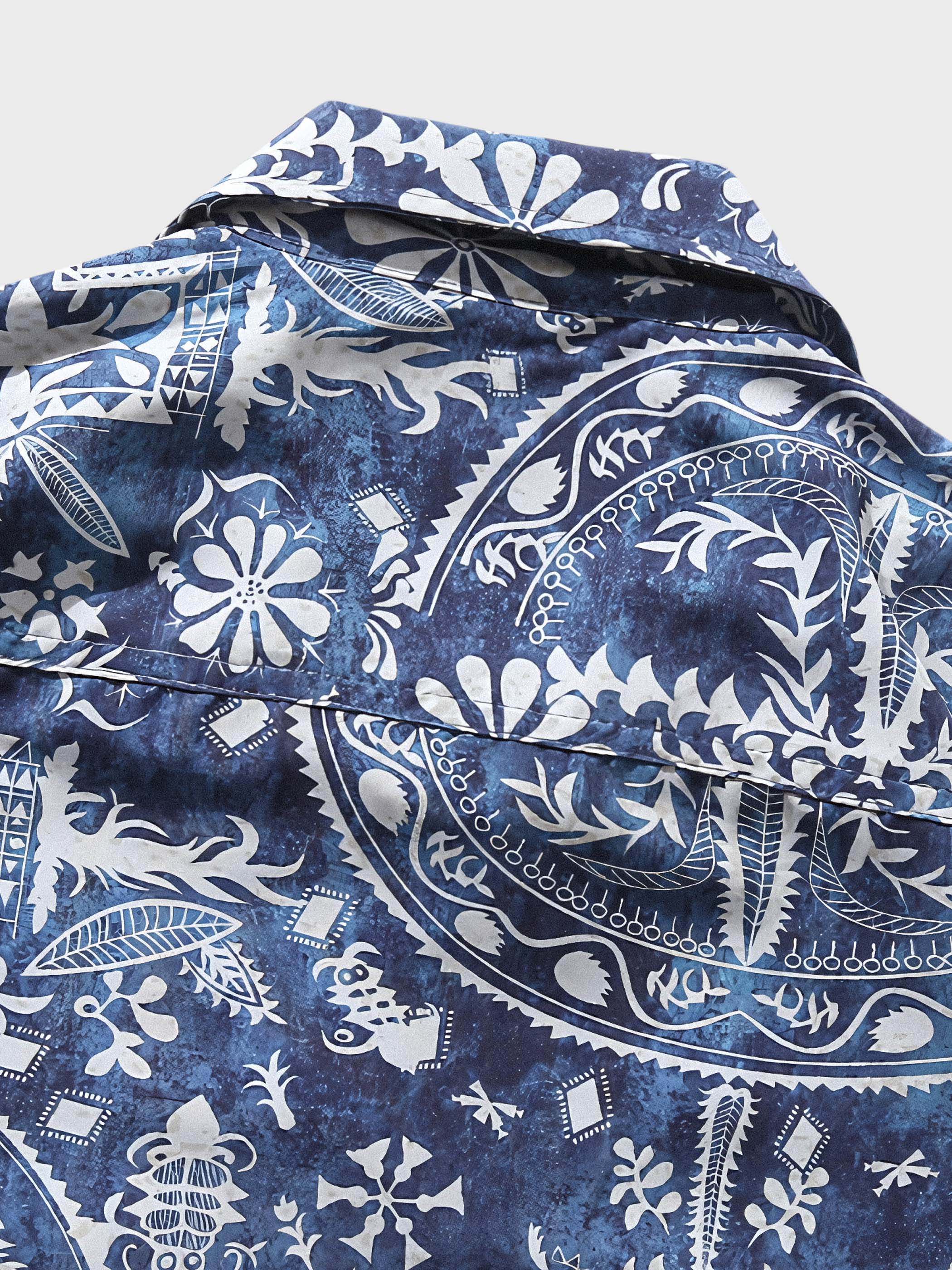 シャツのディテールは繊細さと品質を引き立てています。青いベースカラーの濃淡の違いは、シャツに独特の特徴と立体感をもたらしています。エスニックな柄のデザインは明確で鮮明であり、卓越した工芸と芸術的な価値を示しています。繊細なステッチとボタンはシャツの風合いとファッション性を高めます。これらのすべてのディテールが独特で洗練されたシャツスタイルを演出しています。