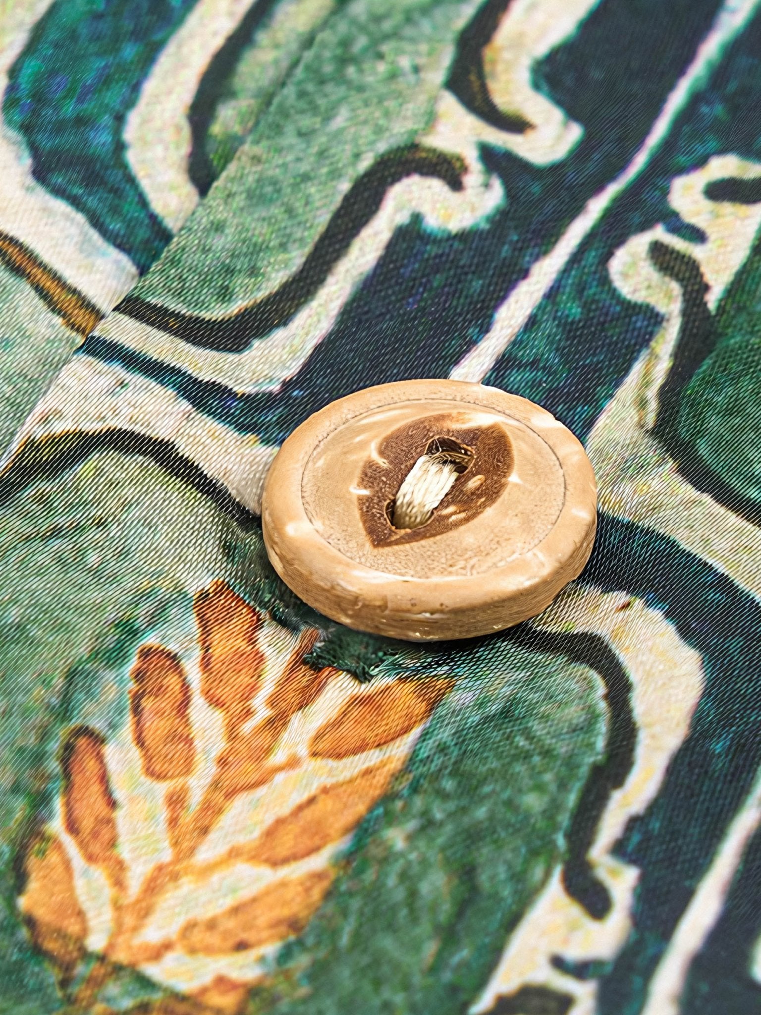 ココナッツボタンをフロントに使用し、リゾート感あるアクセントを加えています。また、胸元にはポケットを装備し、必要な小物を収納できる機能性も備えています。