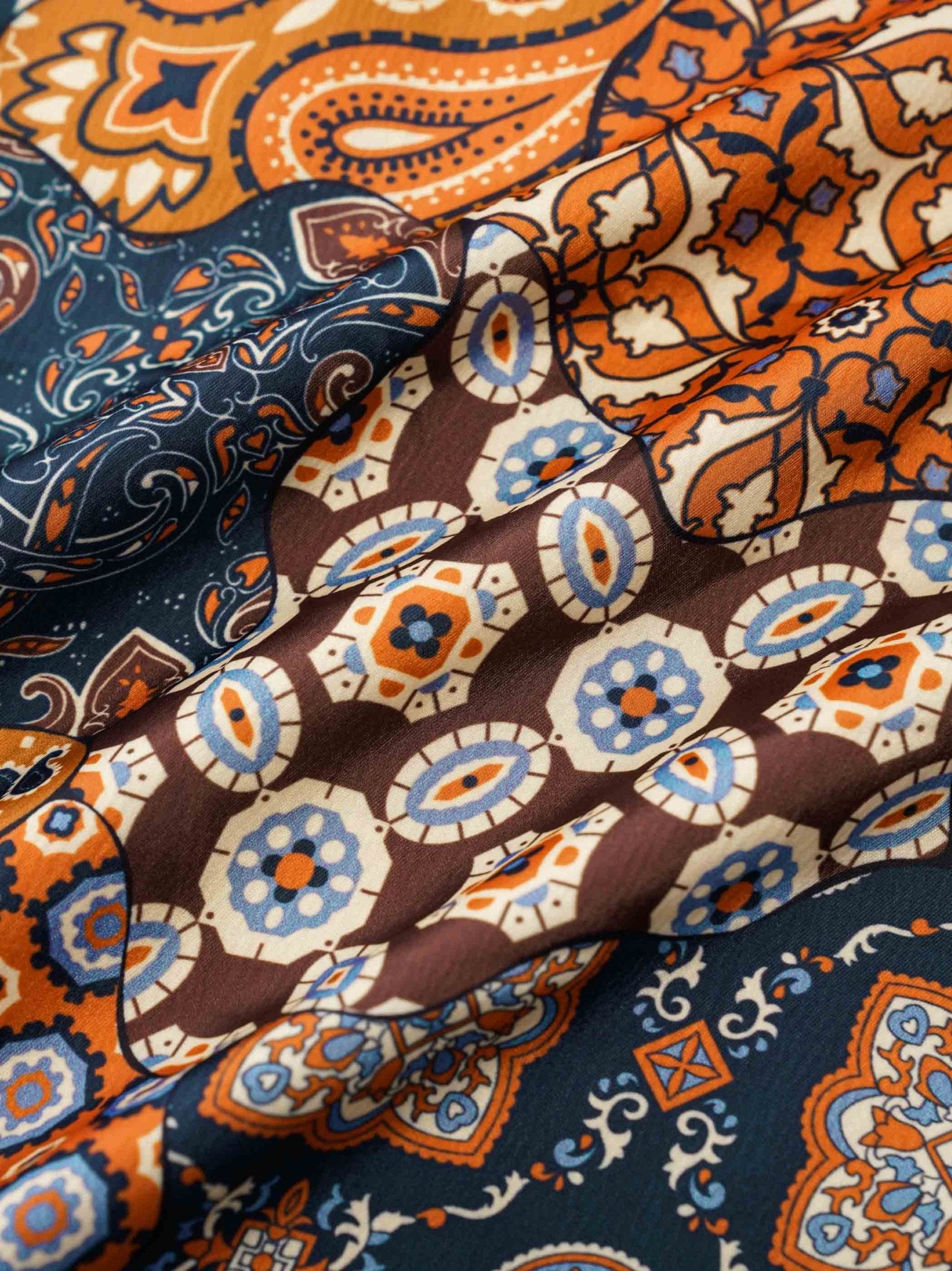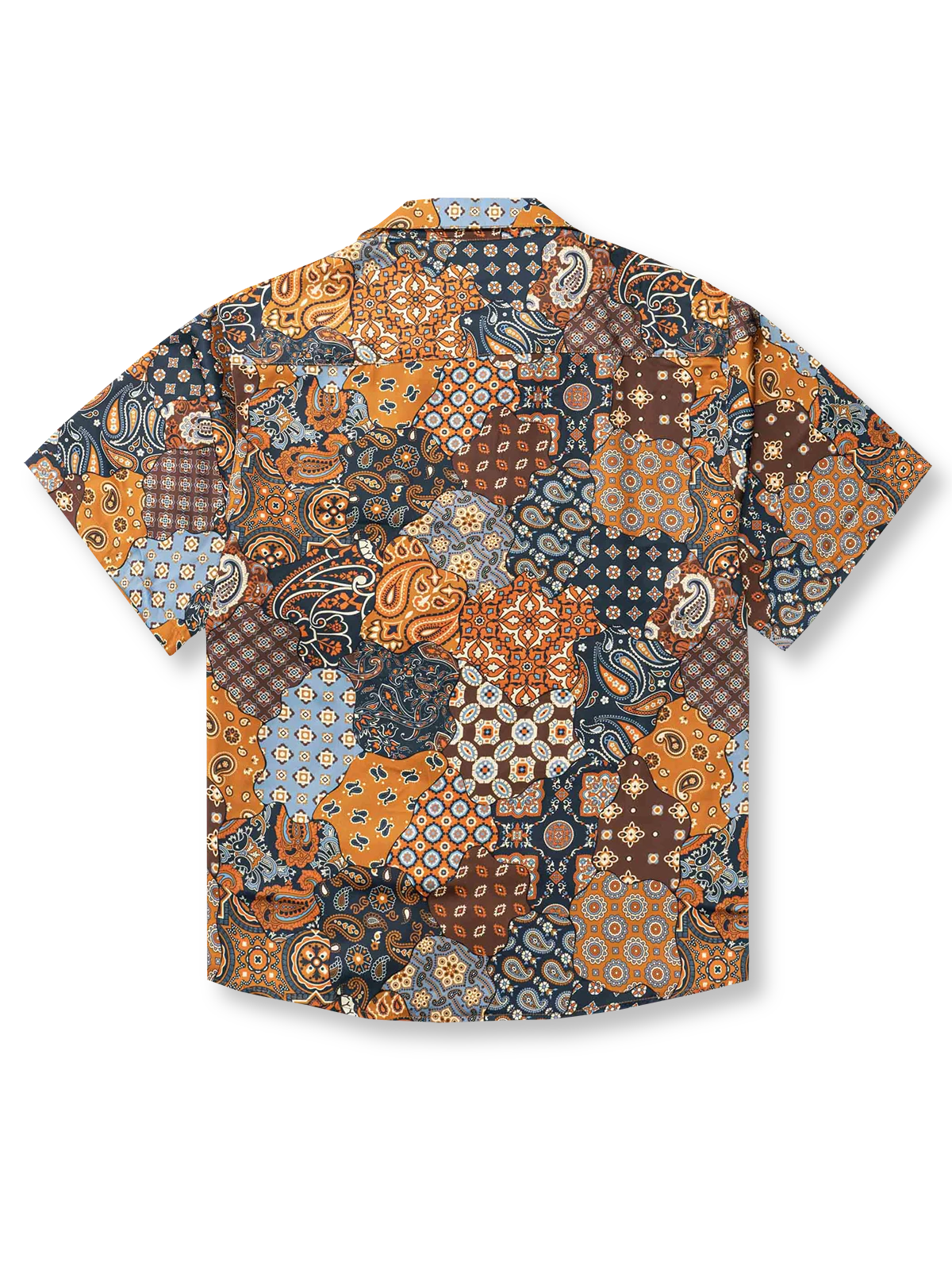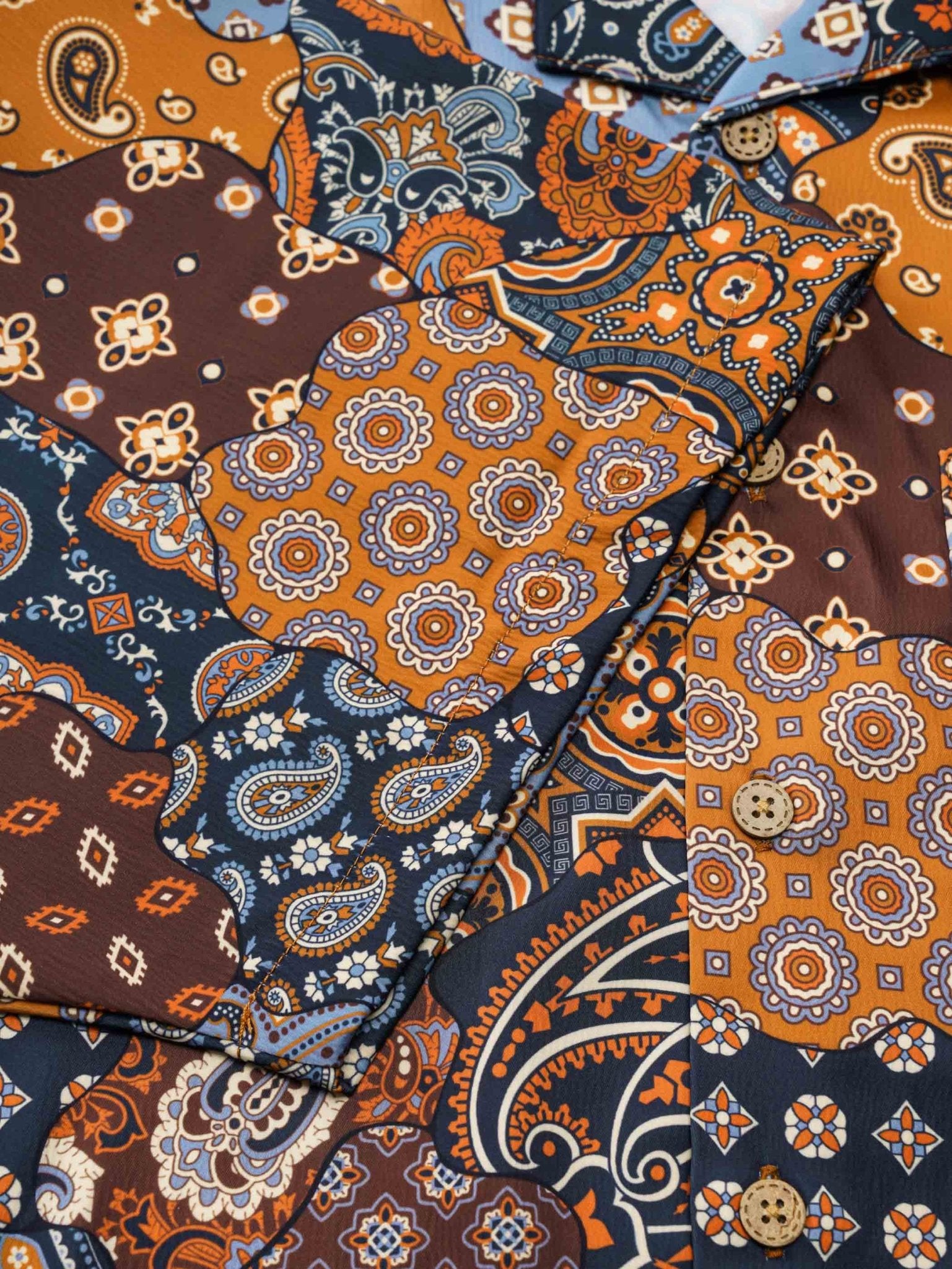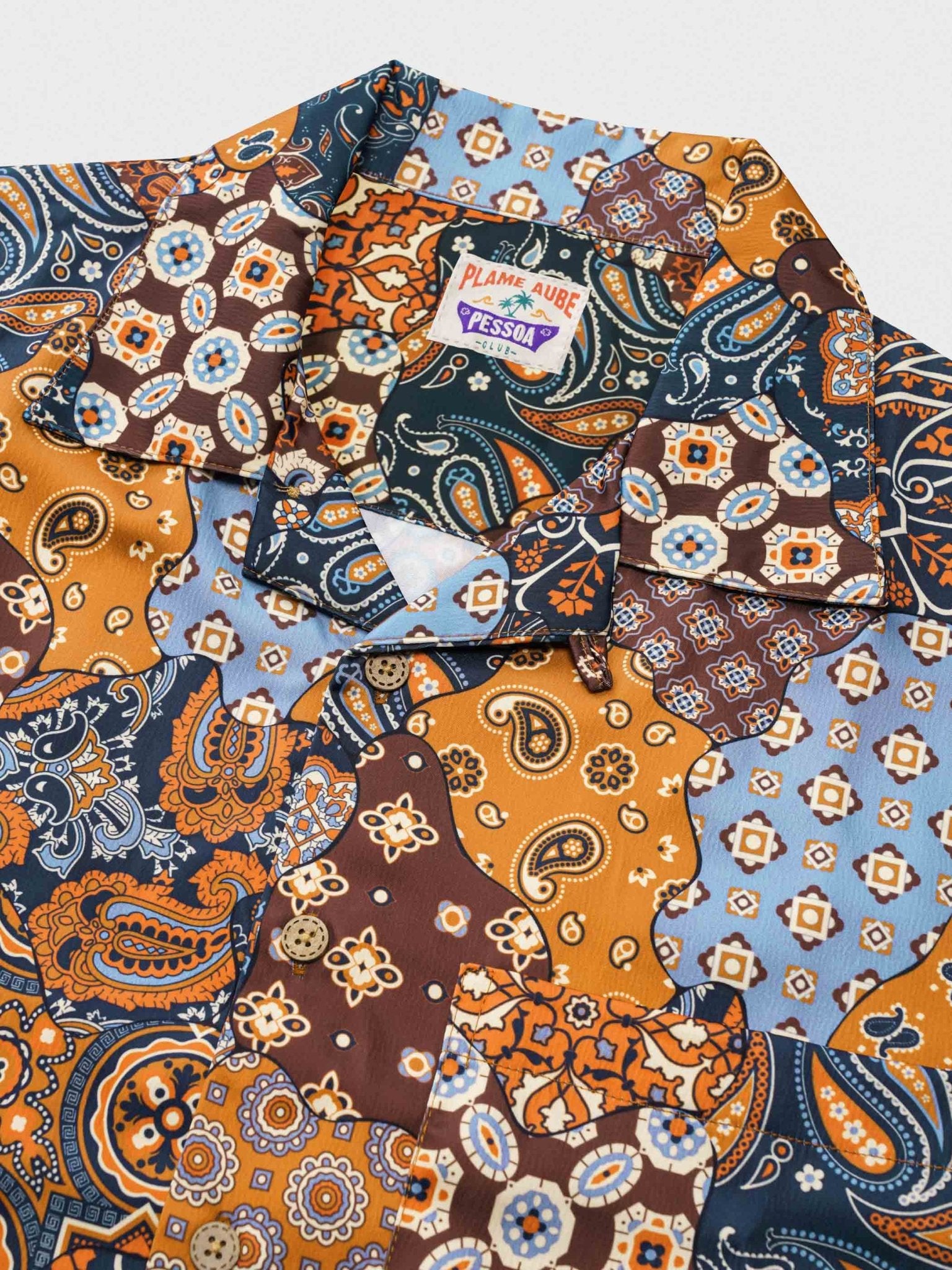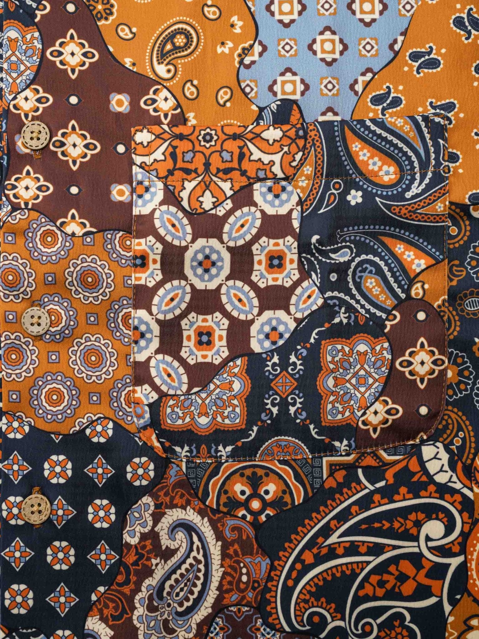 主色としてブラウンを使用し、鮮やかなオレンジ色と深浅異なる茶色のパッチワークに加え、カシューナッツの花柄をプラスし、熱帯情緒に満ちたシャツに仕上がっています。細部にわたるデザインにより、とてもファッショナブルで楽しい印象を与えます。