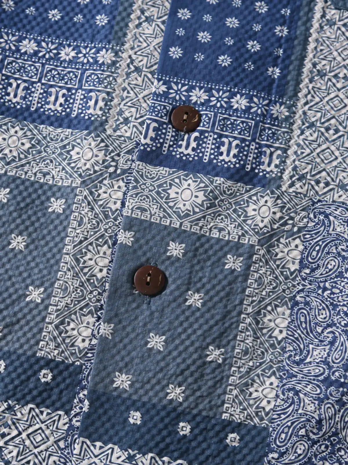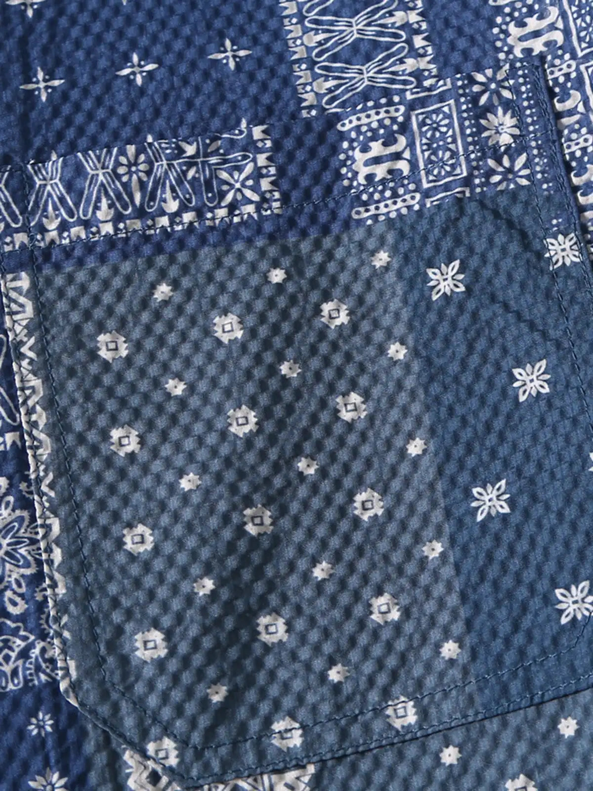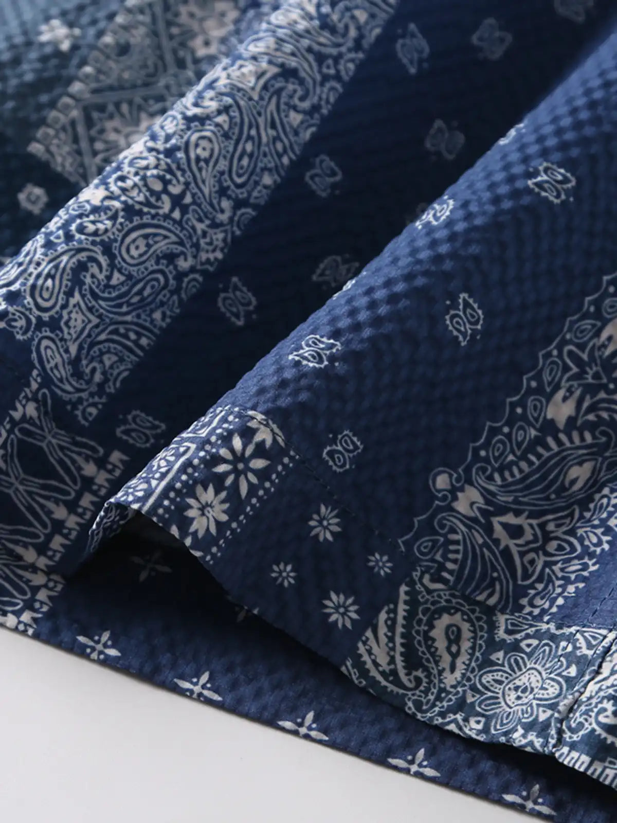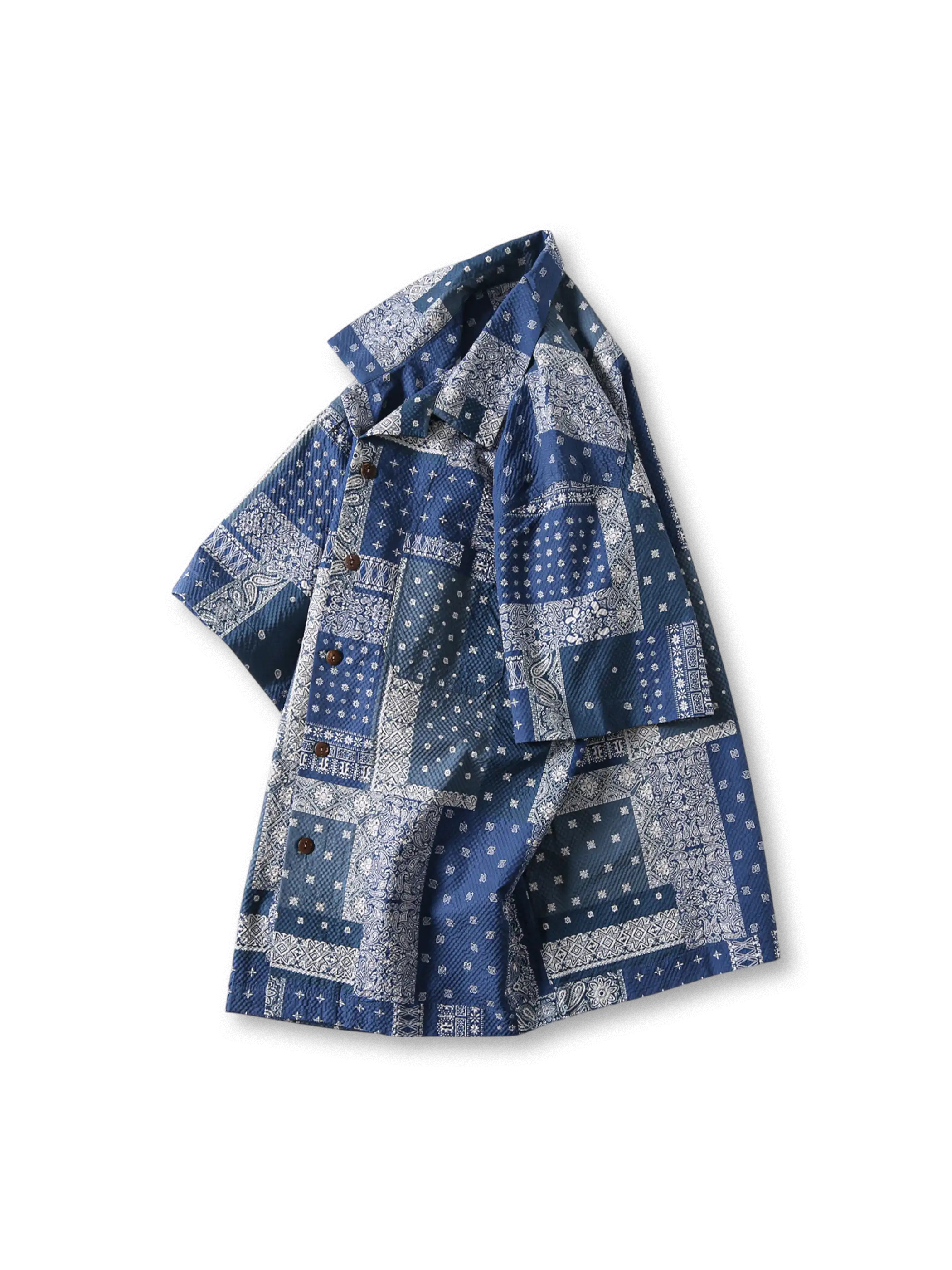 アメリカ西海岸のトラッカーカルチャーにルーツを持つバンダナ柄をポリエステル100%の軽やかなシアサッカーにプリントし、手作業でパッチをつなぎ合わせたような立体感を演出。オープンカラーと深めのサイドスリットでリゾートから都会のストリートまで一枚でサマになるデザイン。バイヤスカットの袖と裾が動きに合わせて自然な揺れを生み、バンダナ文化が放つ自由と冒険心を日常シーンに取り入れた一着。
