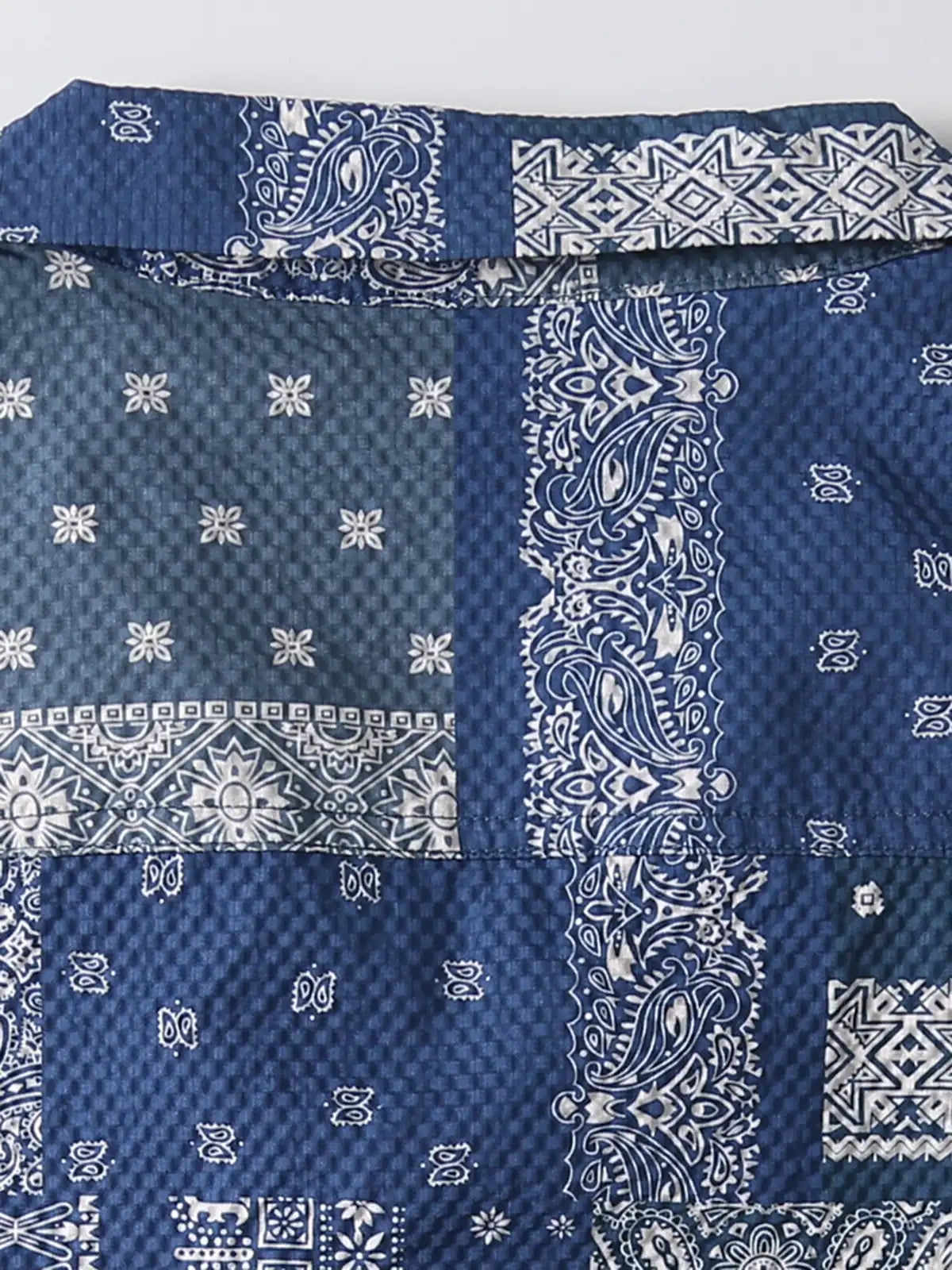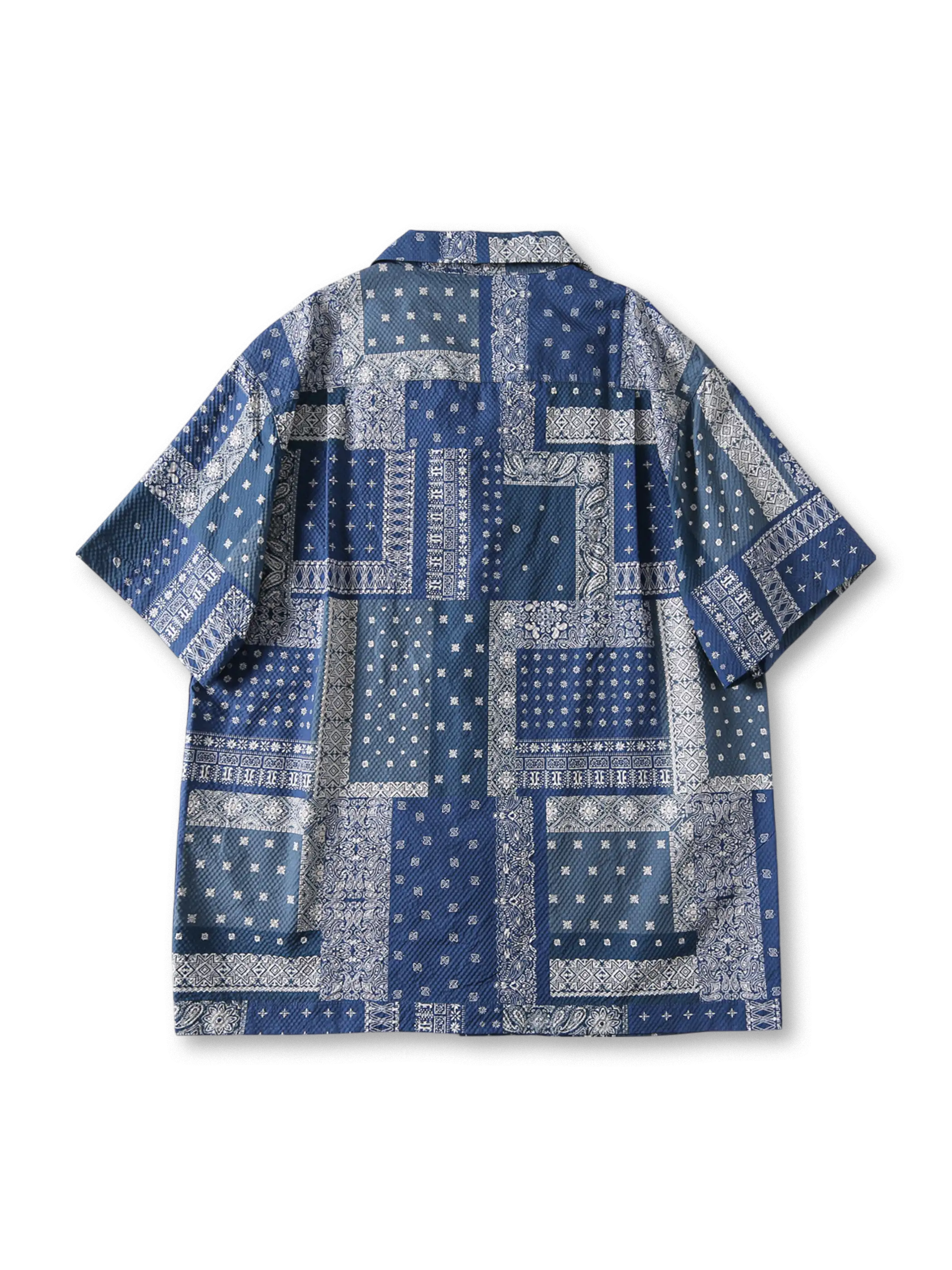 多彩なバンダナ柄を手作業風に組み合わせた、夏のヴィンテージ感あふれるオープンカラーシャツ。